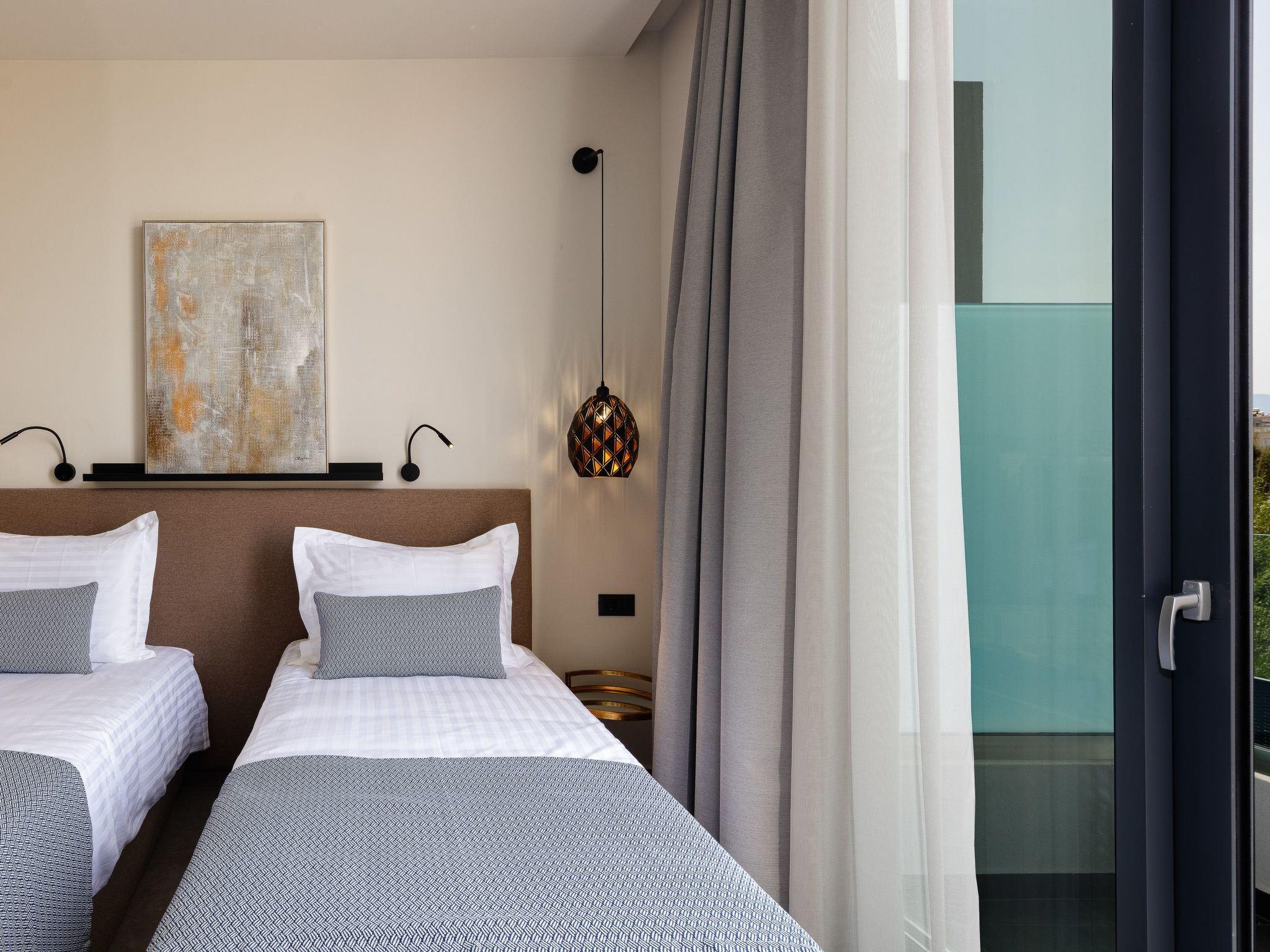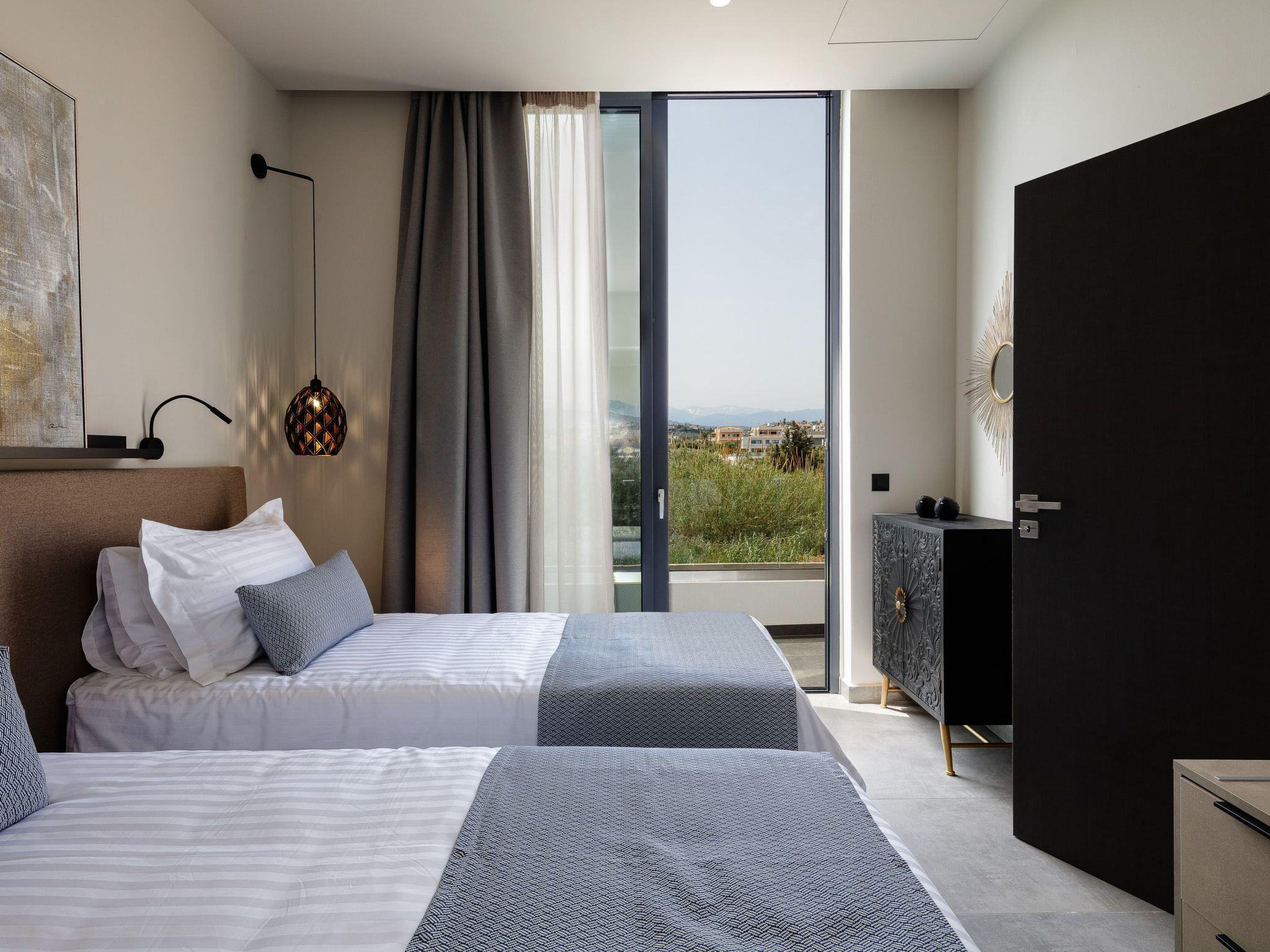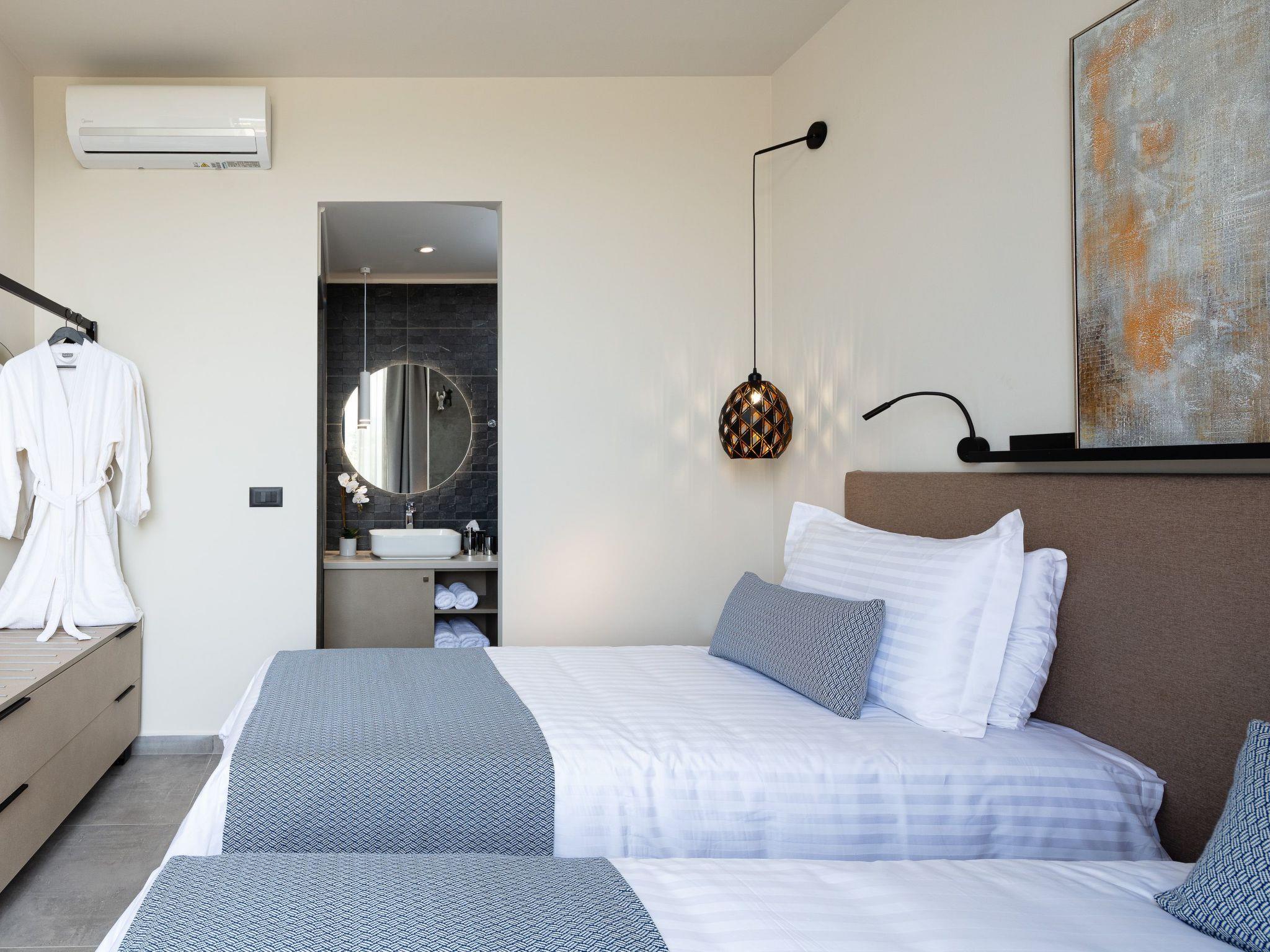 Bedroom 2: Twin beds (0.90*2.00) with Coco-Mat mattress and mattress topper (can be converted into a king-size bed 1.80 x 2.00 m upon request), ensuite split bathroom with shower and separate toilet area, A/C, 32’’ Smart TV, open closet, luggage shelf, and private balcony