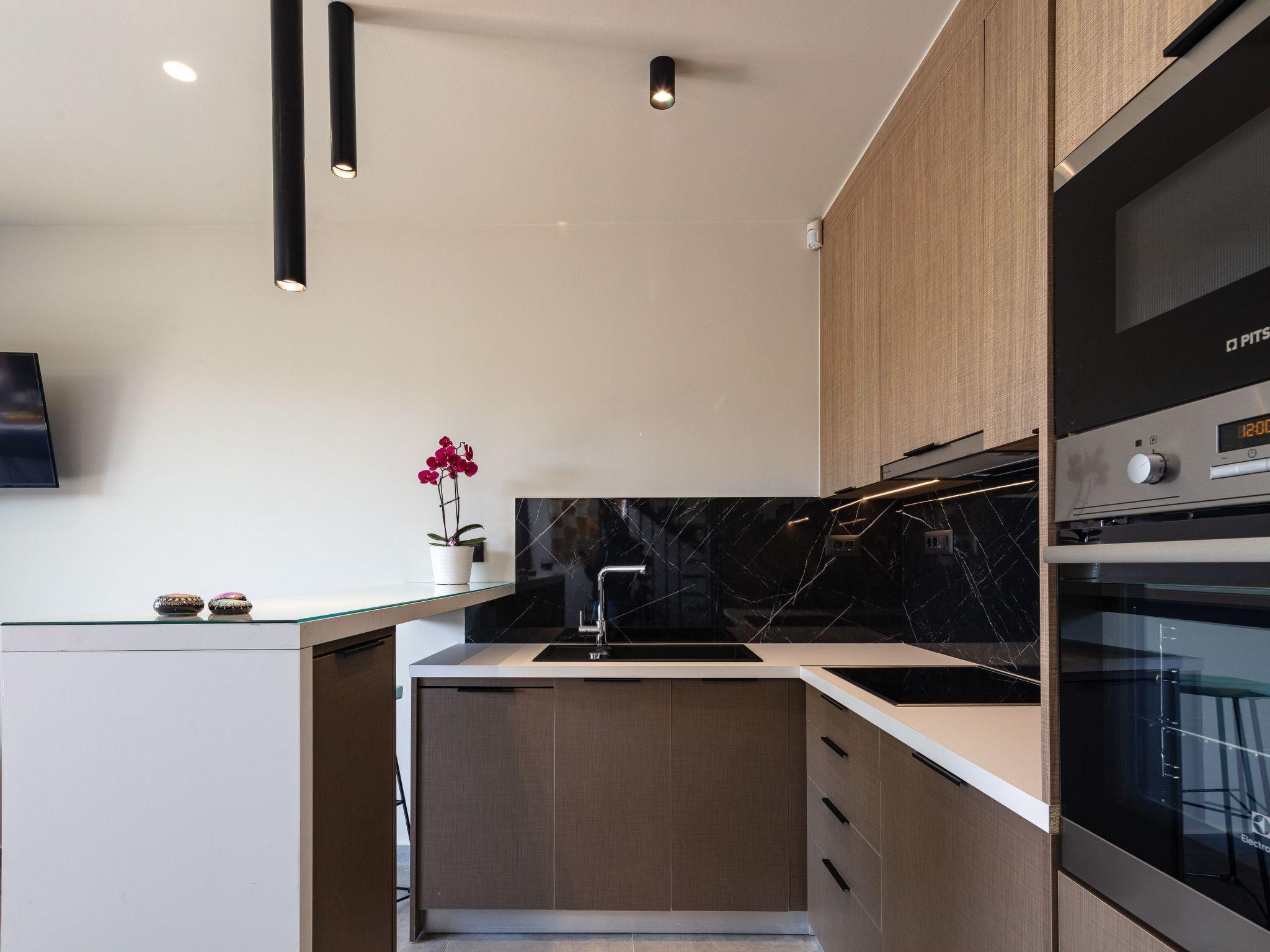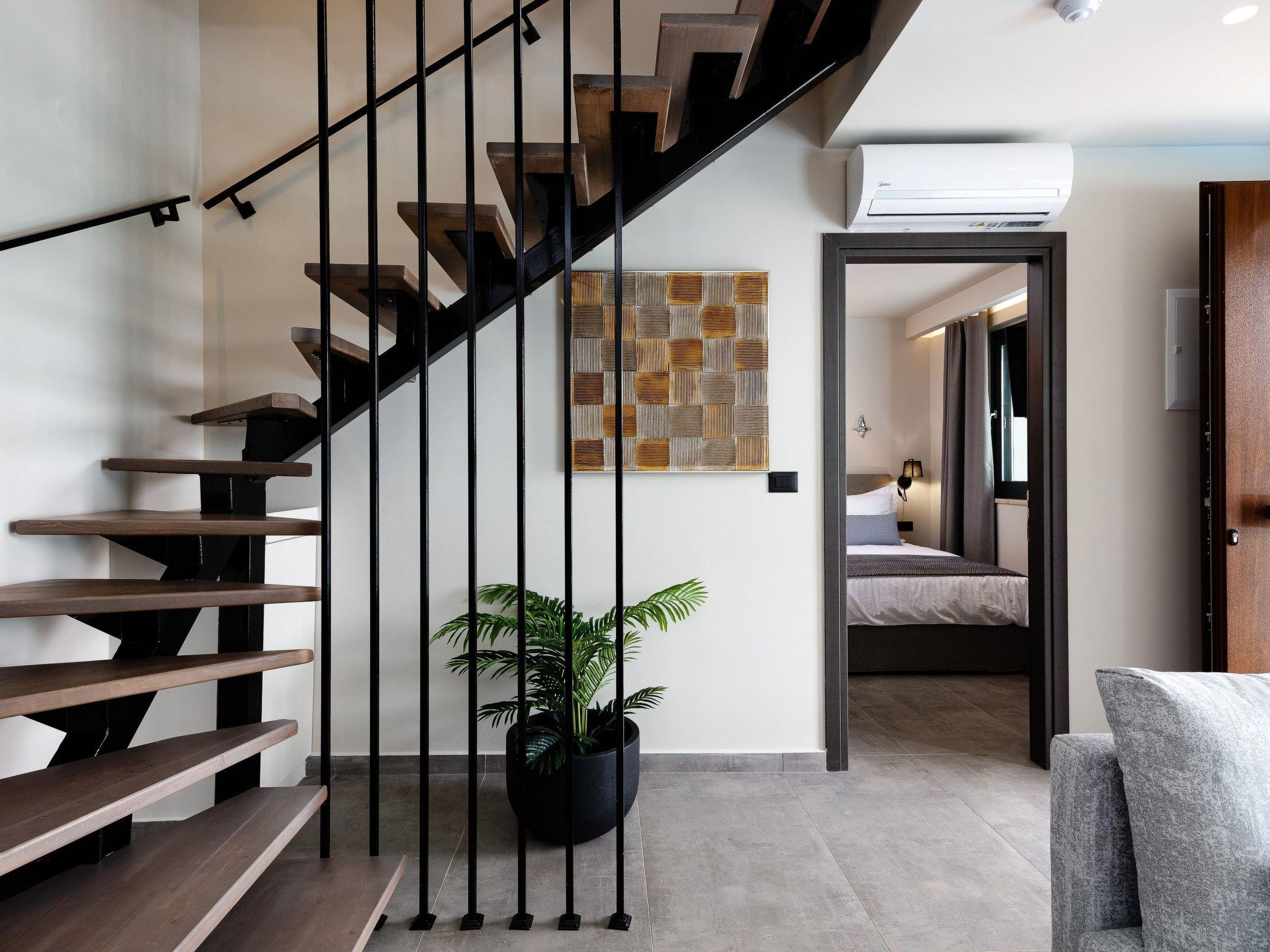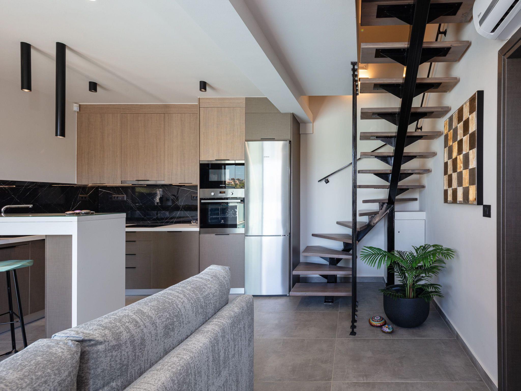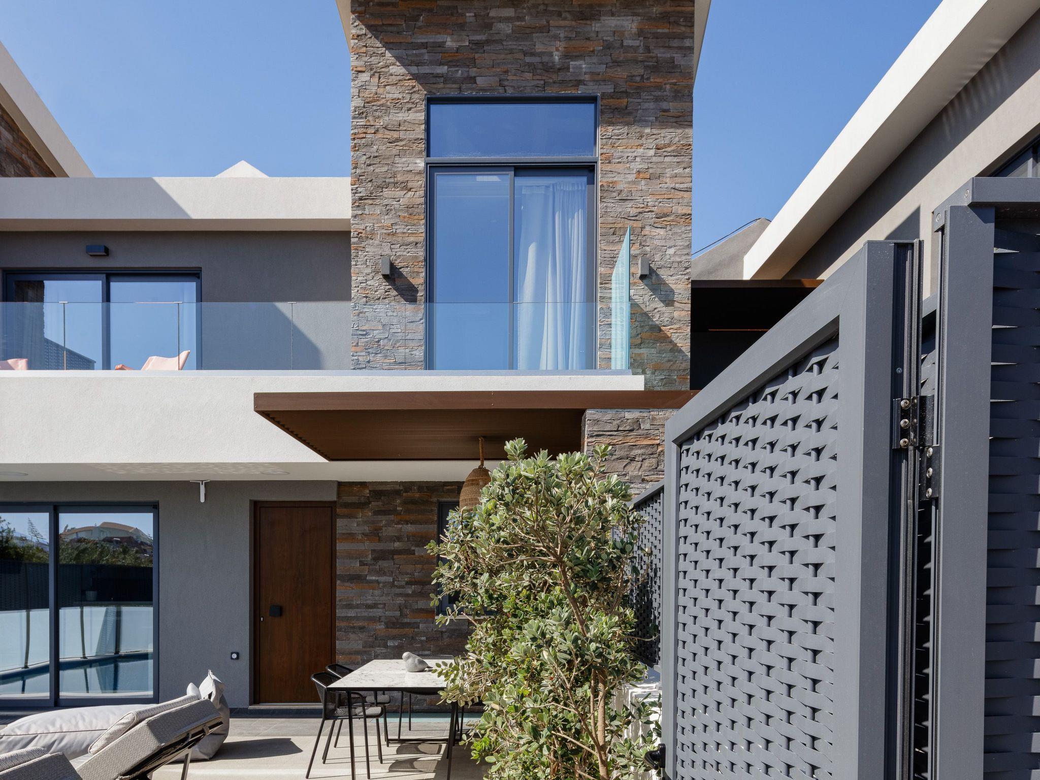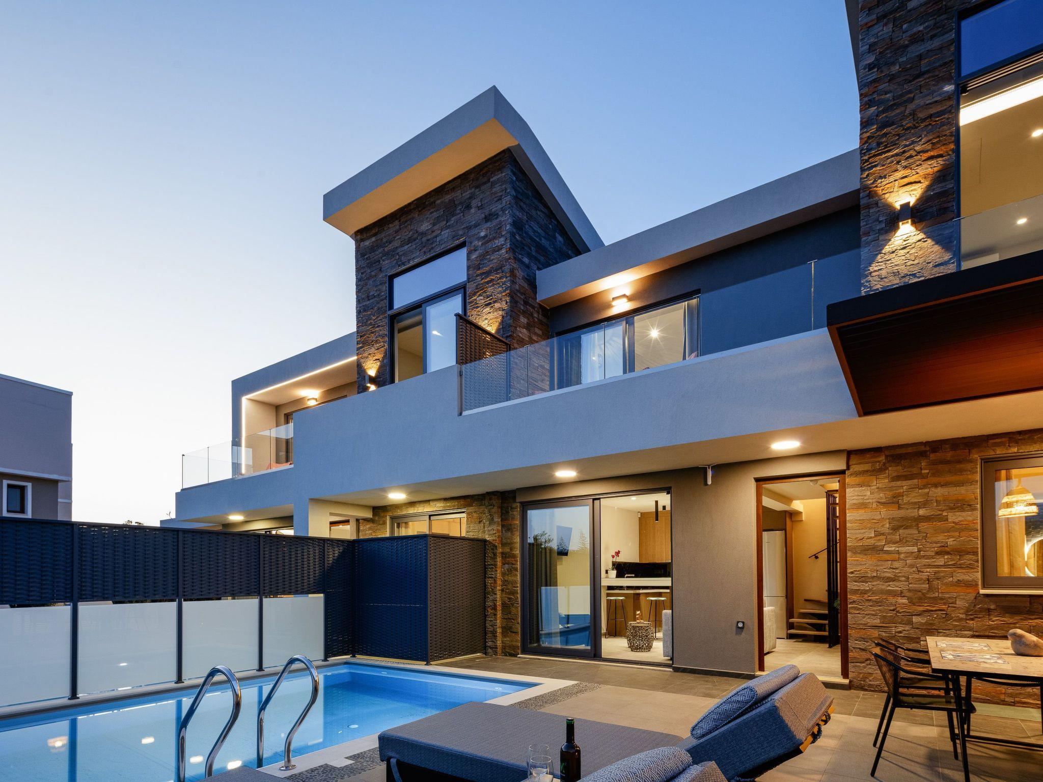 Spanning 75 sqm across two levels, VillAgioi Villa II can comfortably accommodate up to 5 guests. The ground floor features a bright open-plan living area with modern minimalist décor, a cosy seating corner, Smart TV, and wide sliding doors that connect seamlessly to the private pool area. The fully equipped kitchen includes stainless steel appliances and a convenient breakfast bar for casual meals.