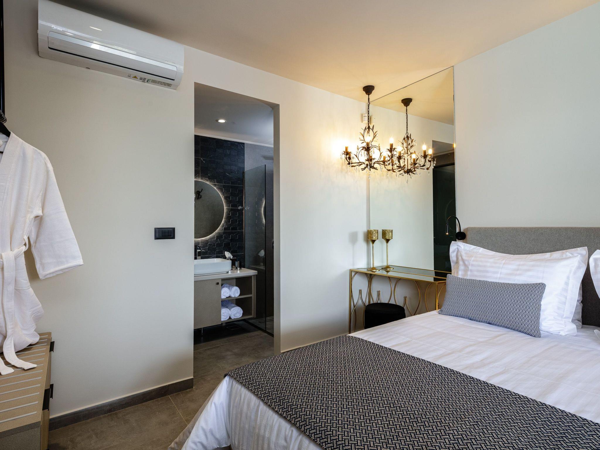 Bedroom 1: King-size bed (1.70 x 2.00 m) with Coco-Mat mattress and mattress topper, ensuite split bathroom with shower cabin and separate toilet area, A/C, 32’’ Smart TV, open closet, and luggage shelf