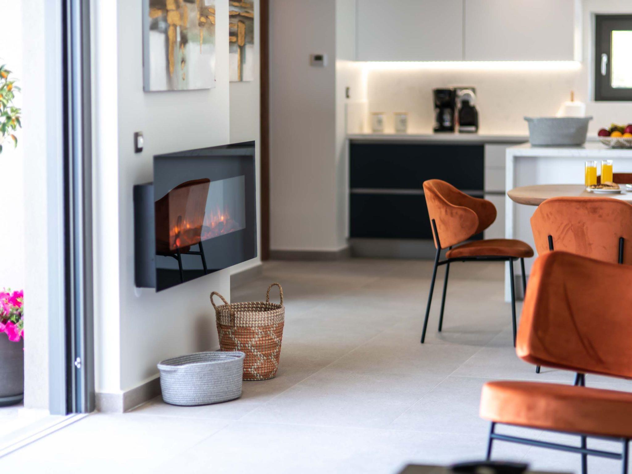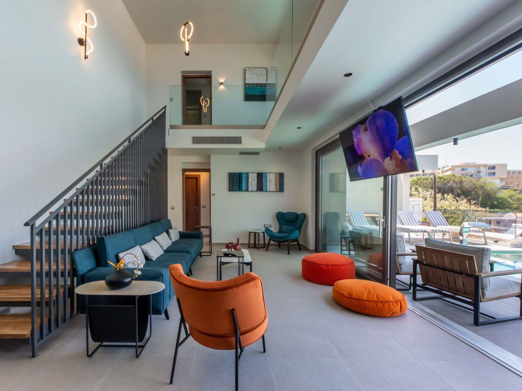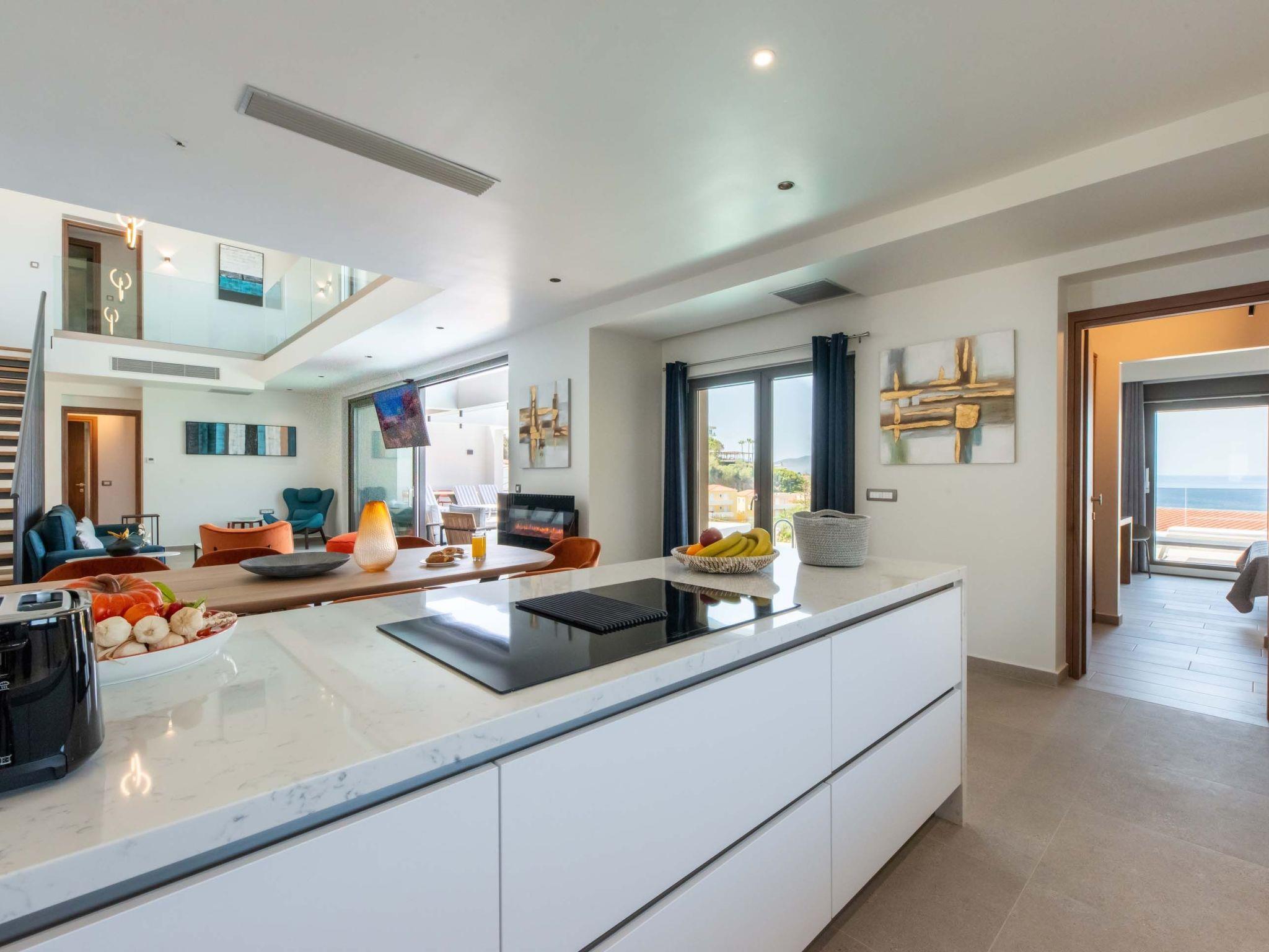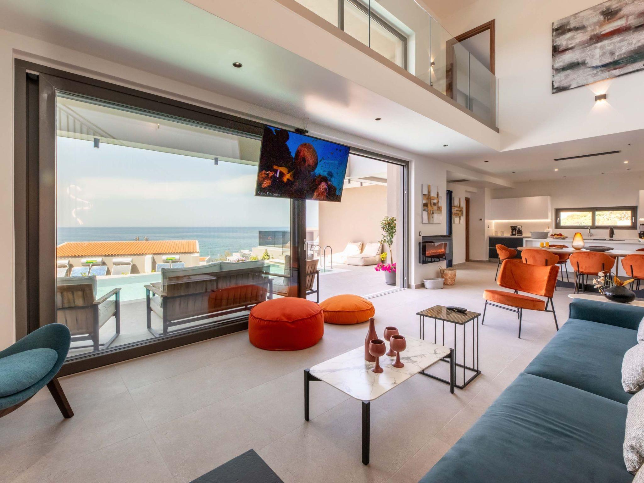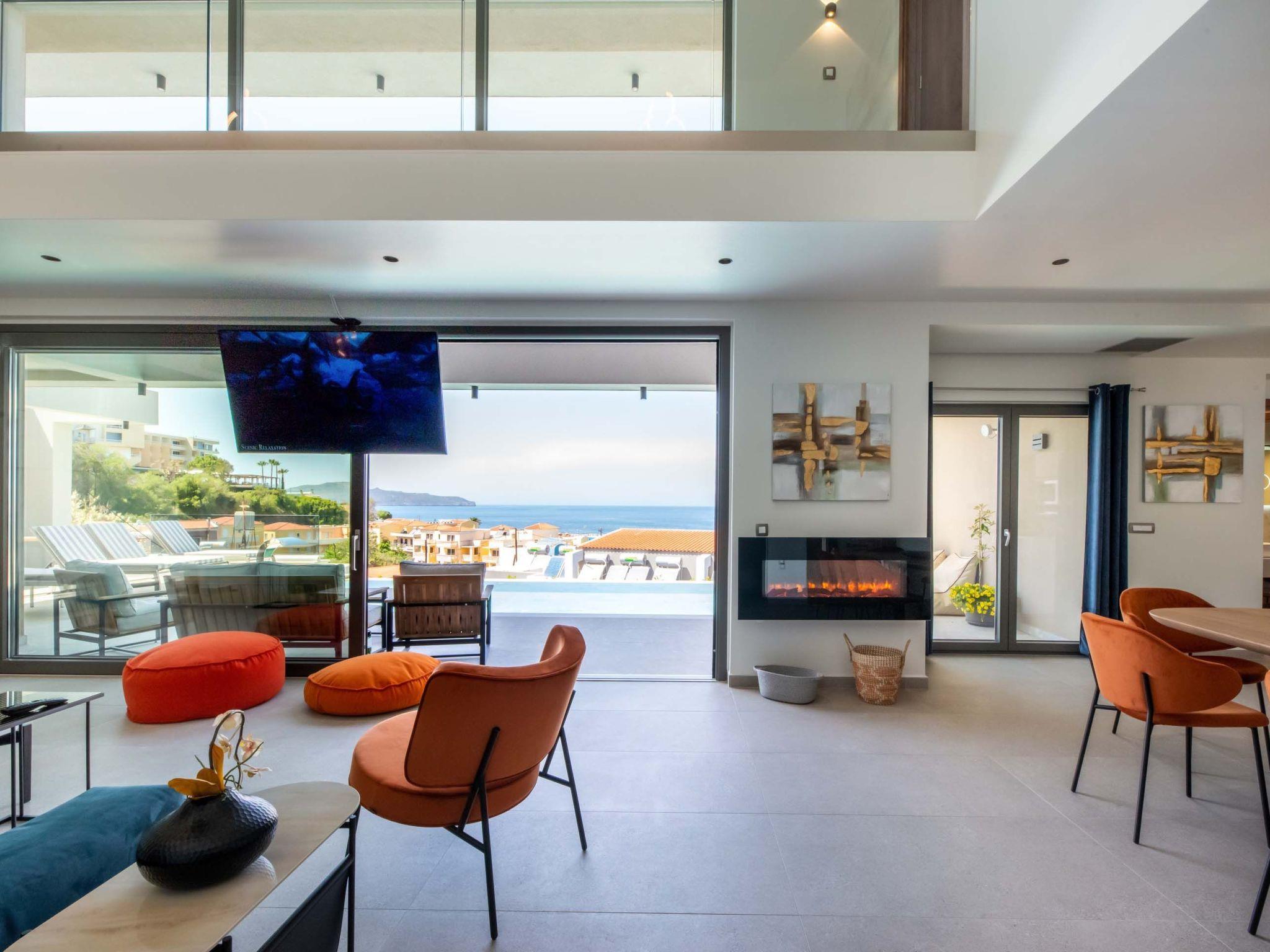 Living area with sofa, 65’’ satellite Smart TV, electric fireplace, access to the pool terrace, sea view