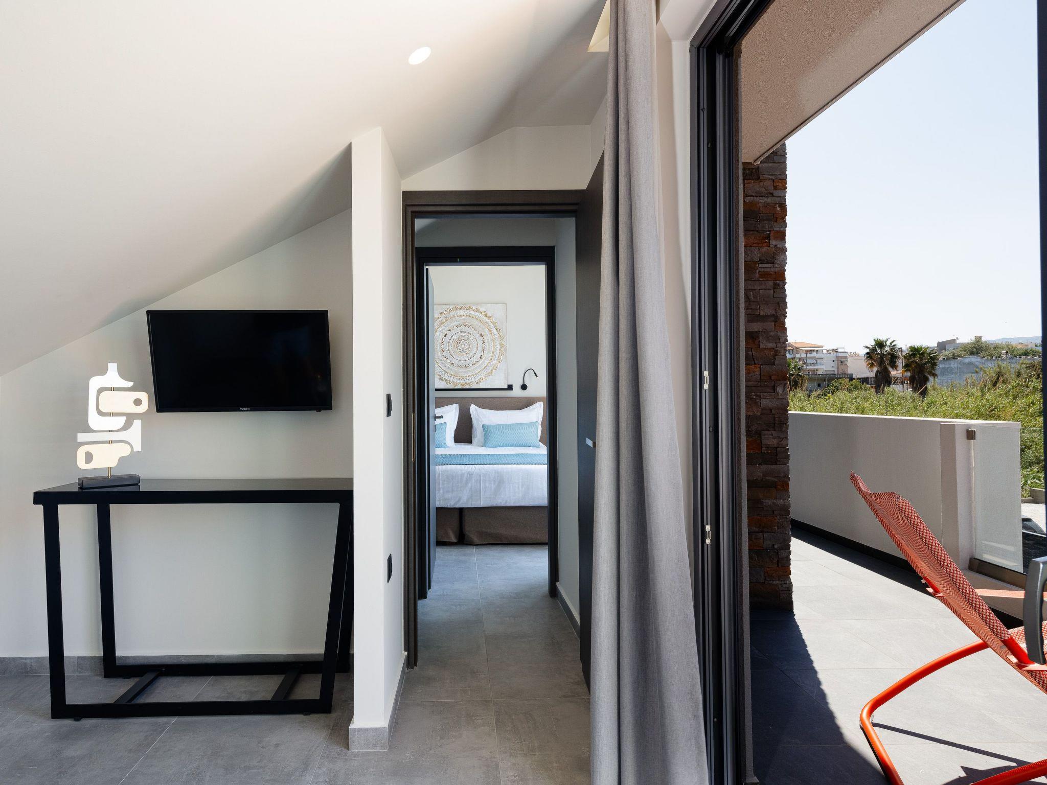An additional room on the same level features a pull-out sofa bed for a fifth guest, complete with Smart TV, wardrobe, and air conditioning, making it ideal for a teenager, child, or extra adult. This sofa bed is provided upon prior request at an additional cost.