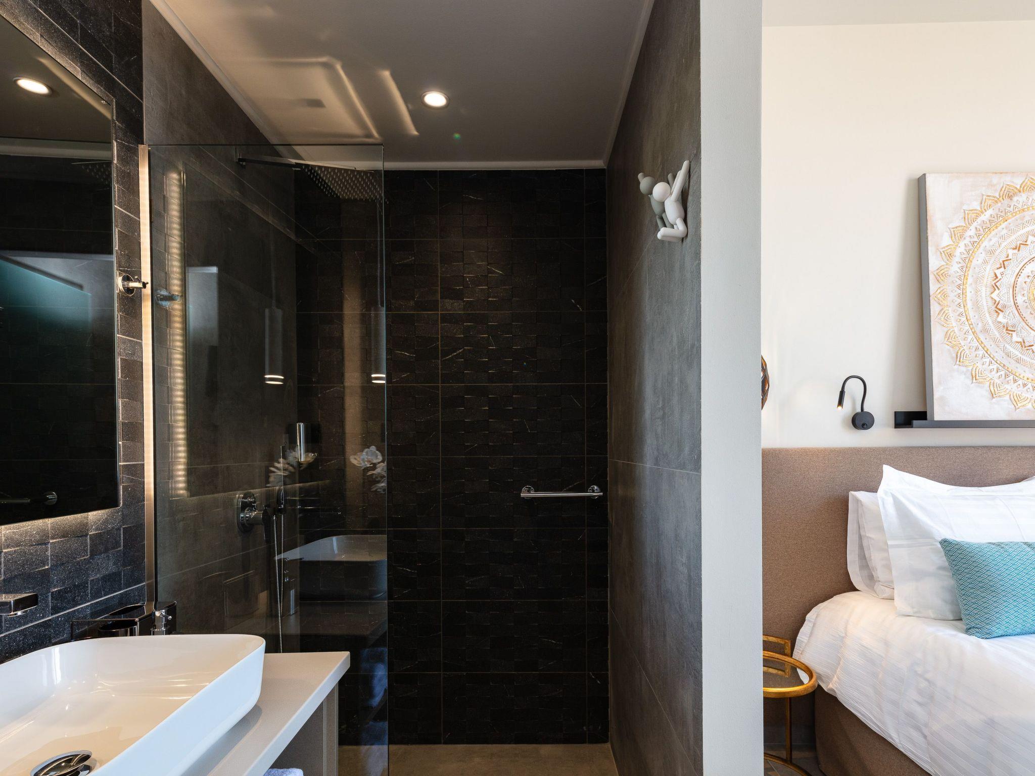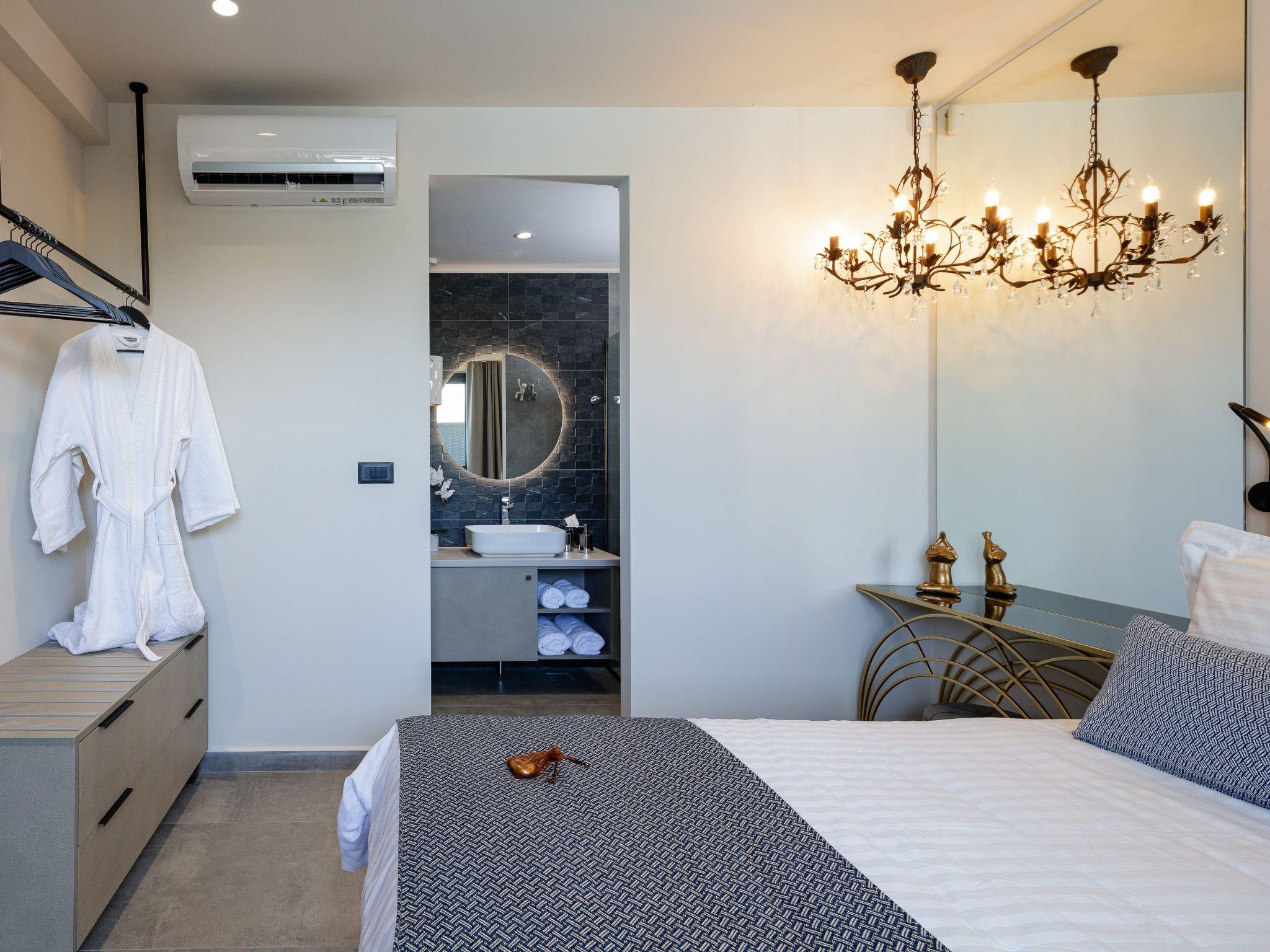 On the ground level, you’ll also find the first bedroom, featuring a Coco-Mat king-size bed that can be converted into two single beds upon prior request. The room also offers a Smart 32” TV, air conditioning, an open wardrobe, and an en-suite split bathroom with a walk-in shower.