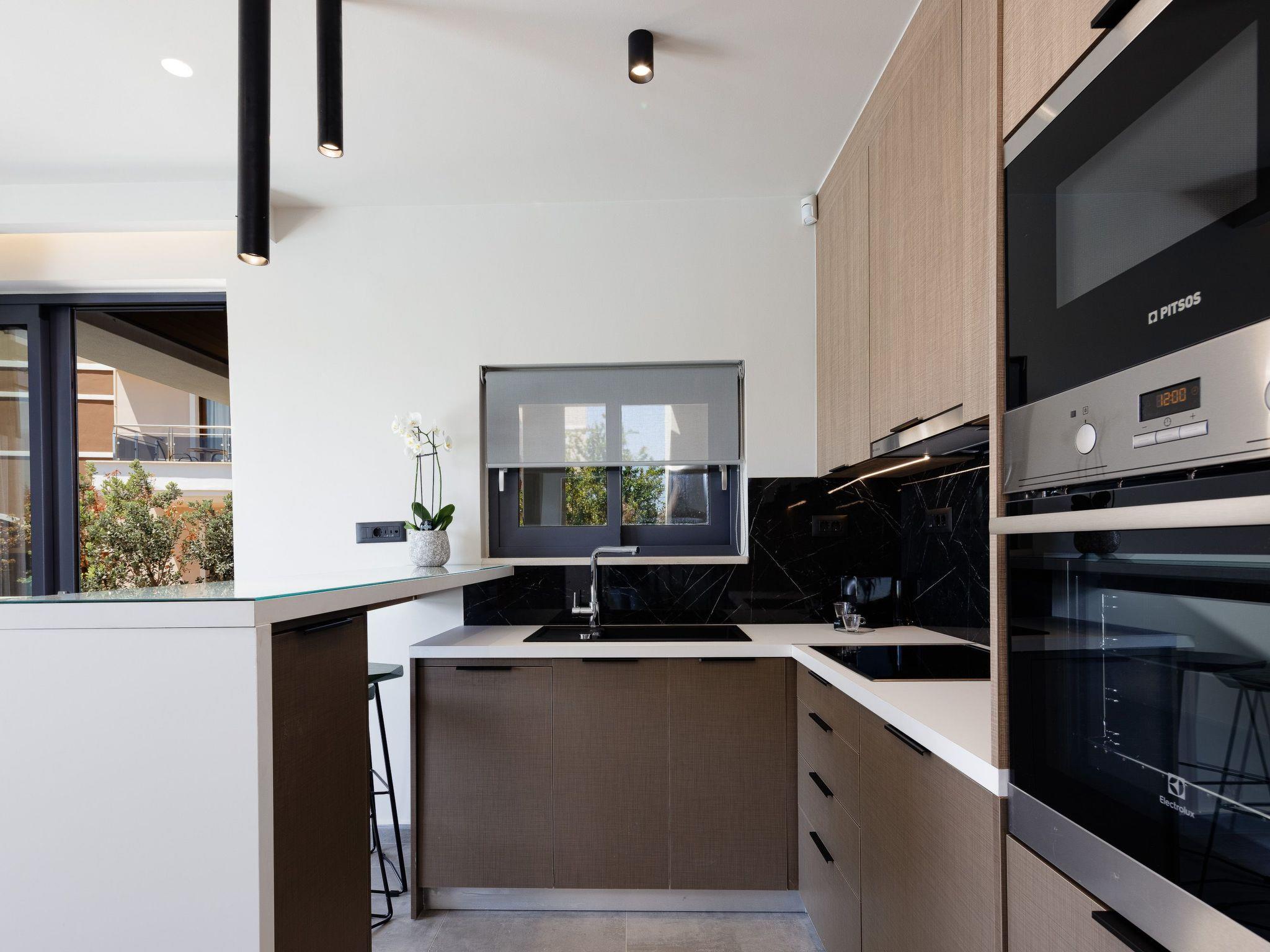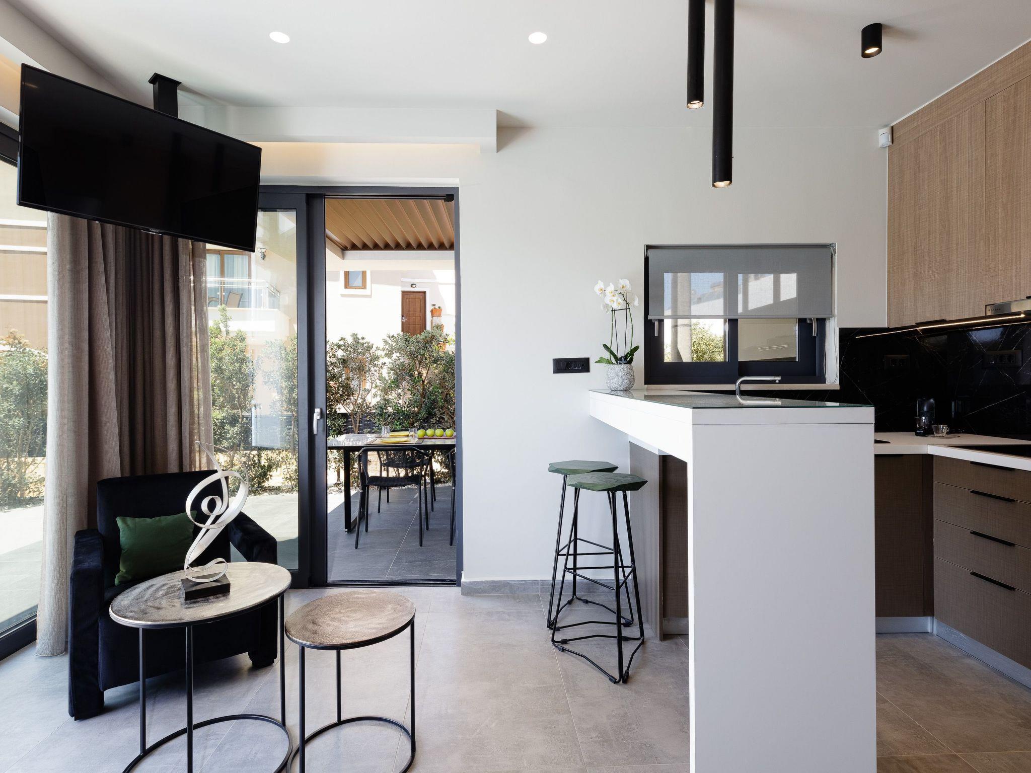 VillAgioi Villa I is a 75 sqm residence spread over two floors, comfortably accommodating up to 5 guests. The ground floor welcomes you with an open-plan living area, blending minimal design with functionality. The living space is furnished with a cosy seating area, a Smart TV, and large sliding doors that provide direct access to the outdoor pool area, creating a seamless indoor-outdoor living experience. Adjacent to the living area is a fully equipped kitchen with stainless steel appliances and a sleek breakfast bar.