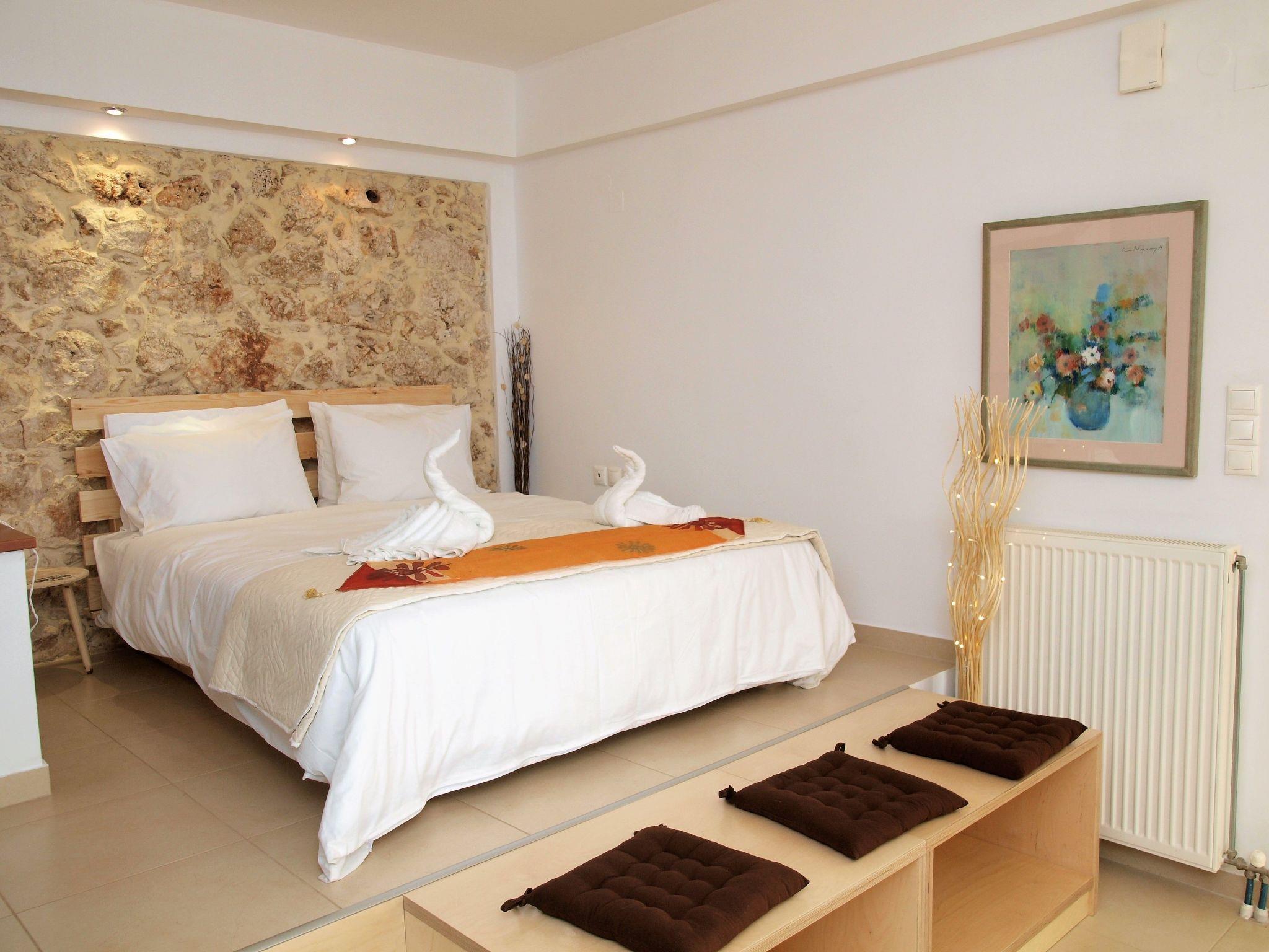 A traditional Cretan treat is welcoming you while the home is equipped with everything that includes a full house as well as everything you may need for your personal care. A full kitchen with filter and espresso coffee makers, a desk to touch your laptop, a comfortable living room and a double handmade bed, dominating the highest level of the house, from which one can enjoy day and night the stunning sea and mountain view from the large windows.The view is even better than the balcony of the studio, which "sees" also towards the rock garden and the small pine forest. From here, you can watch the most beautiful sunrise: You'll have to sucrifice your lie-in, but it will be unforgettable!