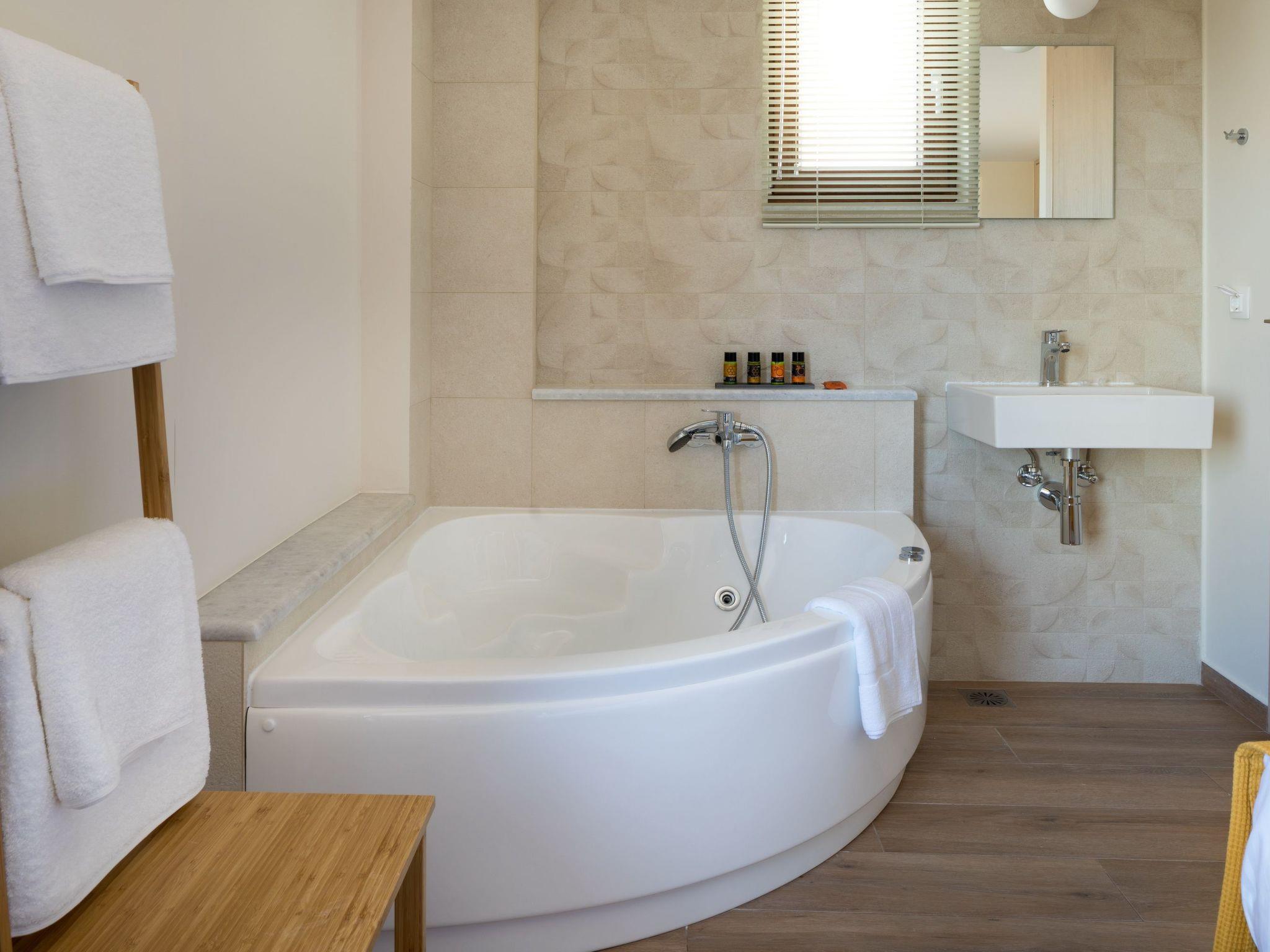 The villa also has a private pool (with children section), veranda with barbeque equipment and balcony with an astonishing view of the sea and Thodorou island.