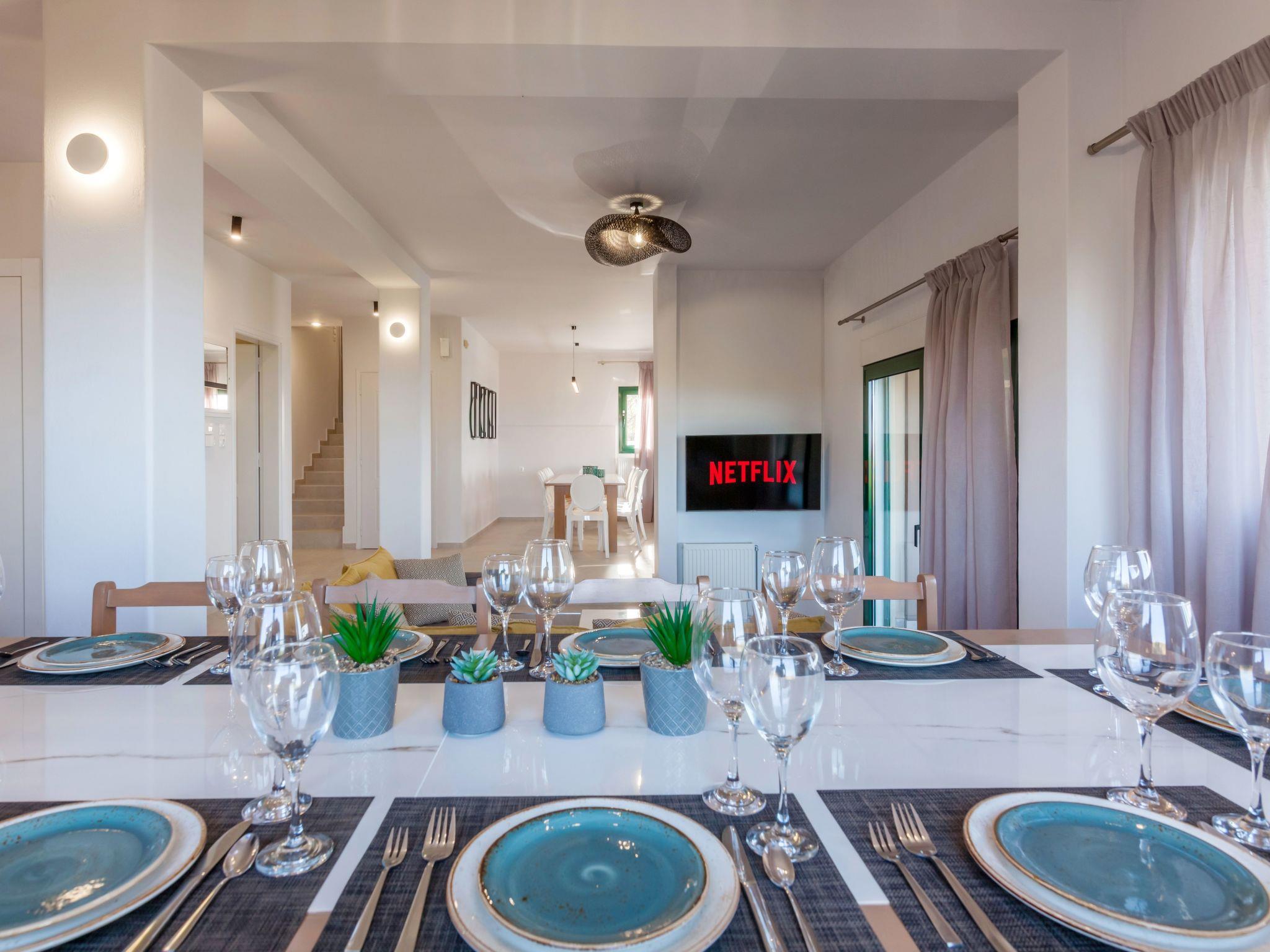 A second living room is located on the same level that provides a smart TV with satellite channels and Netflix App and a corner sofa bed, which can accommodate an extra person. Both living rooms have direct access to a shared balcony with a large dining table for twelve people, with view and access to the pool area as well as, sea view.