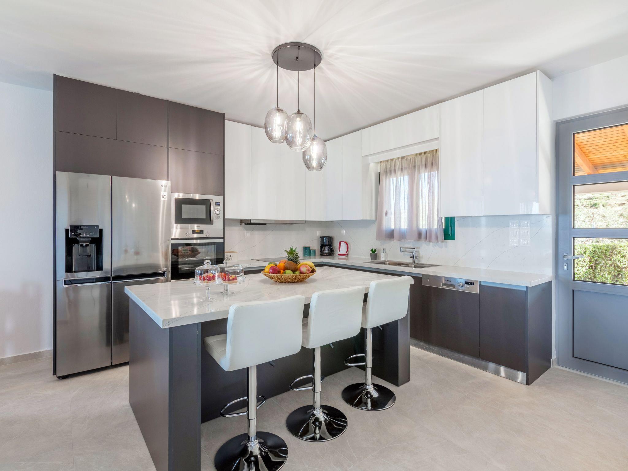 Entering the house you will find a large library with board games. At this level there is a fully equipped kitchen with modern electrical appliances (double door refrigerator with water filter, ceramic hob, oven, dishwasher, microwave) and all the necessary appliances for a comfortable stay (filter coffee maker, kettle, toaster, blender, etc.). In this level there is also the washing machine inside a cupboard together along with other useful household equipment such as iron, iron board, foldable drying rack, etc. In addition, here you will find two large dining tables, each one can accommodate up to twelve people.
