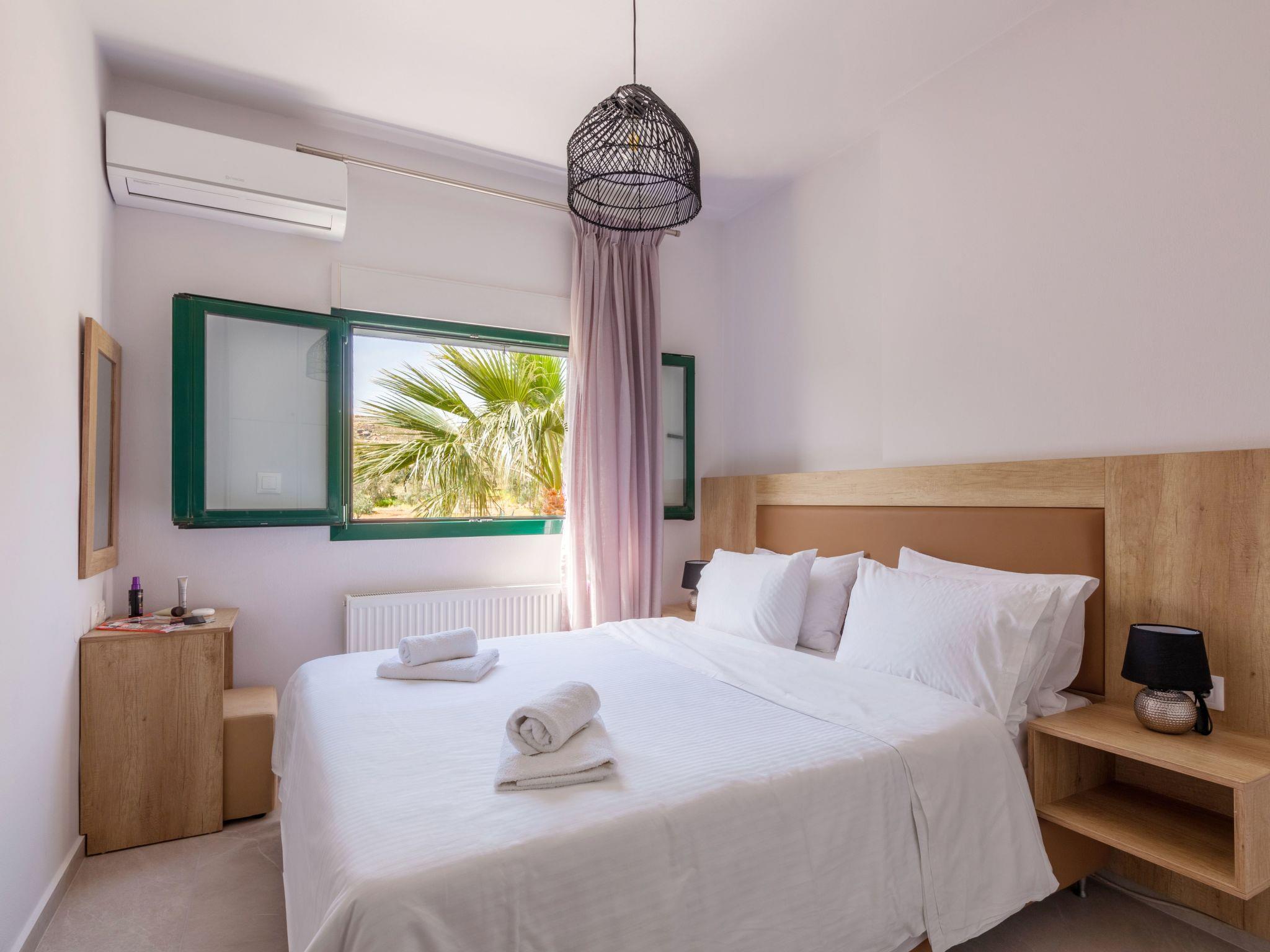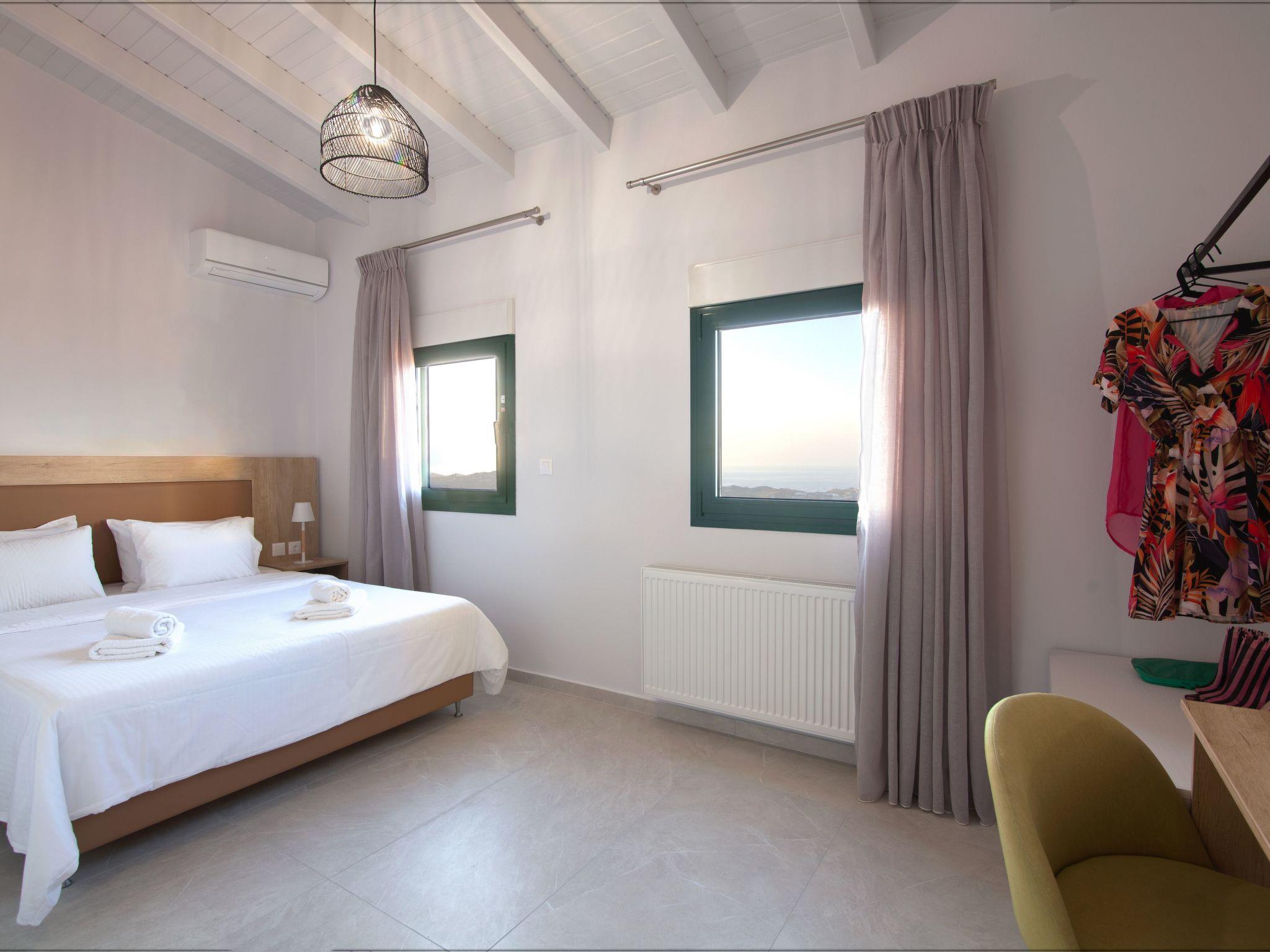 On the second level there are in total seven bedrooms. Bedroom “Vasilis” is the first that you see on your left as you enter this level. It has a Queen bed, air-conditioning and two cute windows over-looking to the beautiful bay of Ligaria and Agia Pelagia.