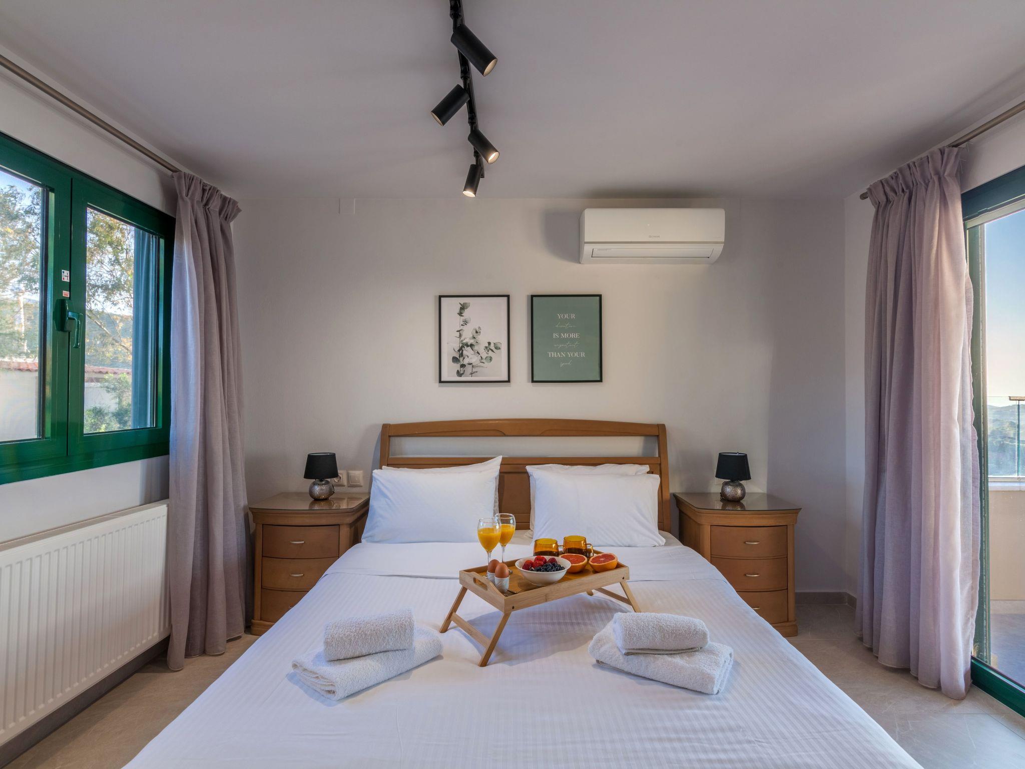 Next to “Vasilis” bedroom, there is “Chysi” bedroom. It also has a Queen bed, air-conditioning, one window with sea view and access to a balcony that is shared with the next bedroom, “Fenia”. “Fenia” bedroom is the largest one, has a Queen bed, two windows, as well as the access to the shared balcony with “Chrysi” bedroom, over-looking to the pool area and the sea.