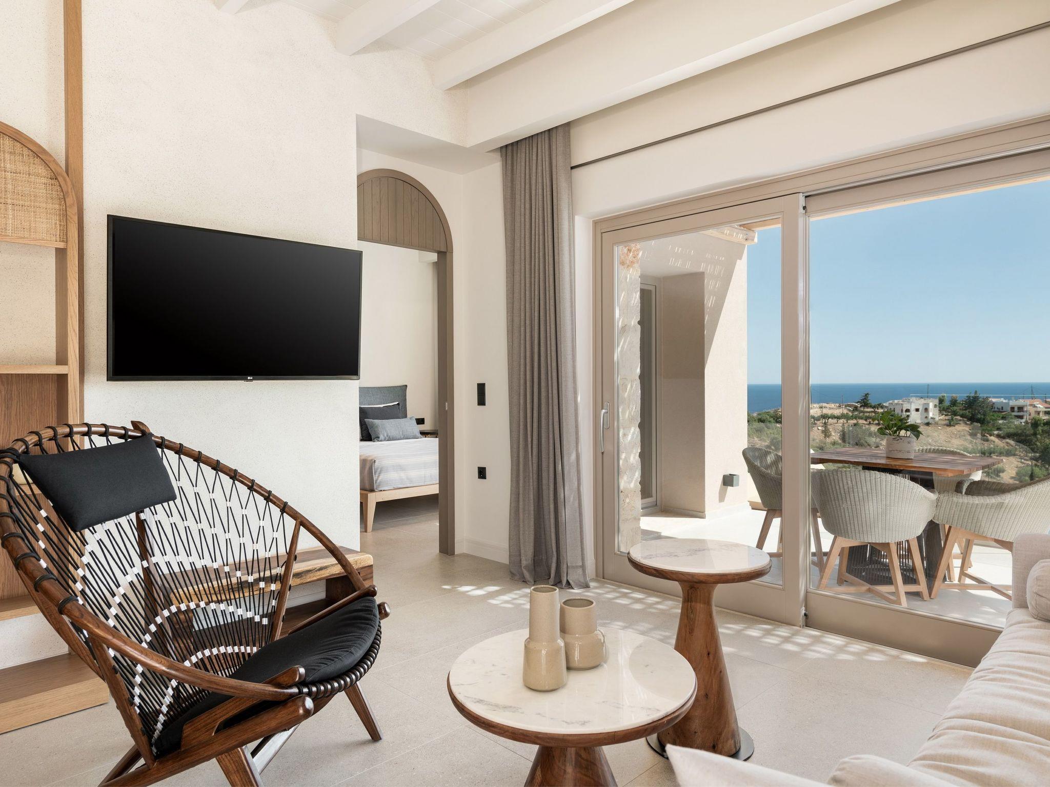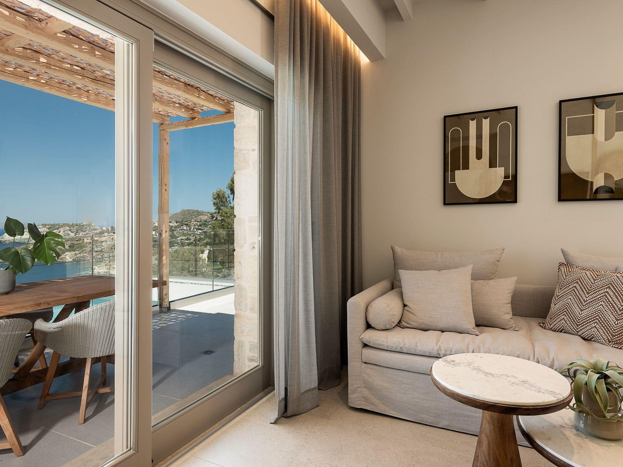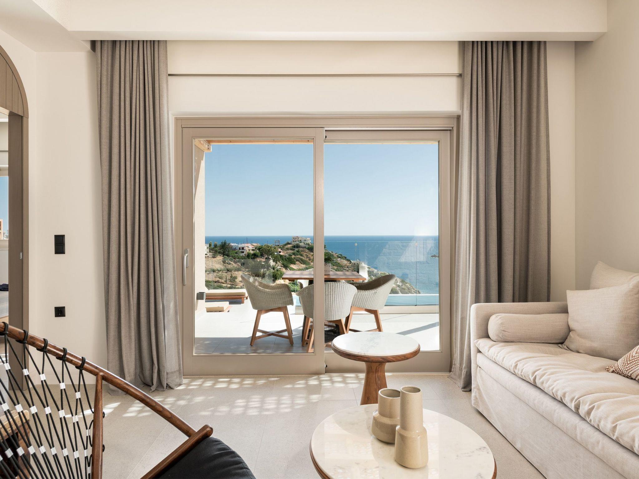 Kokomo Villas are located on a hill overlooking the bay of Lygaria in the greater area of Agia Pelagia. It can be reached from Heraklion/Heraklion Airport in about 25 minutes. It is easily accessible from the Highway and ideal as a base for exploring places of interest. Although close to various magnificent beaches, restaurants and supermarkets, it is also perfect for relaxing in privacy.The villa is characterized by high aesthetics and stunning panoramic views of the Cretan Sea. The earthy tones of the spaces merge into the deep blue of the sea and sky, offering an unforgettable sense of harmony and gentleness. Every aspect, material and element has been carefully selected to wrap you in a state of calmness and satisfaction. All you need to do is enjoy.Villa Gaia hosts 2 bedrooms, both with king size beds and ensuite bathrooms with showers. The front bedroom offers panoramic sea view and direct access to the front veranda. The back bedroom offers direct access to the beautiful backyard. The living-room with a gorgeous view of the sea is connected to a fully equipped open kitchen and dining room and opens out to the veranda. The front outdoor area is exceptionally spacious and the view is a delight to the eyes. It offers a private swimming pool with sunbeds, an outdoor shower, lounge poufs, barbeque (gas) and dining area.Furthermore, Kokomo Villas has solar panels installed to provide some of the energy needed in the property through them. IMPORTANT NOTICE: This property is not suitable for children from 2 to 7 years old, since there is an infinity pool and some not covered areas