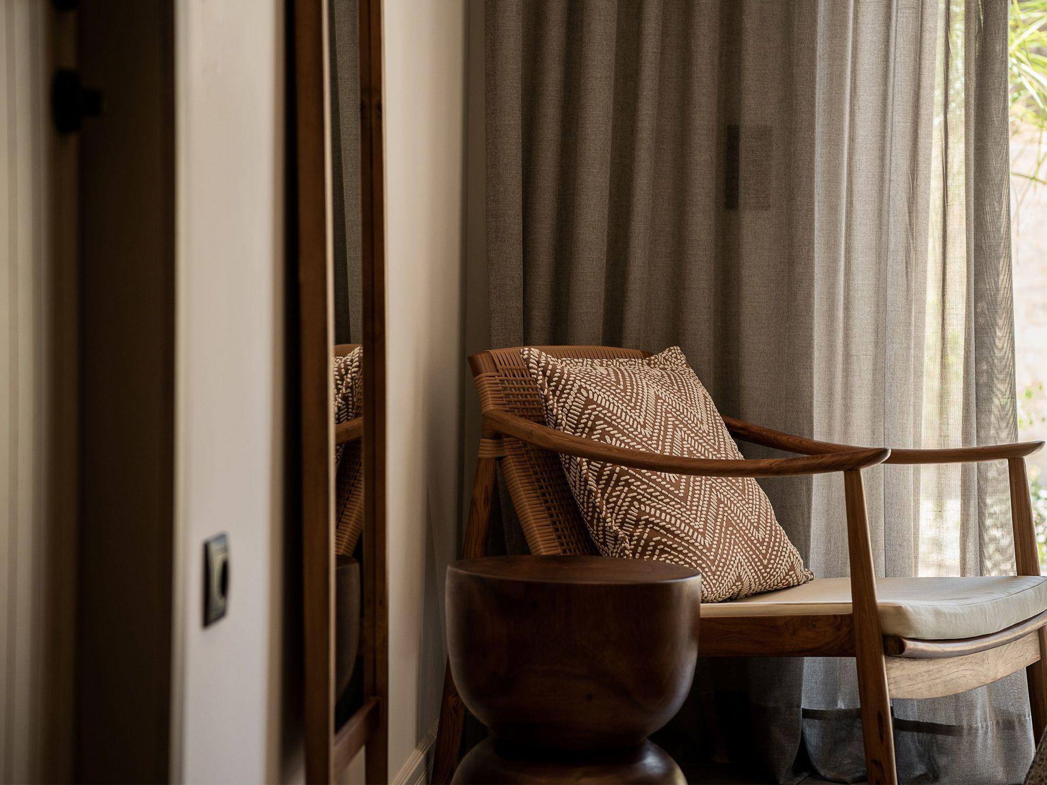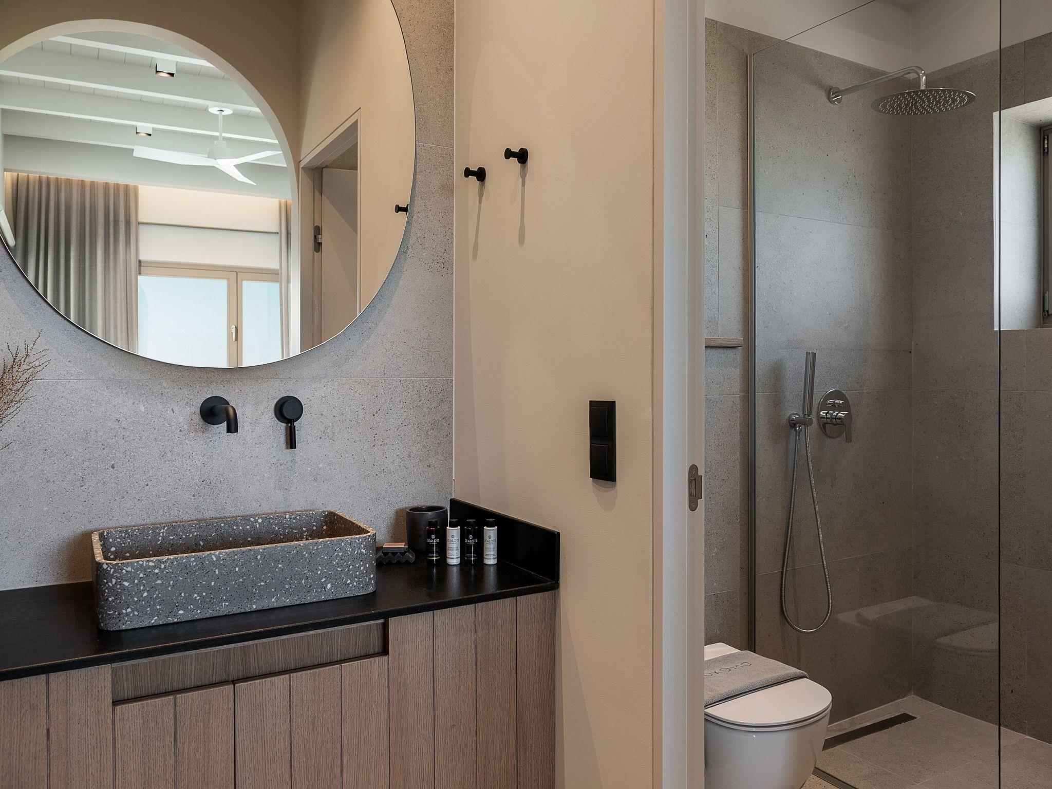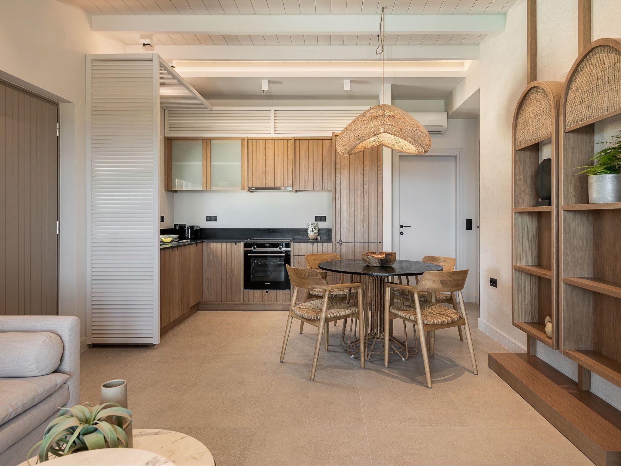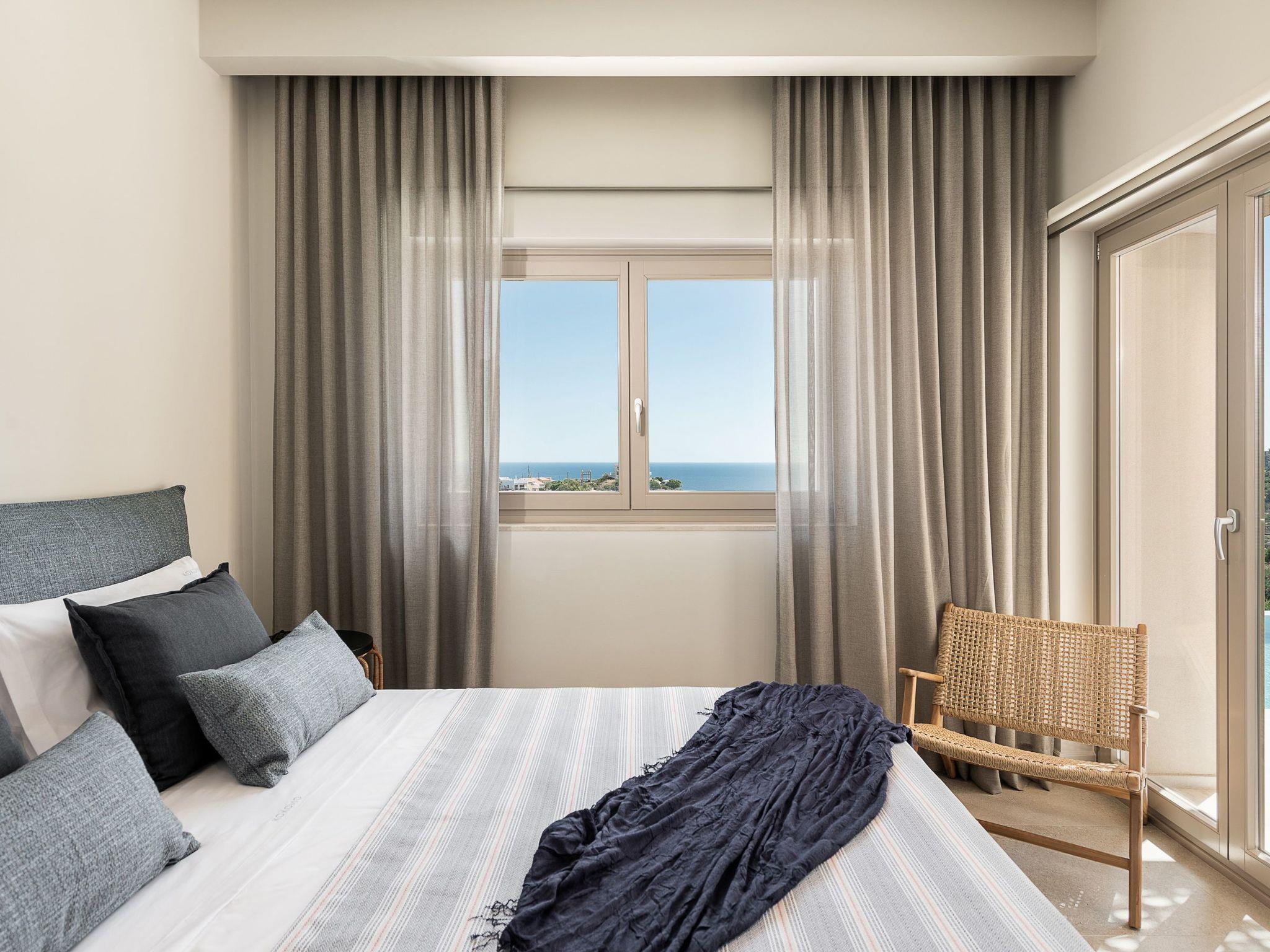 Kokomo Villas are located on a hill overlooking the bay of Lygaria in the greater area of Agia Pelagia. It can be reached from Heraklion/Heraklion Airport in about 25 minutes. It is easily accessible from the Highway and ideal as a base for exploring places of interest. Although close to various magnificent beaches, restaurants and supermarkets, it is also perfect for relaxing in privacy.The villa is characterized by high aesthetics and stunning panoramic views of the Cretan Sea. The earthy tones of the spaces merge into the deep blue of the sea and sky, offering an unforgettable sense of harmony and gentleness. Every aspect, material and element has been carefully selected to wrap you in a state of calmness and satisfaction. All you need to do is enjoy.Villa Gaia hosts 2 bedrooms, both with king size beds and ensuite bathrooms with showers. The front bedroom offers panoramic sea view and direct access to the front veranda. The back bedroom offers direct access to the beautiful backyard. The living-room with a gorgeous view of the sea is connected to a fully equipped open kitchen and dining room and opens out to the veranda. The front outdoor area is exceptionally spacious and the view is a delight to the eyes. It offers a private swimming pool with sunbeds, an outdoor shower, lounge poufs, barbeque (gas) and dining area.Furthermore, Kokomo Villas has solar panels installed to provide some of the energy needed in the property through them. IMPORTANT NOTICE: This property is not suitable for children from 2 to 7 years old, since there is an infinity pool and some not covered areas