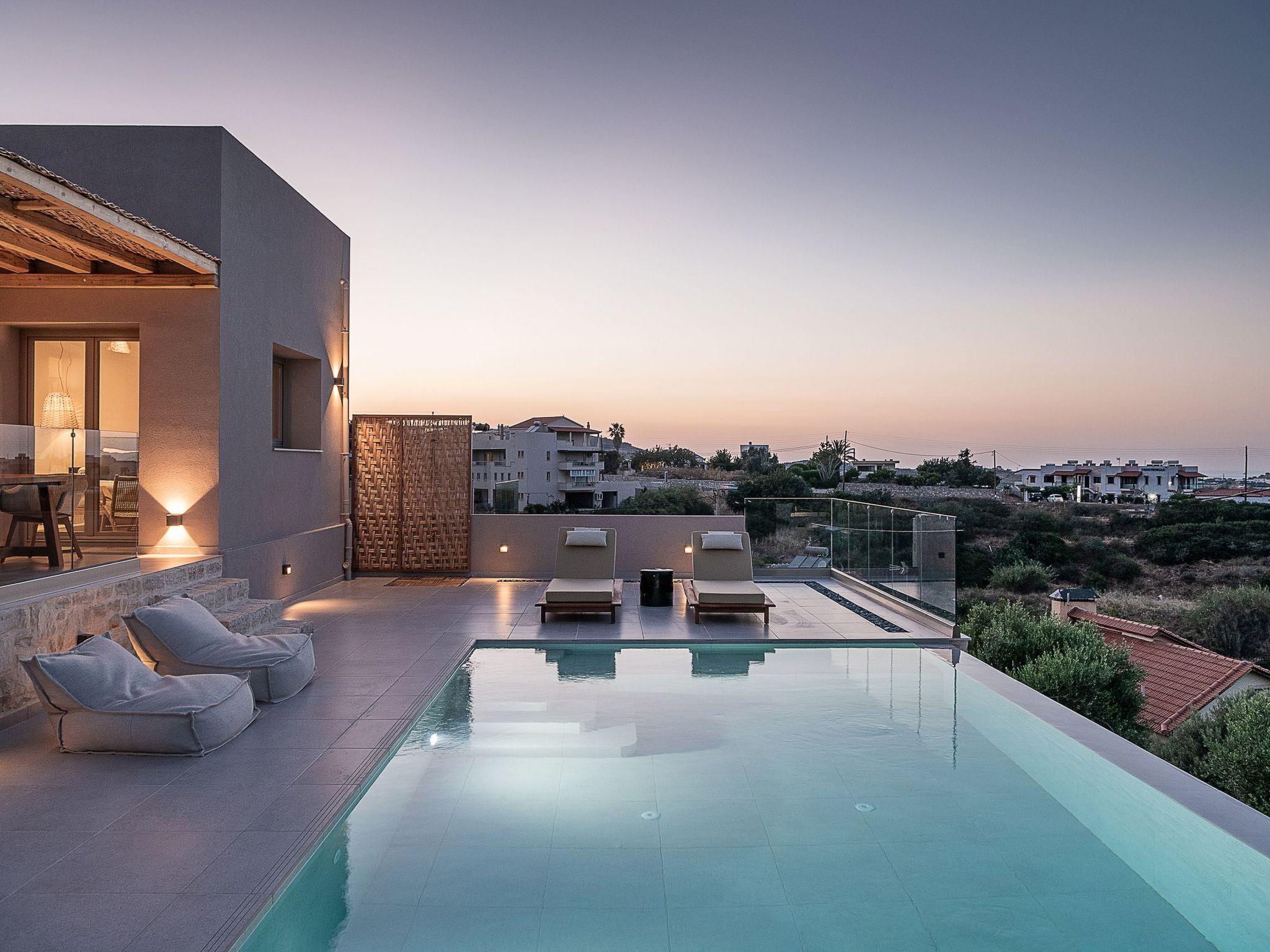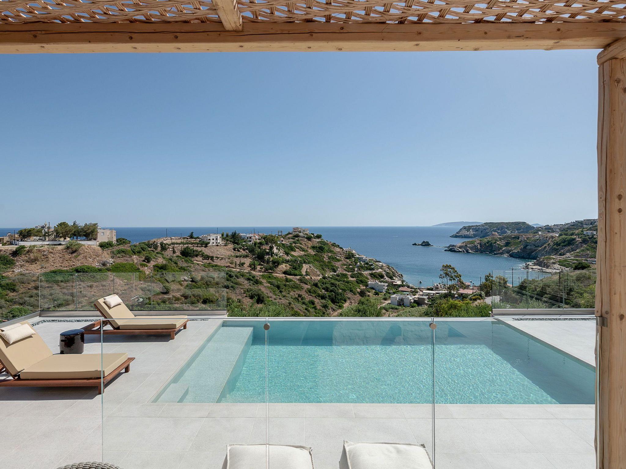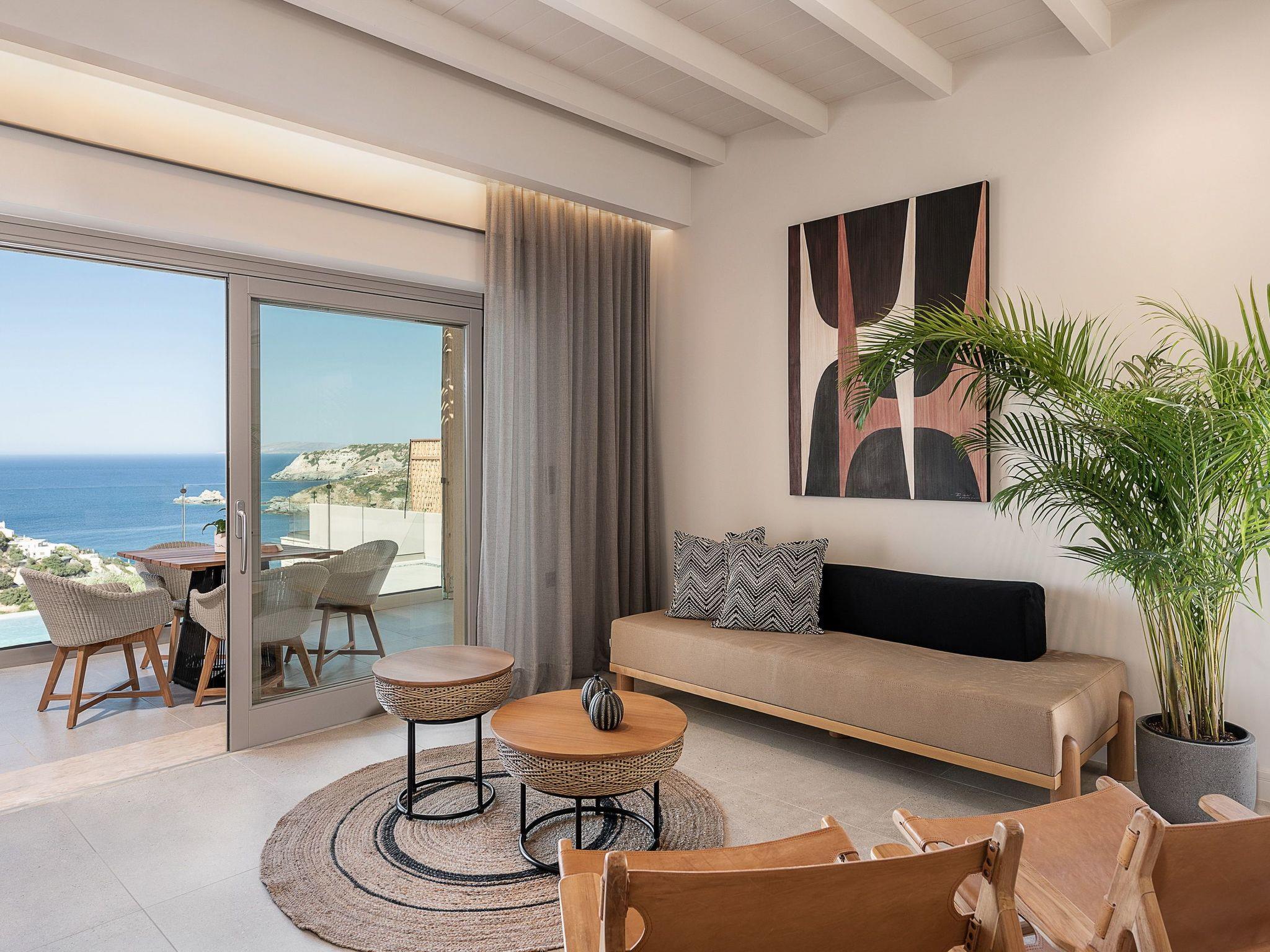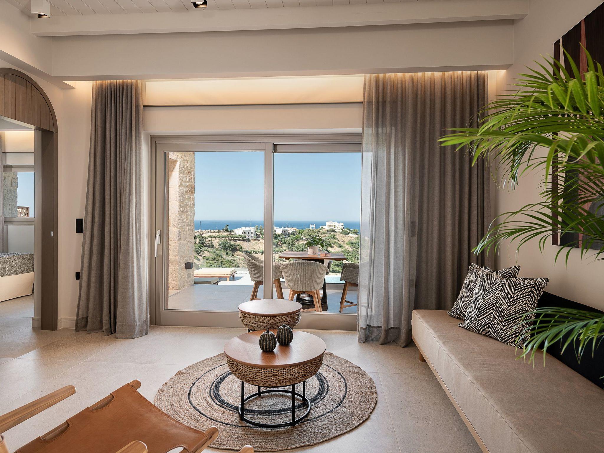 Kokomo Villas are located on a hill overlooking the bay of Lygaria in the greater area of Agia Pelagia. It can be reached from Heraklion/Heraklion Airport in about 25 minutes. It is easily accessible from the Highway and ideal as a base for exploring places of interest. Although close to various magnificent beaches, restaurants and supermarkets, it is also perfect for relaxing in privacy.The villa is characterized by high aesthetics and stunning panoramic views of the Cretan Sea. The earthy tones of the spaces merge into the deep blue of the sea and sky, offering an unforgettable sense of harmony and gentleness. Every aspect, material and element has been carefully selected to wrap you in a state of calmness and satisfaction. All you need to do is enjoy.Villa Thea hosts 1 bedroom with king size bed and panoramic sea view as well as directs access to the front veranda. Guests will enjoy the lovely stylish bathroom with double sinks and double showers. The spacious living-room with a gorgeous view of the sea is connected to a fully equipped open kitchen and dining room. The living room also opens out to the front veranda, which offers a dining table and barbeque (gas). Just below the veranda, there is the pool area which has a private swimming pool with sunbeds, an outdoor shower and lounge poufs.Furthermore, Kokomo Villas has solar panels installed to provide some of the energy needed in the property through them. IMPORTANT NOTICE: This property is not suitable for children from 2 to 7 years old, since there is an infinity pool and some not covered areas