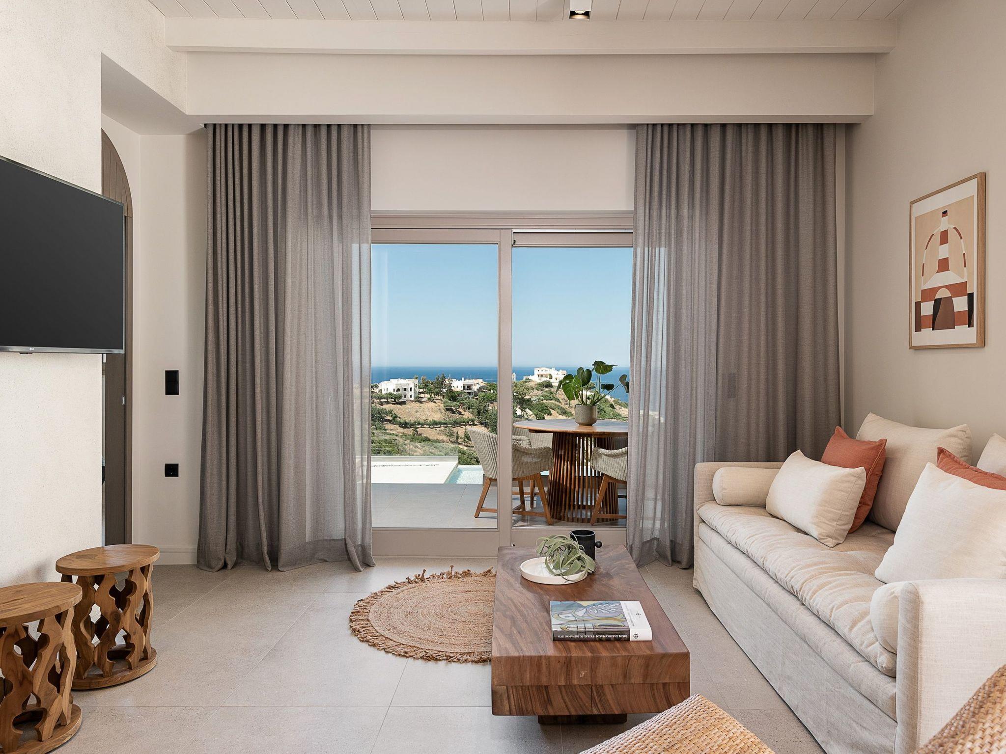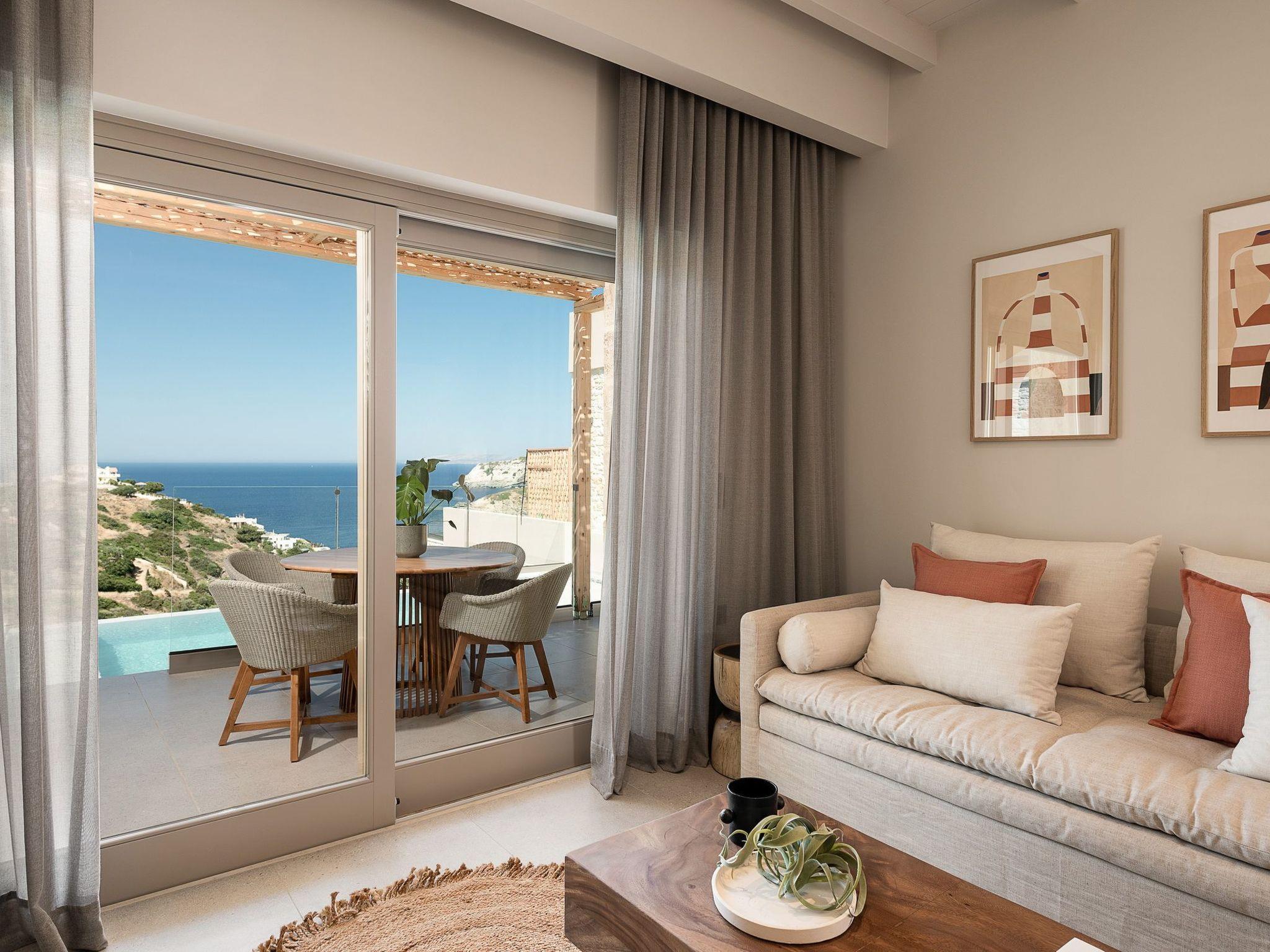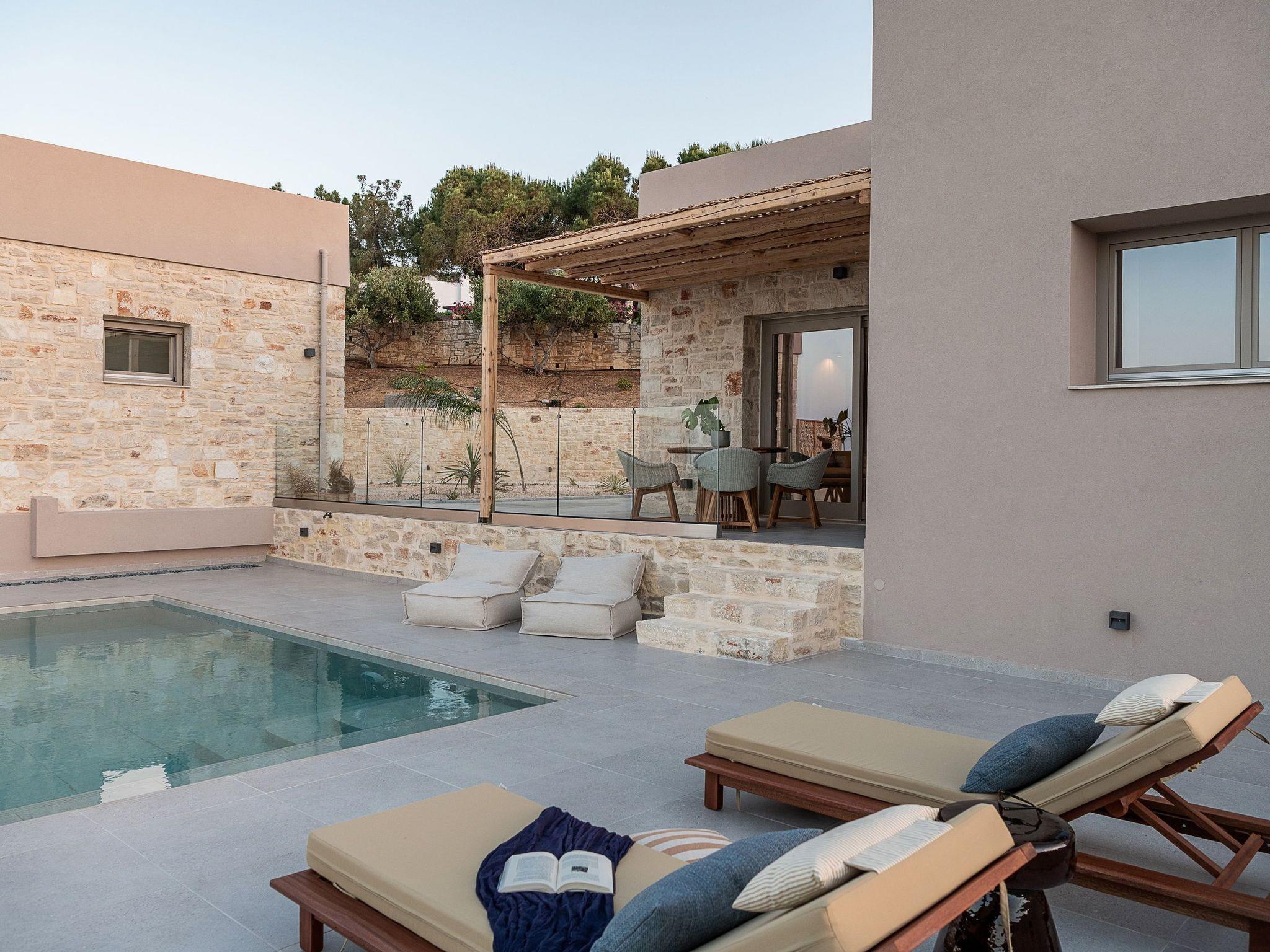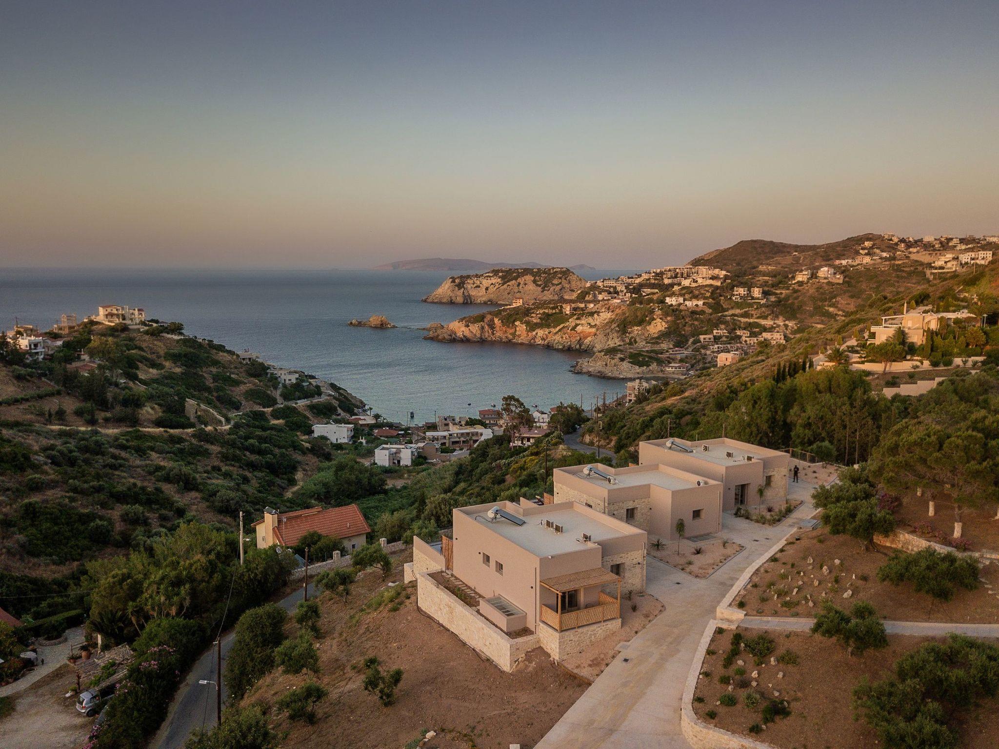 Kokomo Villas consists of 3 luxury villas, located on a hill overlooking the bay of Lygaria in the greater area of Agia Pelagia. It can be reached from Heraklion/Heraklion Airport in about 25 minutes. It is easily accessible from the Highway and ideal as a base for exploring places of interest. Although close to various magnificent beaches, restaurants, and supermarkets, it is also perfect for relaxing in privacy. The villa is characterized by high aesthetics and stunning panoramic views of the Cretan Sea. The earthy tones of the spaces merge into the deep blue of the sea and sky, offering an unforgettable sense of harmony and gentleness. Every aspect, material, and element has been carefully selected to wrap you in a state of calmness and satisfaction. All you need to do is enjoy. Villa Aura hosts 2 bedrooms, both with king-size beds and ensuite bathrooms with showers. The front bedroom offers a panoramic sea view and direct access to the front veranda. The back bedroom offers a tasteful private veranda with views of the garden. The common area consists of a cosy living room, workspace, dining table fully equipped kitchen. This area also has direct access to the front veranda. Just below the veranda, which includes a dining table and a barbeque (gas), there is the pool area, which has a private swimming pool with sunbeds, an outdoor shower, and lounge poufs. Furthermore, Kokomo Villas has solar panels installed to provide some of the energy needed for the property. IMPORTANT NOTICE: This property is not suitable for children from 2 to 7 years old, since there is an infinity pool and some uncovered areas