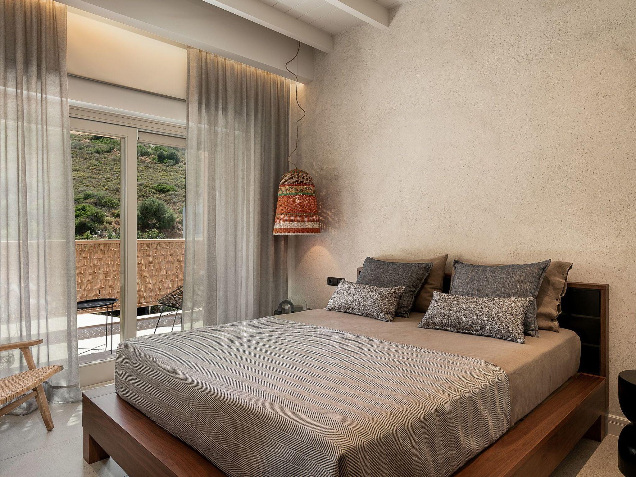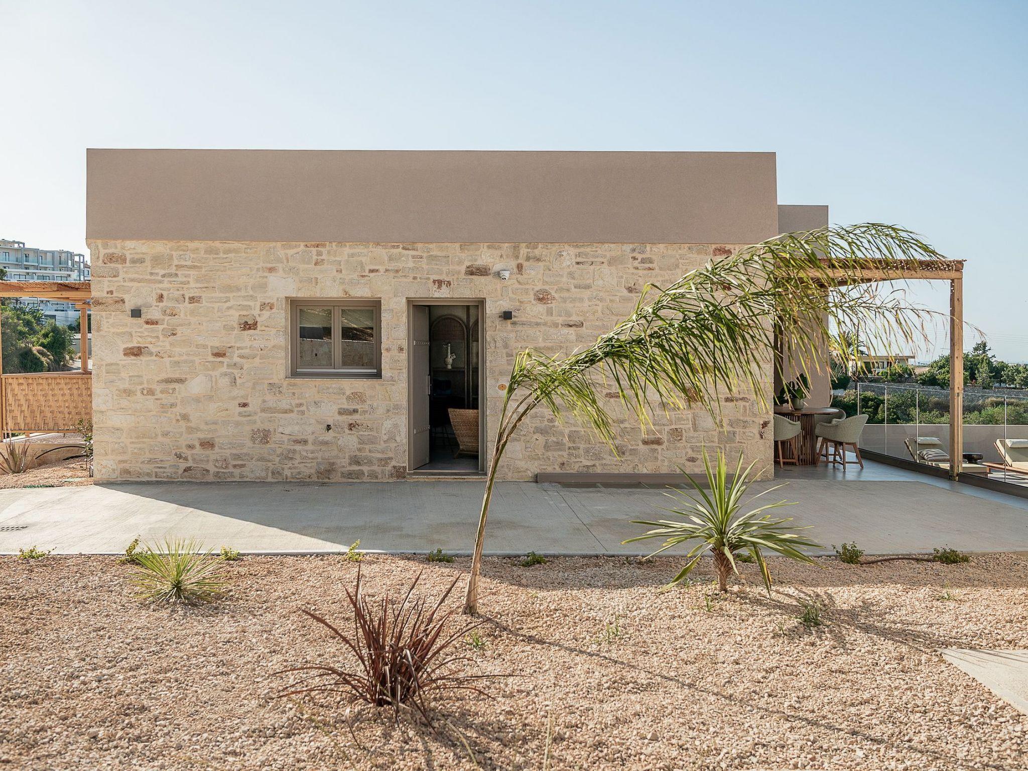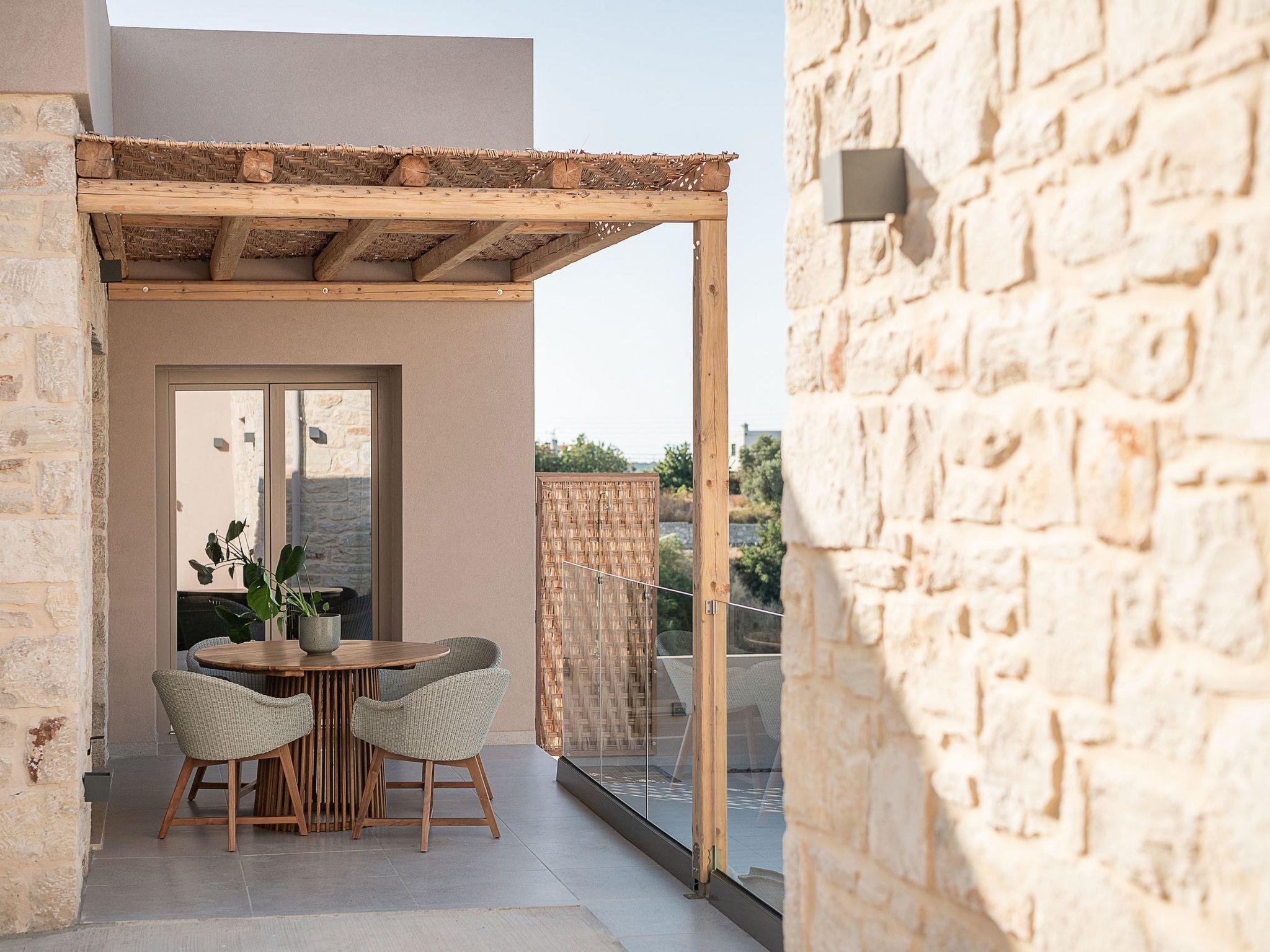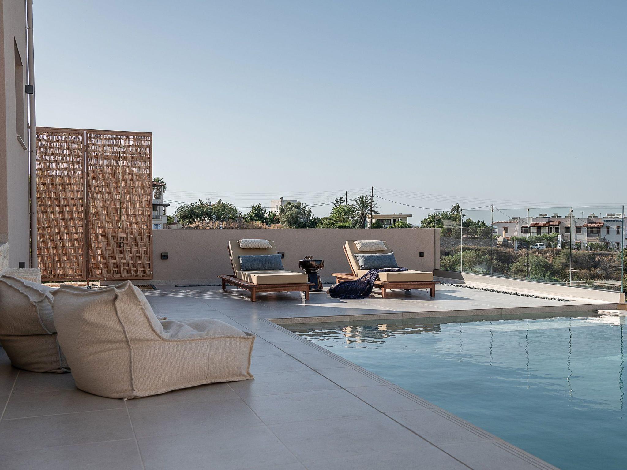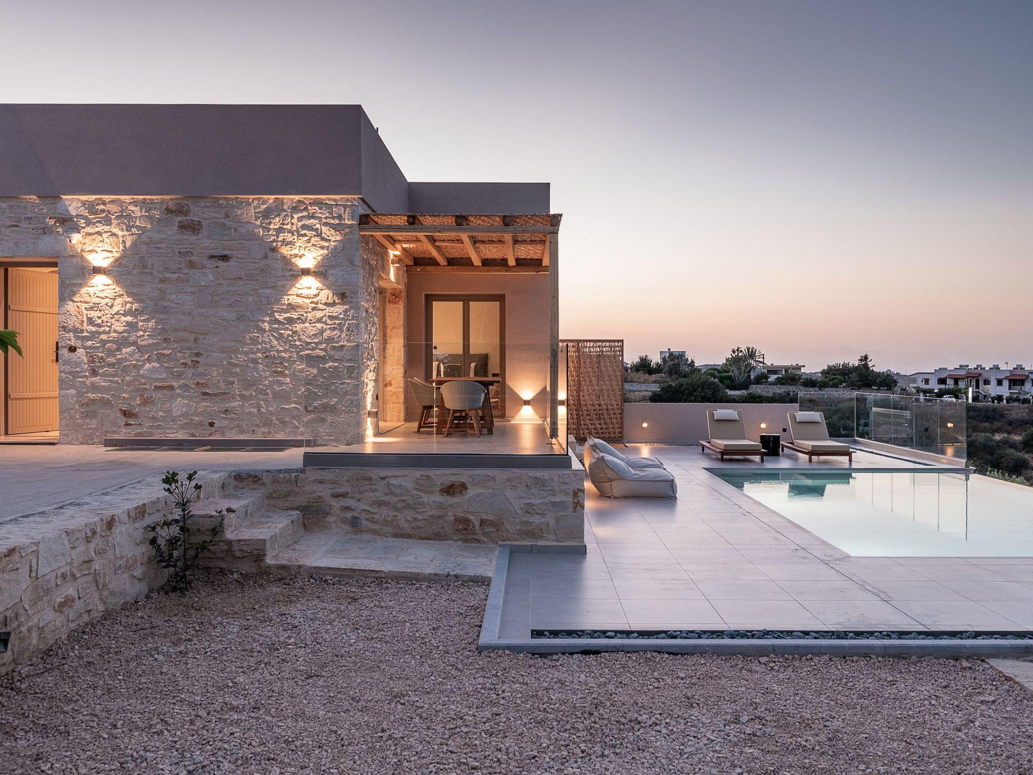 Kokomo Villas consists of 3 luxury villas, located on a hill overlooking the bay of Lygaria in the greater area of Agia Pelagia. It can be reached from Heraklion/Heraklion Airport in about 25 minutes. It is easily accessible from the Highway and ideal as a base for exploring places of interest. Although close to various magnificent beaches, restaurants, and supermarkets, it is also perfect for relaxing in privacy. The villa is characterized by high aesthetics and stunning panoramic views of the Cretan Sea. The earthy tones of the spaces merge into the deep blue of the sea and sky, offering an unforgettable sense of harmony and gentleness. Every aspect, material, and element has been carefully selected to wrap you in a state of calmness and satisfaction. All you need to do is enjoy. Villa Aura hosts 2 bedrooms, both with king-size beds and ensuite bathrooms with showers. The front bedroom offers a panoramic sea view and direct access to the front veranda. The back bedroom offers a tasteful private veranda with views of the garden. The common area consists of a cosy living room, workspace, dining table fully equipped kitchen. This area also has direct access to the front veranda. Just below the veranda, which includes a dining table and a barbeque (gas), there is the pool area, which has a private swimming pool with sunbeds, an outdoor shower, and lounge poufs. Furthermore, Kokomo Villas has solar panels installed to provide some of the energy needed for the property. IMPORTANT NOTICE: This property is not suitable for children from 2 to 7 years old, since there is an infinity pool and some uncovered areas
