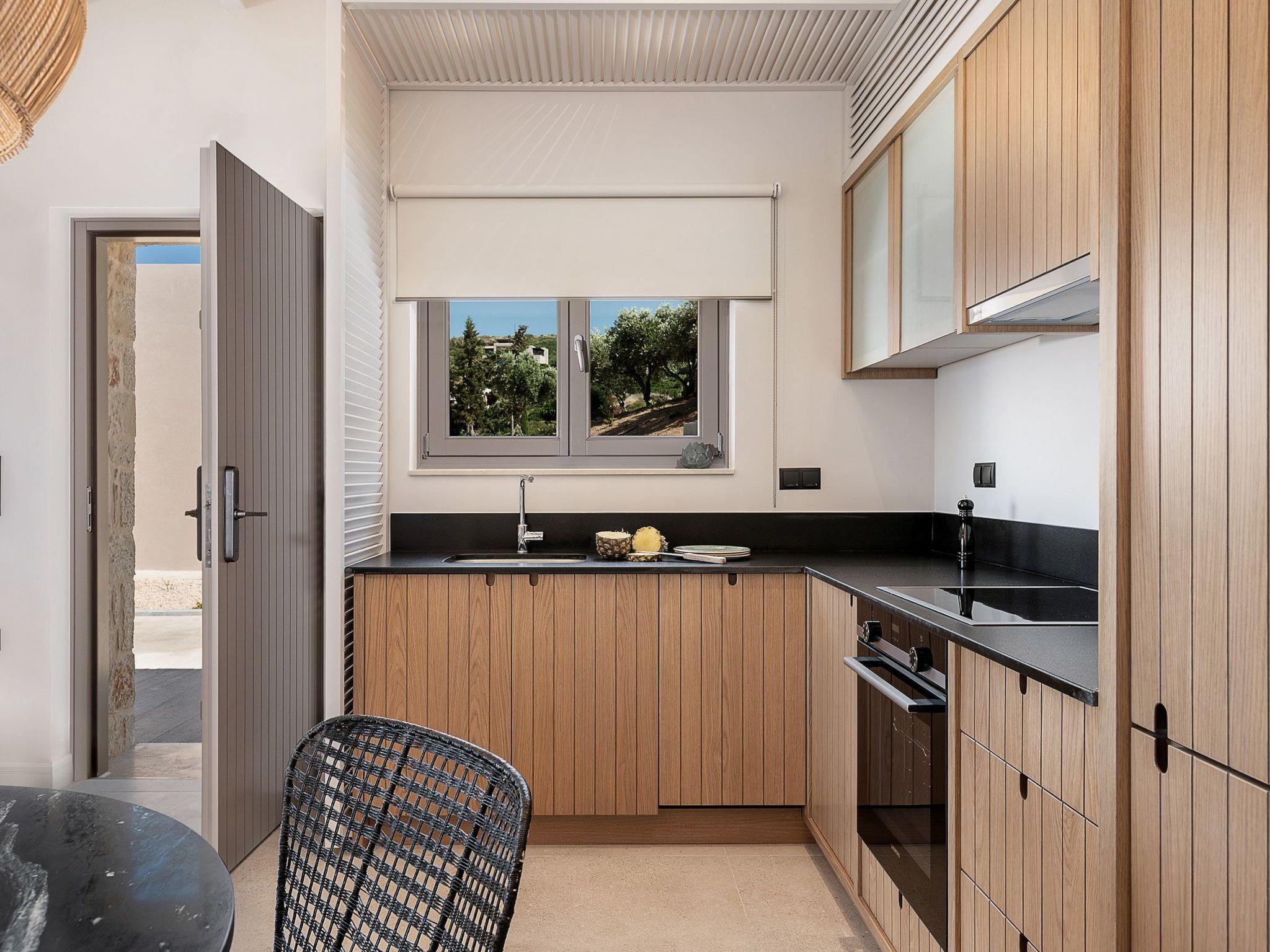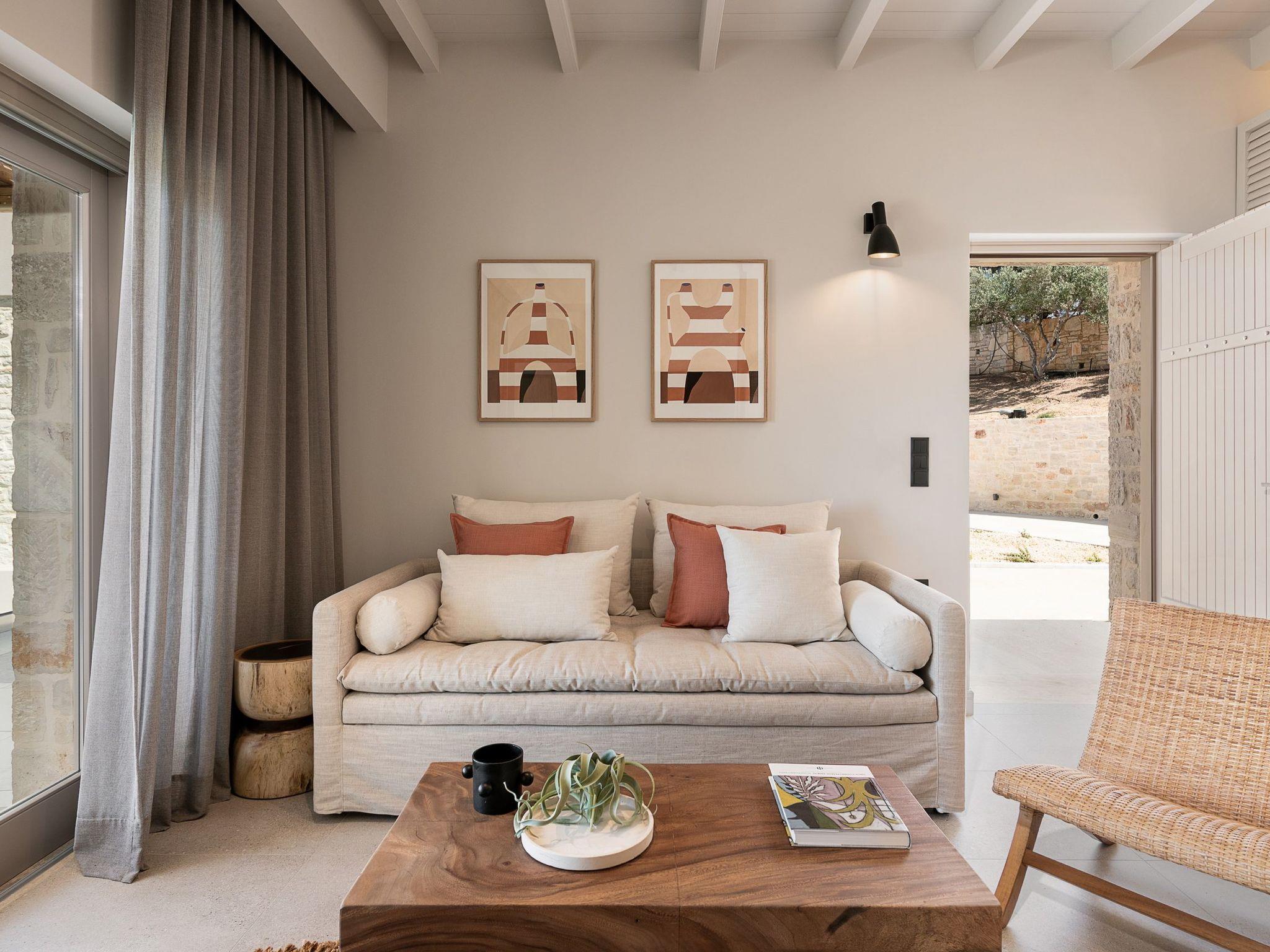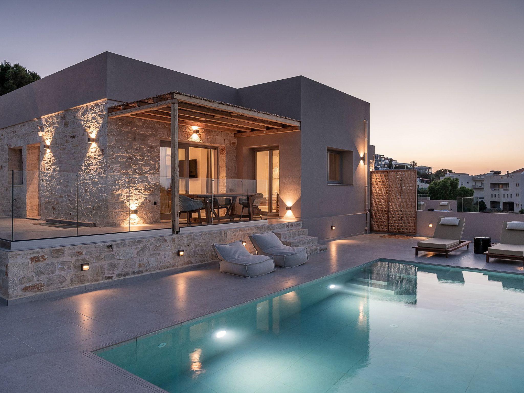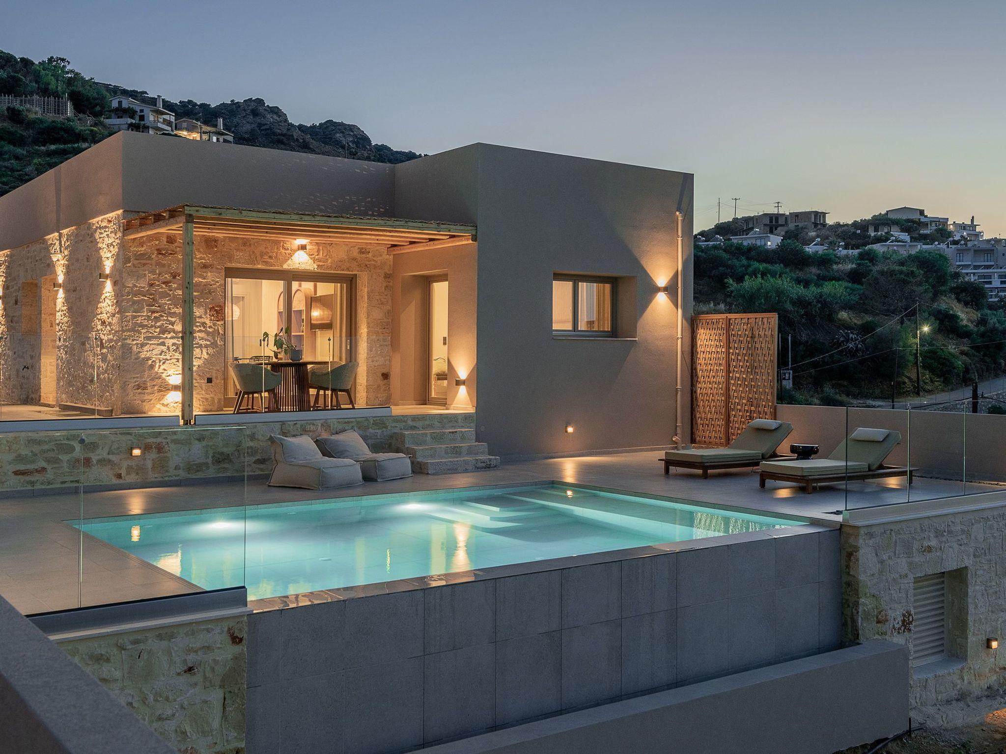 Kokomo Villas consists of 3 luxury villas, located on a hill overlooking the bay of Lygaria in the greater area of Agia Pelagia. It can be reached from Heraklion/Heraklion Airport in about 25 minutes. It is easily accessible from the Highway and ideal as a base for exploring places of interest. Although close to various magnificent beaches, restaurants, and supermarkets, it is also perfect for relaxing in privacy. The villa is characterized by high aesthetics and stunning panoramic views of the Cretan Sea. The earthy tones of the spaces merge into the deep blue of the sea and sky, offering an unforgettable sense of harmony and gentleness. Every aspect, material, and element has been carefully selected to wrap you in a state of calmness and satisfaction. All you need to do is enjoy. Villa Aura hosts 2 bedrooms, both with king-size beds and ensuite bathrooms with showers. The front bedroom offers a panoramic sea view and direct access to the front veranda. The back bedroom offers a tasteful private veranda with views of the garden. The common area consists of a cosy living room, workspace, dining table fully equipped kitchen. This area also has direct access to the front veranda. Just below the veranda, which includes a dining table and a barbeque (gas), there is the pool area, which has a private swimming pool with sunbeds, an outdoor shower, and lounge poufs. Furthermore, Kokomo Villas has solar panels installed to provide some of the energy needed for the property. IMPORTANT NOTICE: This property is not suitable for children from 2 to 7 years old, since there is an infinity pool and some uncovered areas