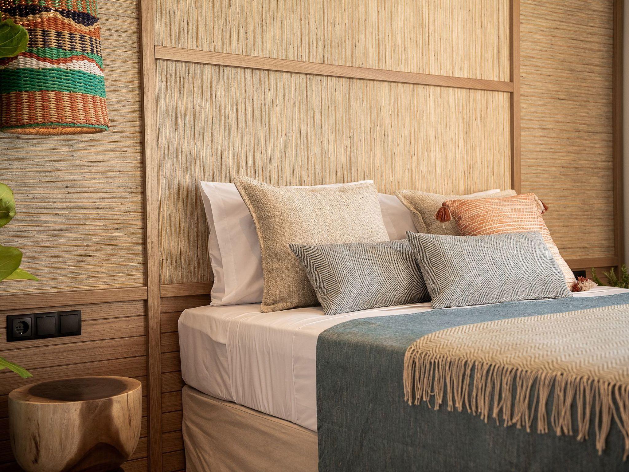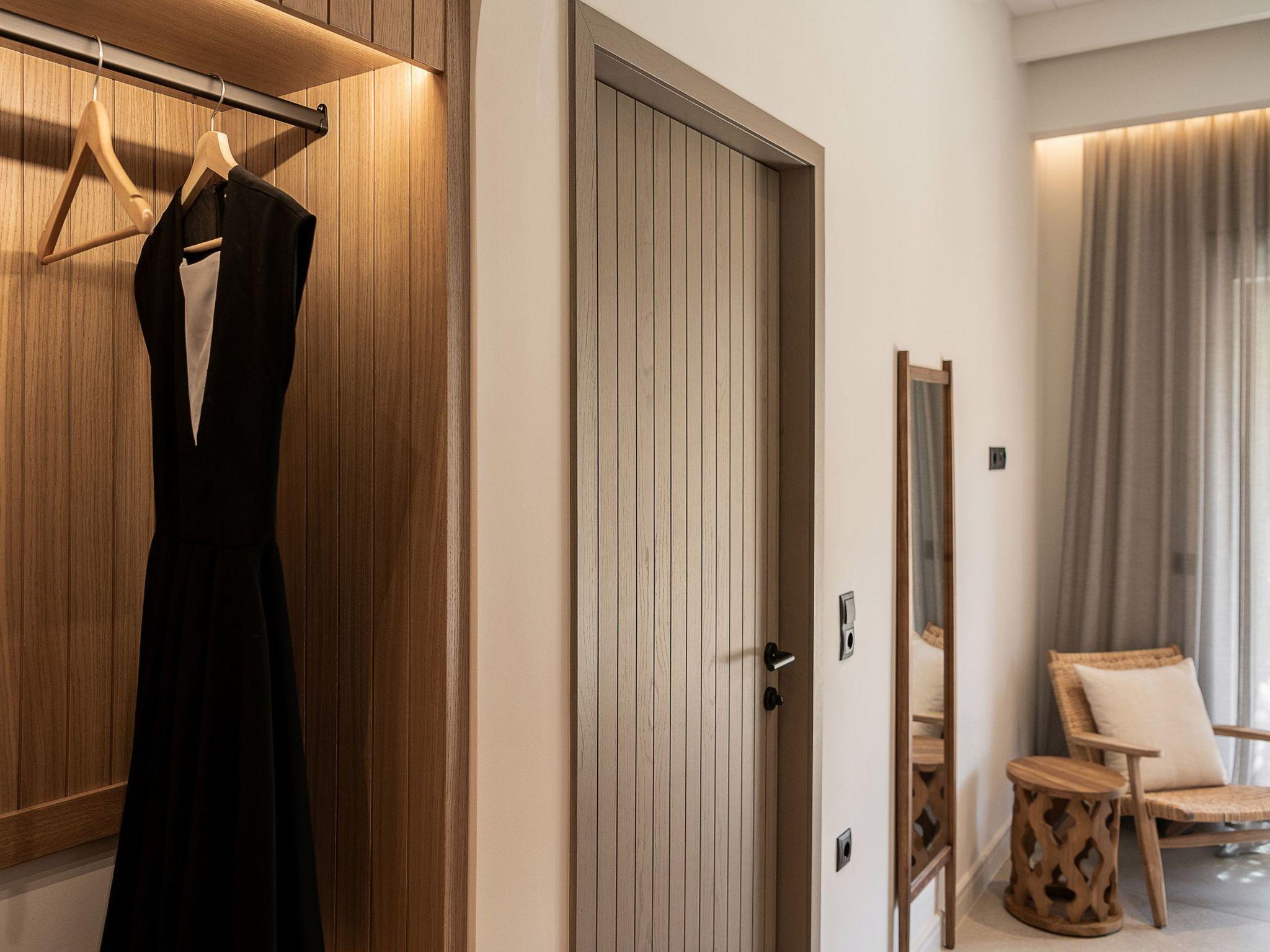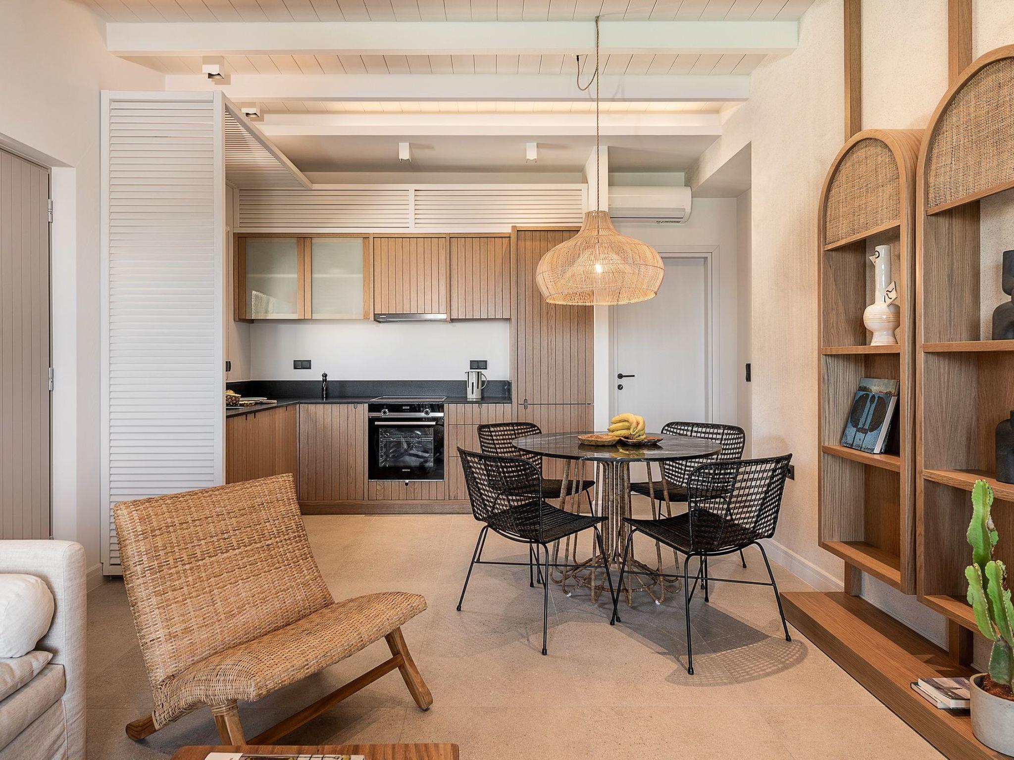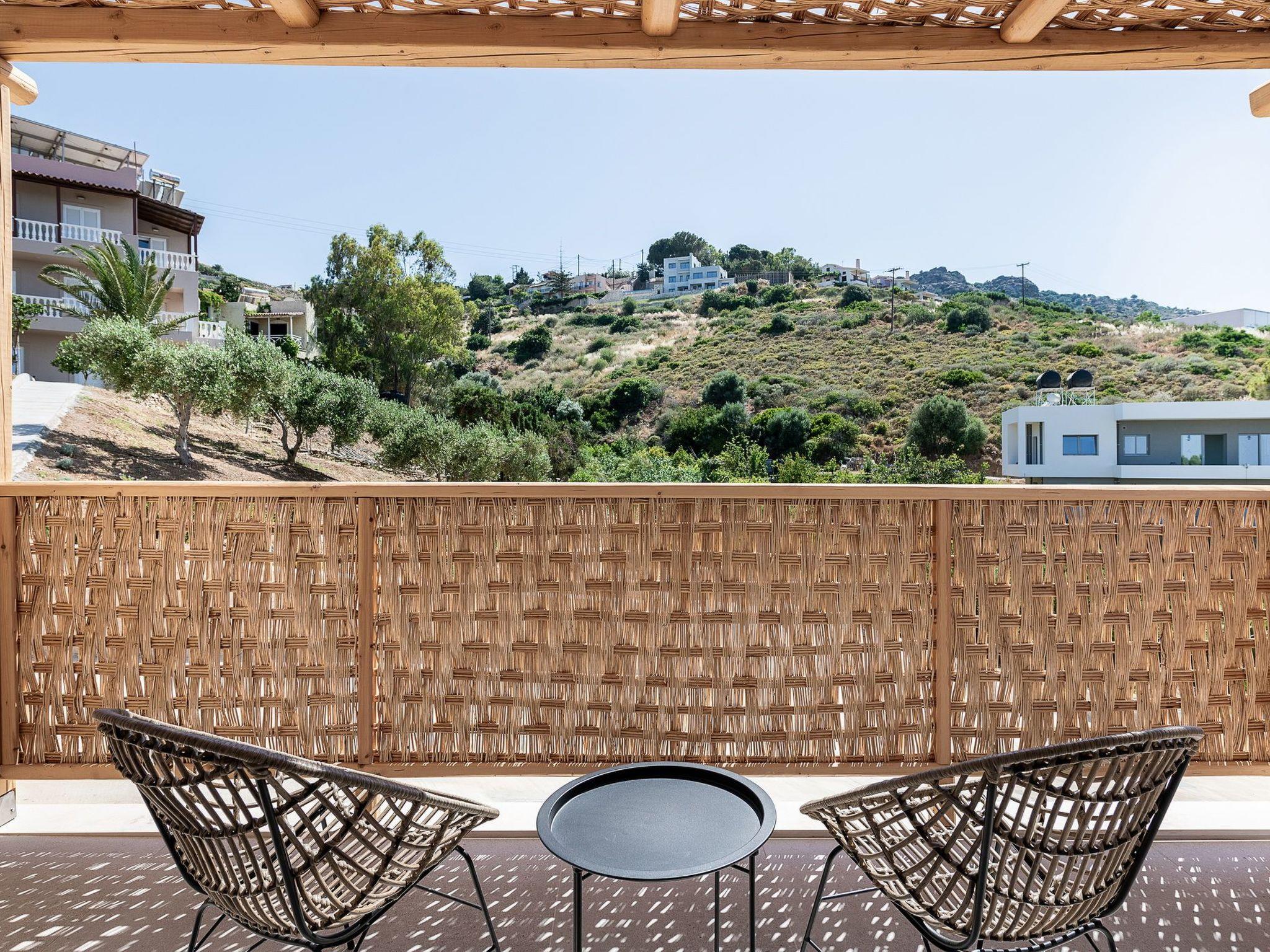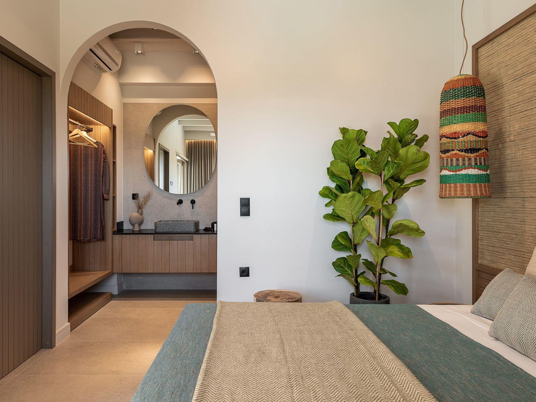 Kokomo Villas consists of 3 luxury villas, located on a hill overlooking the bay of Lygaria in the greater area of Agia Pelagia. It can be reached from Heraklion/Heraklion Airport in about 25 minutes. It is easily accessible from the Highway and ideal as a base for exploring places of interest. Although close to various magnificent beaches, restaurants, and supermarkets, it is also perfect for relaxing in privacy. The villa is characterized by high aesthetics and stunning panoramic views of the Cretan Sea. The earthy tones of the spaces merge into the deep blue of the sea and sky, offering an unforgettable sense of harmony and gentleness. Every aspect, material, and element has been carefully selected to wrap you in a state of calmness and satisfaction. All you need to do is enjoy. Villa Aura hosts 2 bedrooms, both with king-size beds and ensuite bathrooms with showers. The front bedroom offers a panoramic sea view and direct access to the front veranda. The back bedroom offers a tasteful private veranda with views of the garden. The common area consists of a cosy living room, workspace, dining table fully equipped kitchen. This area also has direct access to the front veranda. Just below the veranda, which includes a dining table and a barbeque (gas), there is the pool area, which has a private swimming pool with sunbeds, an outdoor shower, and lounge poufs. Furthermore, Kokomo Villas has solar panels installed to provide some of the energy needed for the property. IMPORTANT NOTICE: This property is not suitable for children from 2 to 7 years old, since there is an infinity pool and some uncovered areas