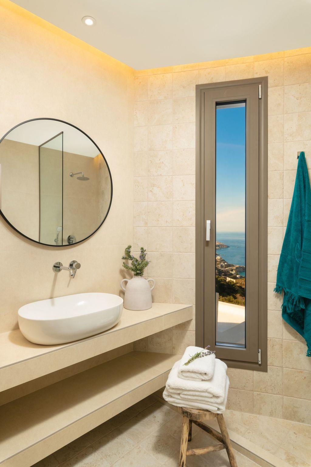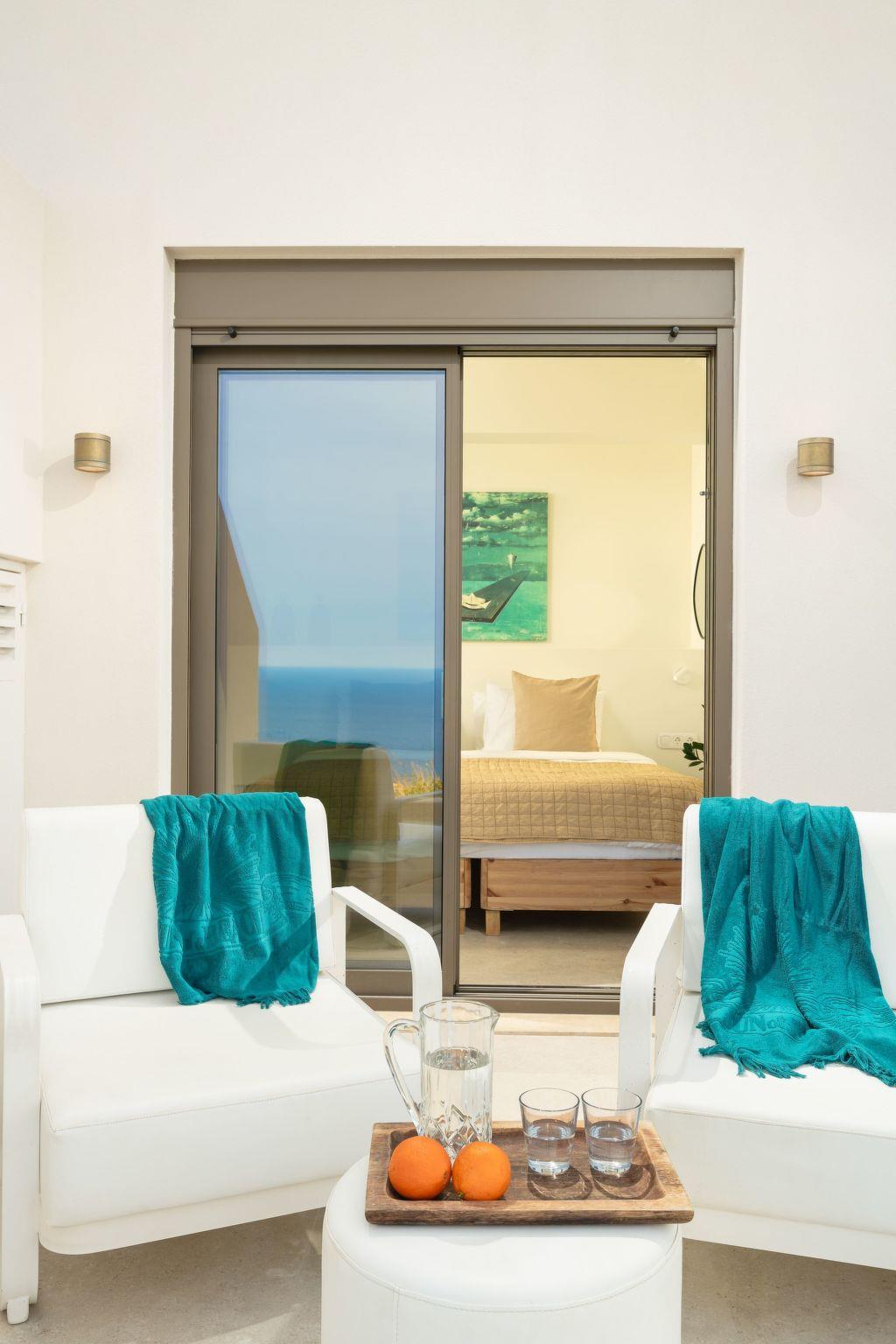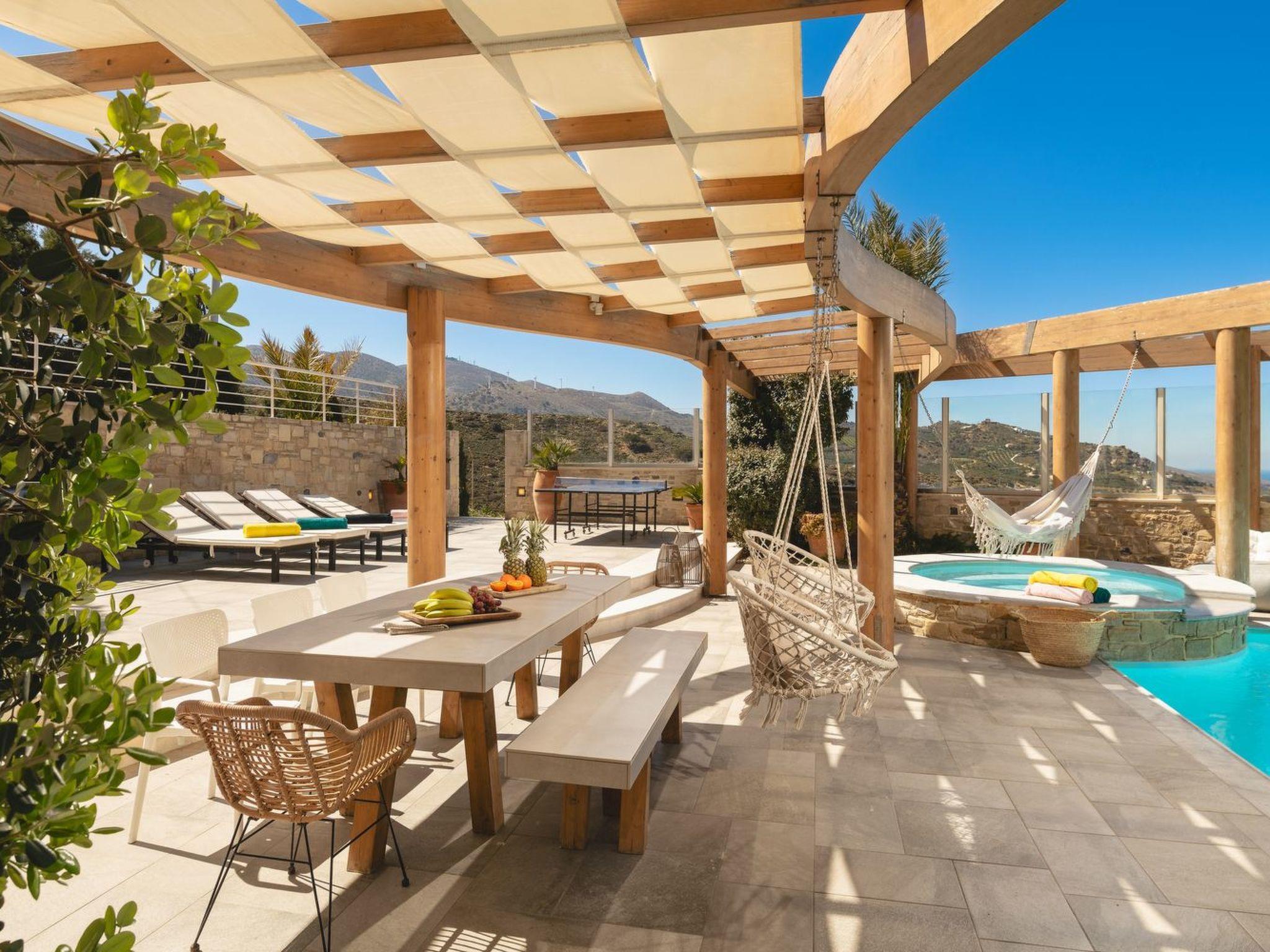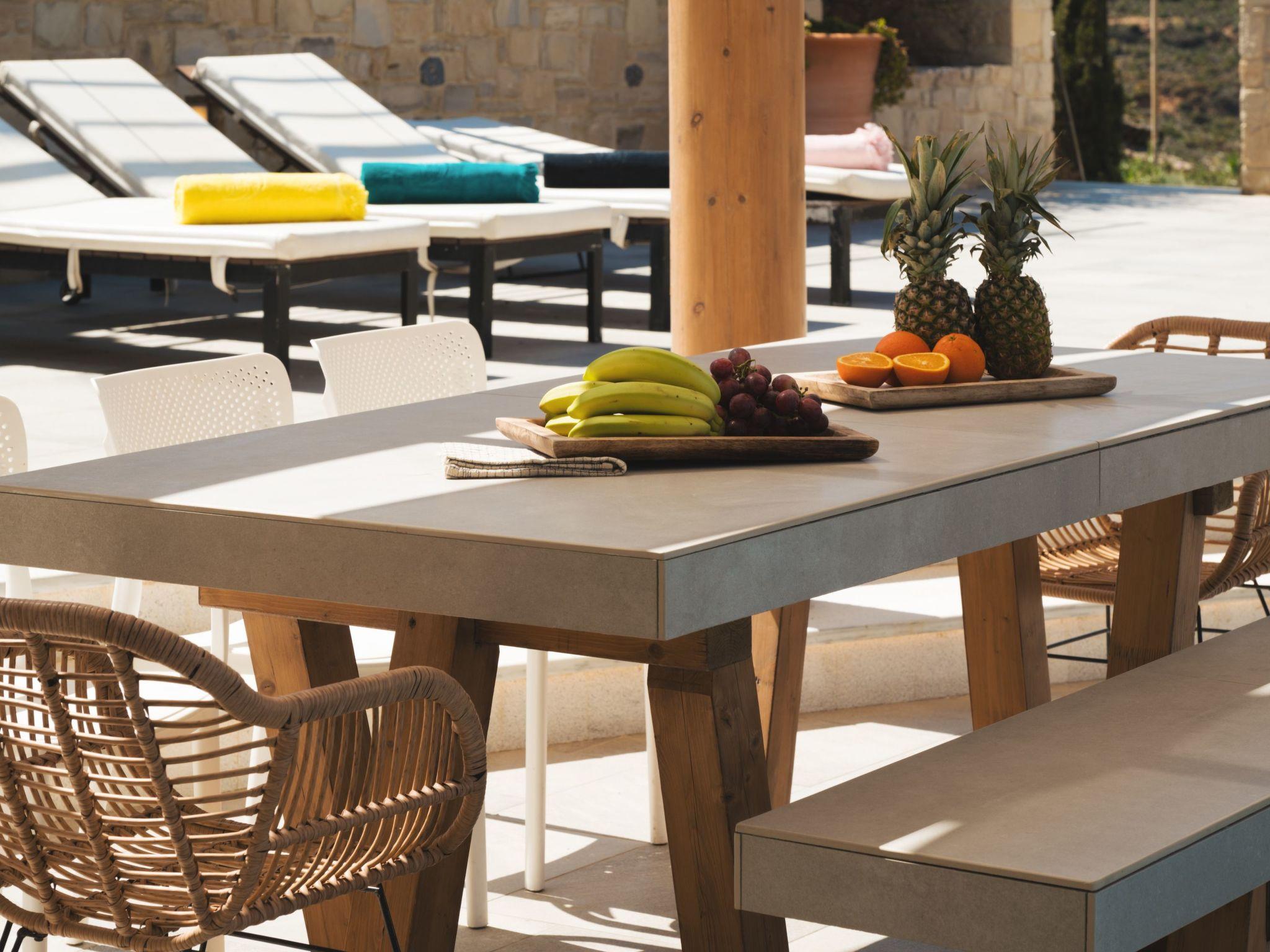 The villa features 6 spacious bedrooms with comfortable beds, all with air conditioning and ensuite or dedicated bathrooms. Enjoy restful nights and wake up to the sound of the Cretan breeze.