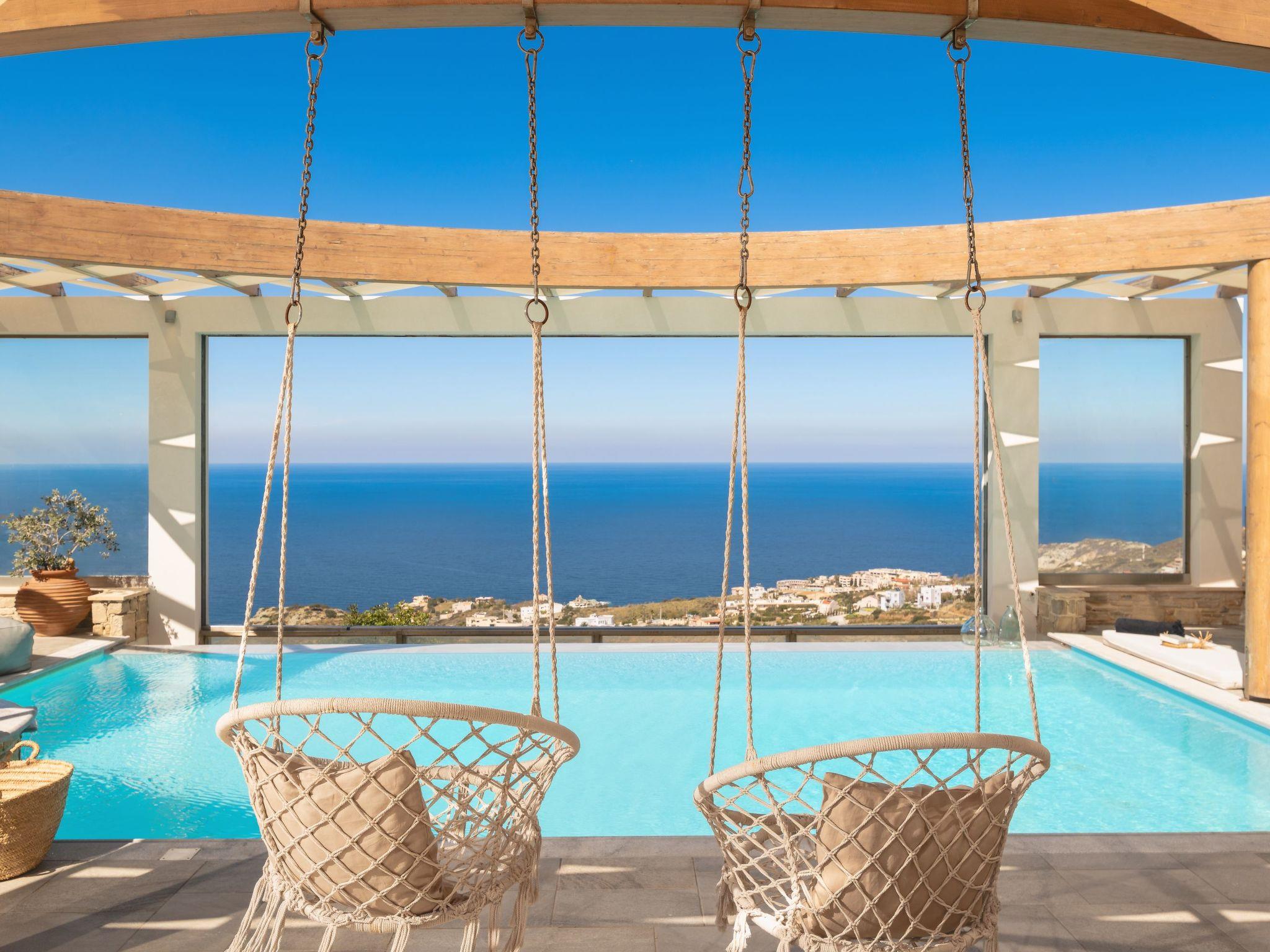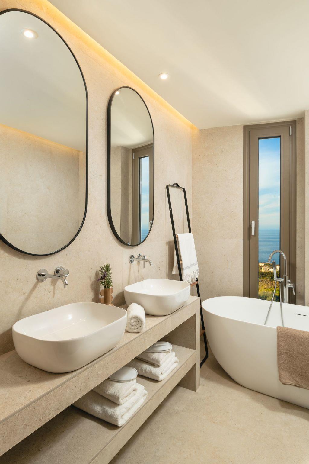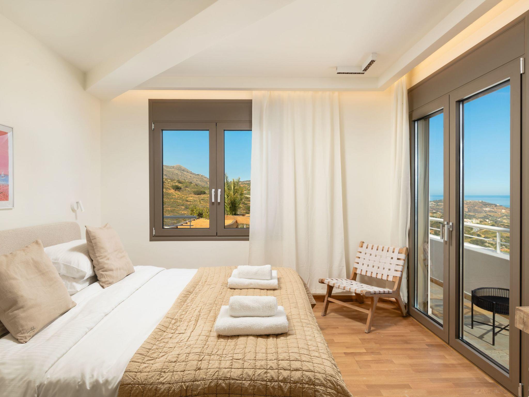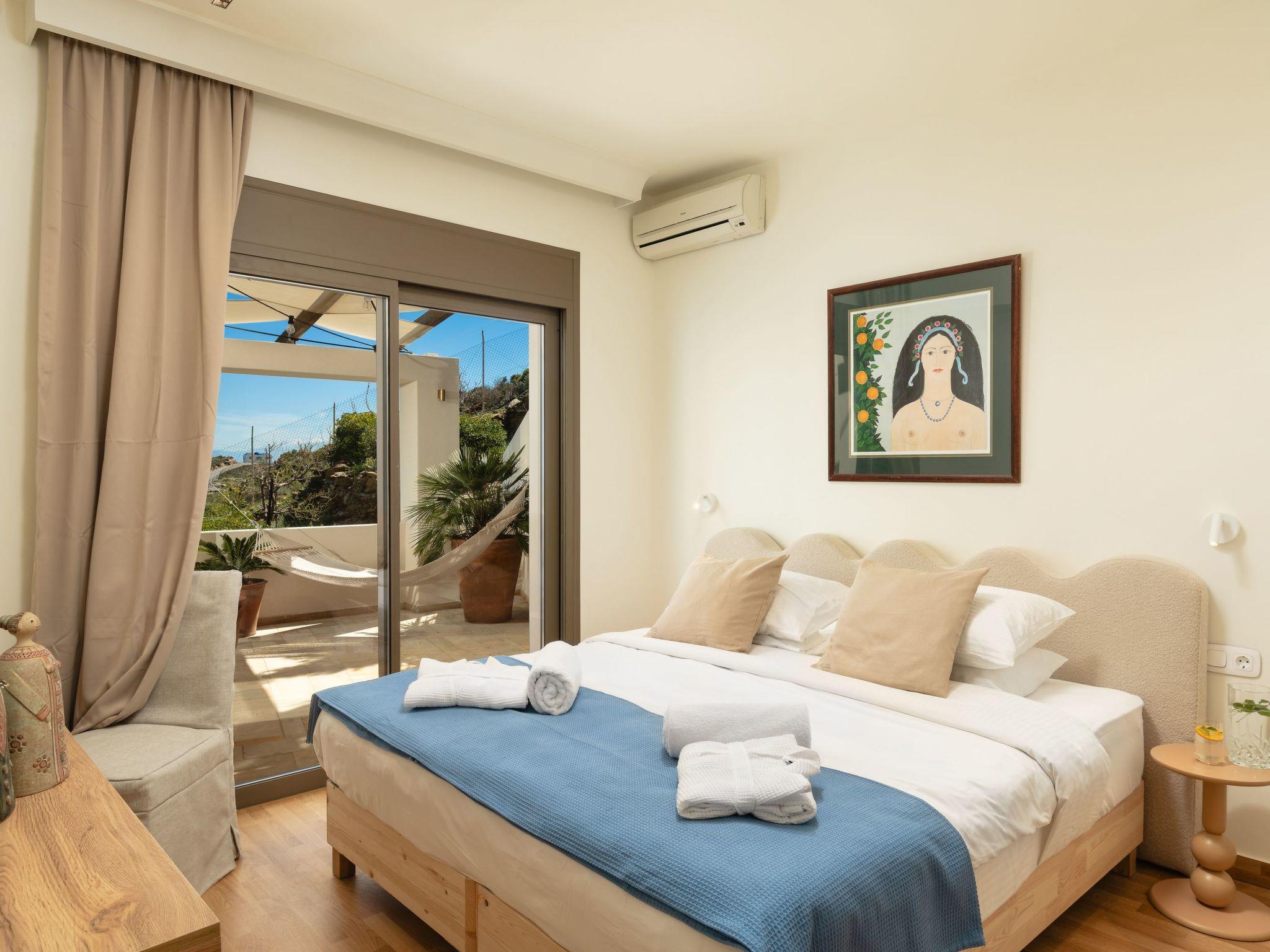 The villa features 6 spacious bedrooms with comfortable beds, all with air conditioning and ensuite or dedicated bathrooms. Enjoy restful nights and wake up to the sound of the Cretan breeze.