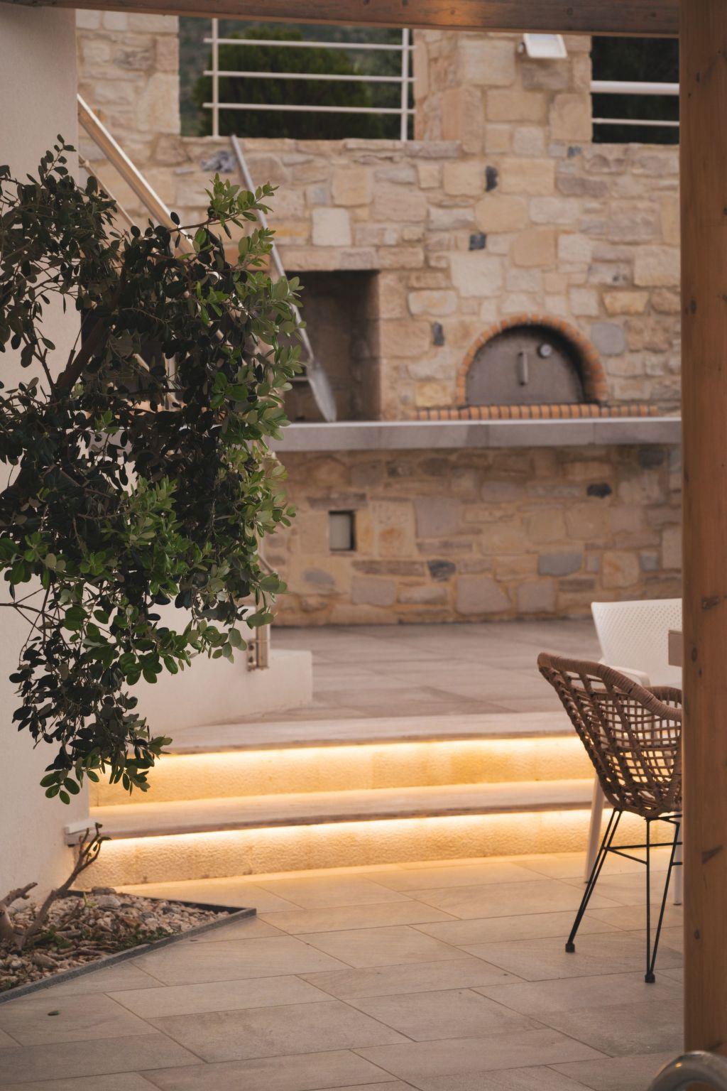 The villa’s built-in BBQ area is perfect for dinner with family and friends. Equipped with a gas grill and generous counter space, it’s ideal for preparing everything for a family feast. A large outdoor dining table sits under a shaded pergola, offering a comfortable spot to enjoy meals while taking in the stunning sea and mountain views. With the pool and hot tub just steps away, it’s the heart of your outdoor living experience.