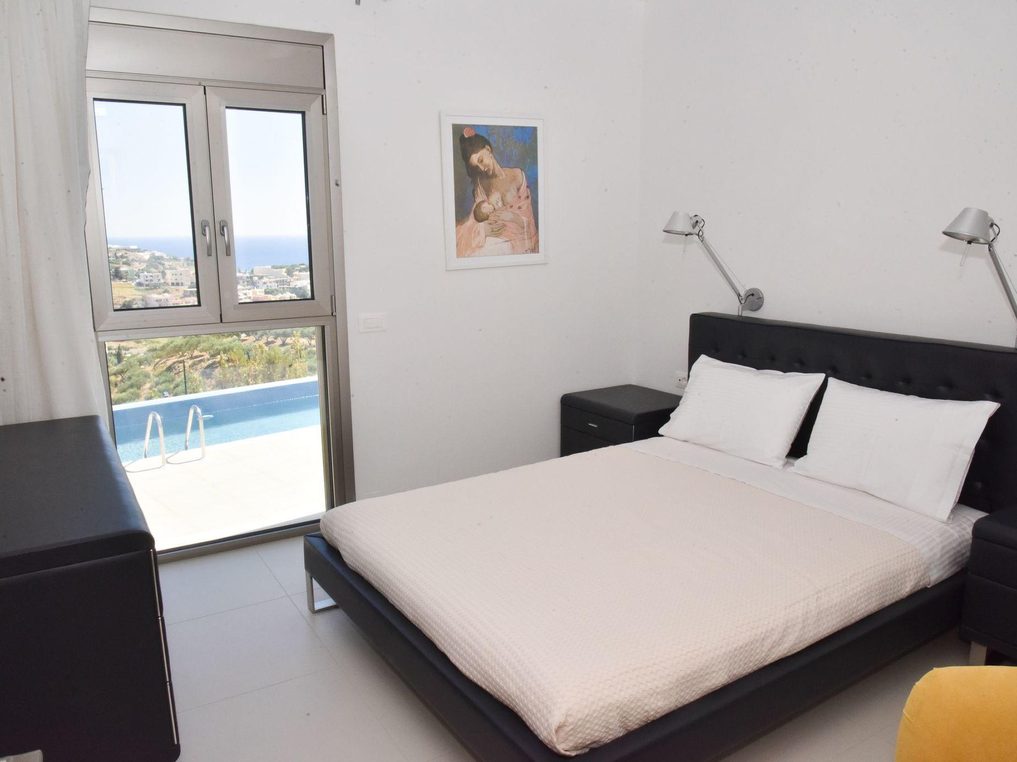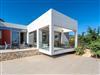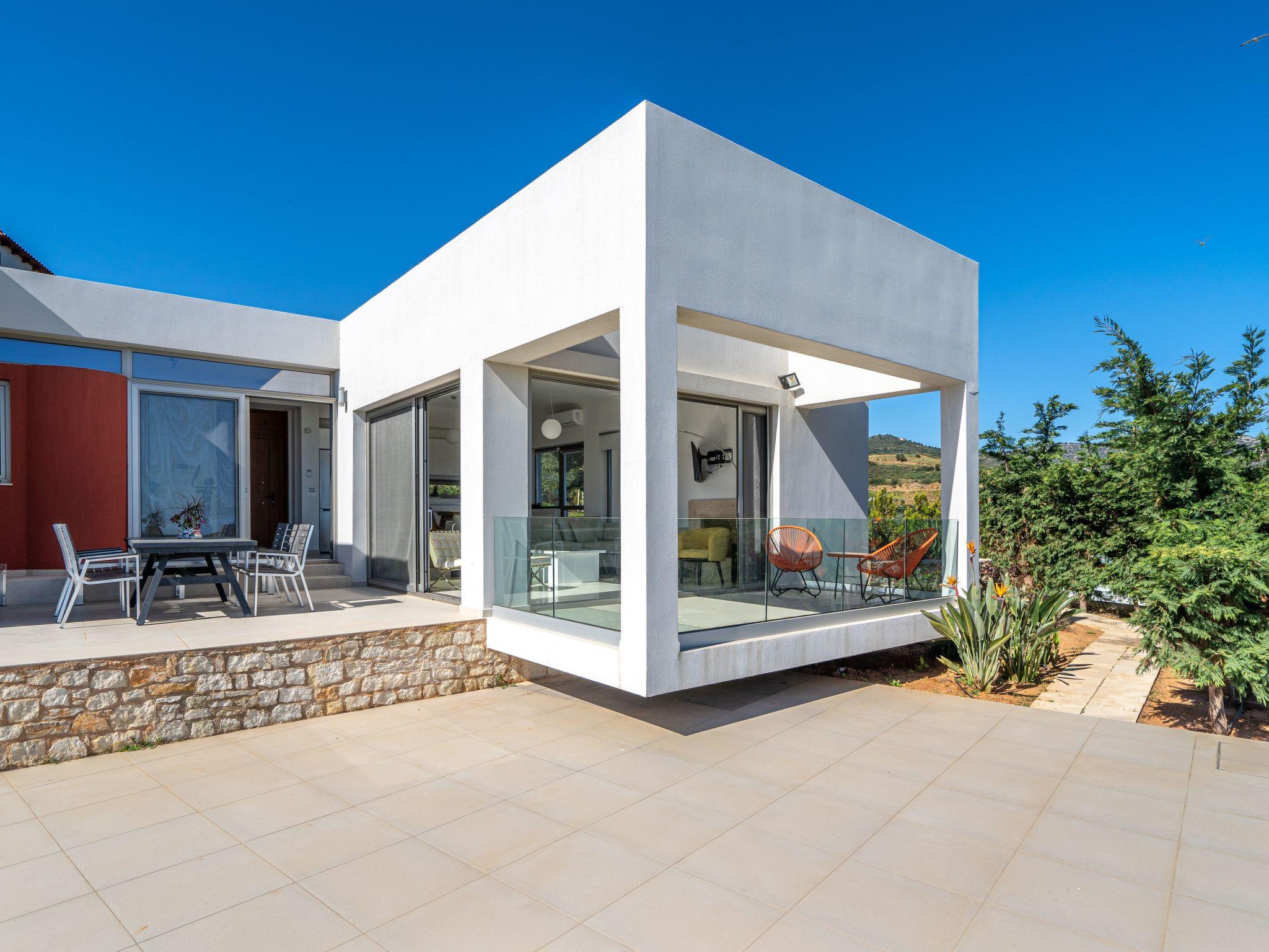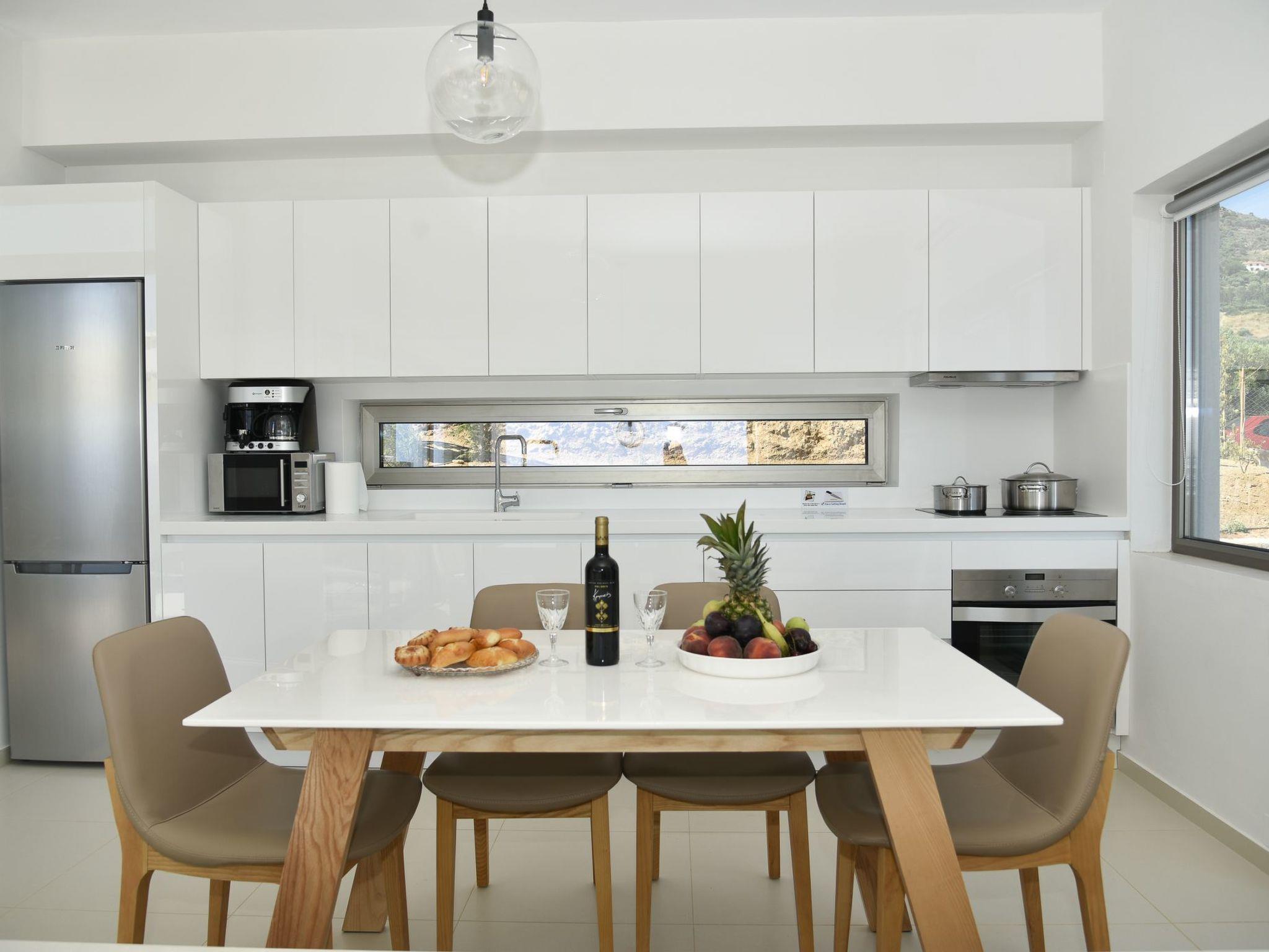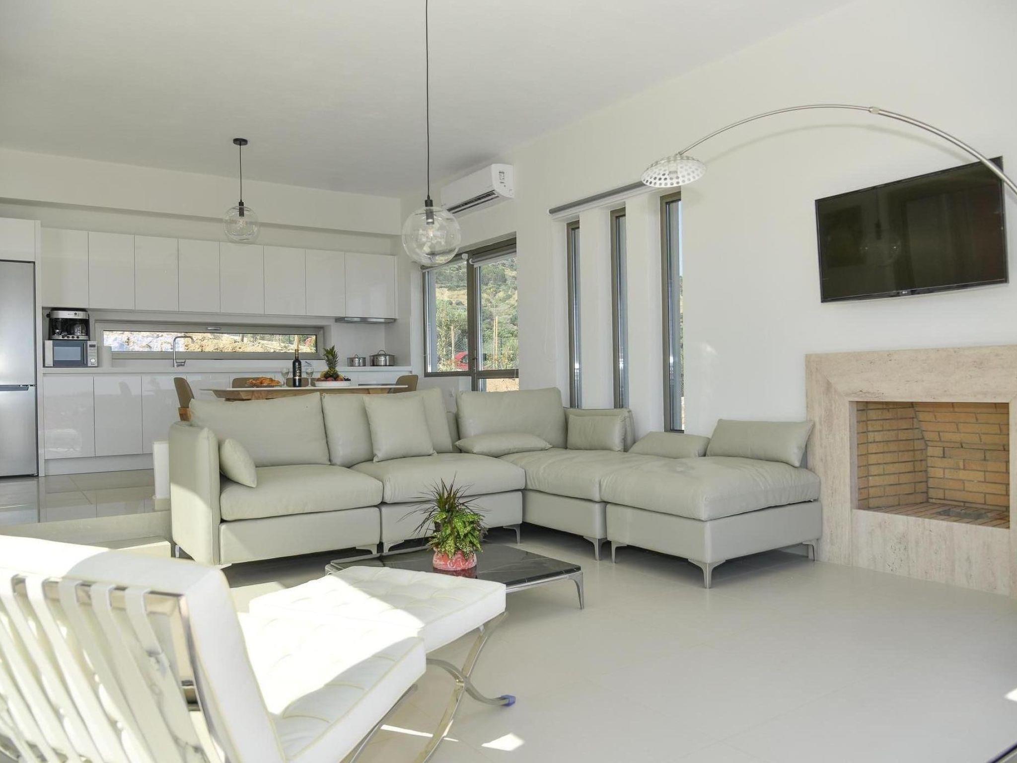 The top modern white villas have only recently been newly built in 2017, and they are designed to blend with the Cretan environment. Each villa is equipped as follows: The single-storey building boast a generous living space of 110 m² and can accommodate six persons. It consists of an open plan living-/dining area with a fully equipped kitchen, three bedrooms and four bathrooms. The living room is furnished with a large sofa, a flat screen TV, a dining table with six chairs and there is an open fireplace for cosy evenings. The white high gloss kitchen is complete with dishwasher, Ceran cooktop, oven, microwave, fridge with freezer compartment, kettle, toaster and coffee machine. The bedrooms offer a double bed each. And the four bedrooms each have a shower, wash basin and a toilet. A washing machine is available and there is internet access throughout the property.