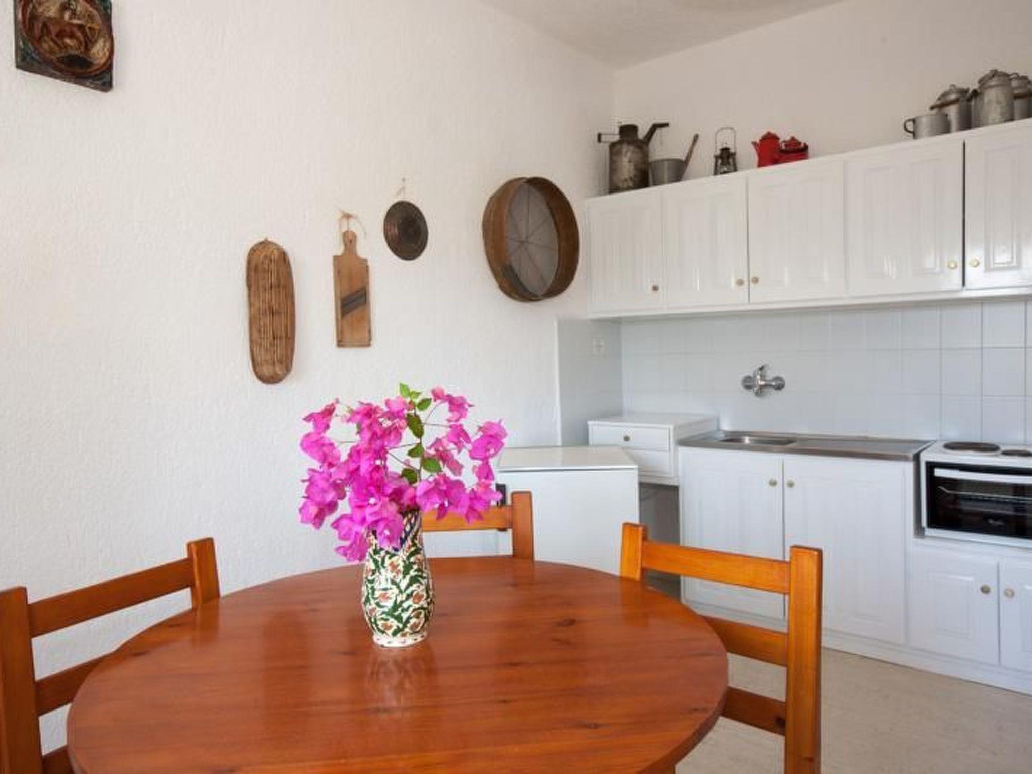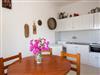 This holiday flat has two bedrooms, one with a double bed (1.60 m x 2.00 m), the other with two single beds (0.90 m x 2.00 m), bedside tables, wardrobe and mirror. The living room is furnished with a canapé, which serves as a fifth sleeping option, table, chairs and TV. From the living room you have access to the large balcony-terrace, from which you have a wonderful view of the sea and the countryside. The kitchen integrated into the living room is fully equipped with upper and lower cupboards, a cooker with electric hobs, fridge, coffee machine and plenty of crockery and cutlery. Bathroom with washbasin, toilet and shower. The flat has a safe, Wi-Fi, television and air conditioning. The furniture in the house is made of solid wood, the bathrooms and kitchens are tiled and the floors are made of beautiful white marble.