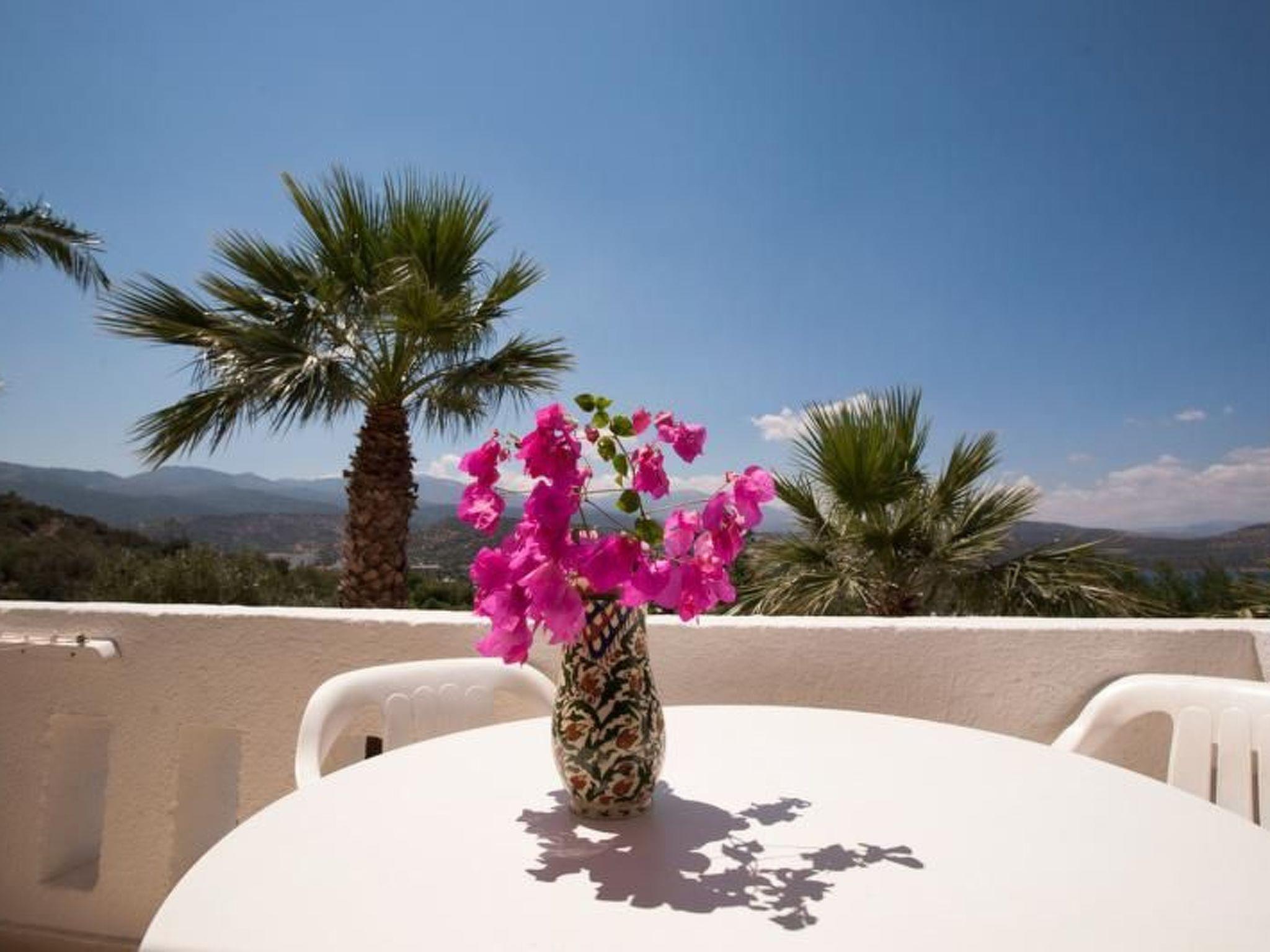 The terraced garden, which is planted with all kinds of colourful flowers and a whole range of different fruit trees (mandarin, orange, apricot, lemon, fig, olive, banana and many more), borders on large pieces of rock which blend in harmoniously, giving the house a majestic appearance. The swimming pool (7 m x 12 m) with children's pool has been generously laid out over an area of approx. 500 square metres. The variety of views and the magic of the landscape never cease to amaze and captivate you. The guests of this property are spoilt with a unique panoramic view of the countless bays of the Mirabello Gulf, all the way to Agios Nikolaos. Tables and chairs are available on the terraces and balconies, all covered with pergolas. In the garden there is a traditional Cretan brick oven with a barbecue area where you can prepare bread and various Greek dishes. Next to it is a marble table with benches. Here you can savour the food you have just prepared under the shade of the trees and the fragrant air. Another pleasure is the marvellous view of the sea from up here. This is an image that will stay with you for a long time. The property is fenced. Your children can run around on this very large property without any worries (there is also a sandpit).
