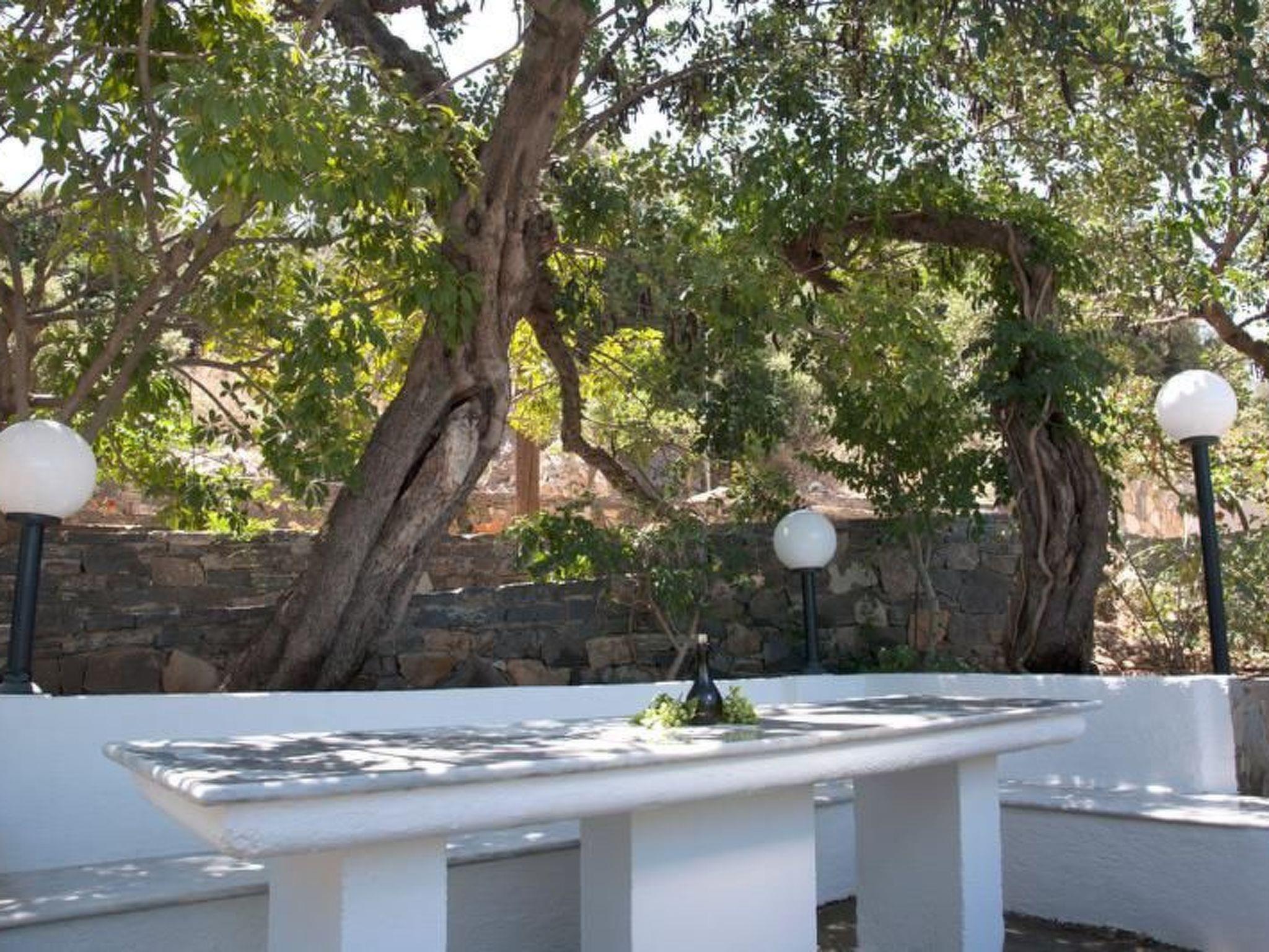 The terraced garden, which is planted with all kinds of colourful flowers and a whole range of different fruit trees (mandarin, orange, apricot, lemon, fig, olive, banana and many more), borders on large pieces of rock which blend in harmoniously, giving the house a majestic appearance. The swimming pool (7 m x 12 m) with children's pool has been generously laid out over an area of approx. 500 square metres. The variety of views and the magic of the landscape never cease to amaze and captivate you. The guests of this property are spoilt with a unique panoramic view of the countless bays of the Mirabello Gulf, all the way to Agios Nikolaos. Tables and chairs are available on the terraces and balconies, all covered with pergolas. In the garden there is a traditional Cretan brick oven with a barbecue area where you can prepare bread and various Greek dishes. Next to it is a marble table with benches. Here you can savour the food you have just prepared under the shade of the trees and the fragrant air. Another pleasure is the marvellous view of the sea from up here. This is an image that will stay with you for a long time. The property is fenced. Your children can run around on this very large property without any worries (there is also a sandpit).