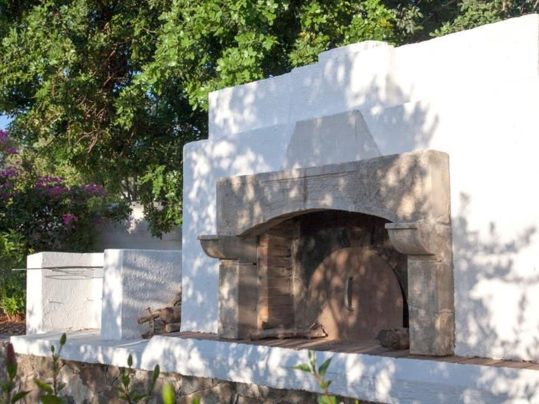 The terraced garden, which is planted with all kinds of colourful flowers and a whole range of different fruit trees (mandarin, orange, apricot, lemon, fig, olive, banana and many more), borders on large pieces of rock which blend in harmoniously, giving the house a majestic appearance. The swimming pool (7 m x 12 m) with children's pool has been generously laid out over an area of approx. 500 square metres. The variety of views and the magic of the landscape never cease to amaze and captivate you. The guests of this property are spoilt with a unique panoramic view of the countless bays of the Mirabello Gulf, all the way to Agios Nikolaos. Tables and chairs are available on the terraces and balconies, all covered with pergolas. In the garden there is a traditional Cretan brick oven with a barbecue area where you can prepare bread and various Greek dishes. Next to it is a marble table with benches. Here you can savour the food you have just prepared under the shade of the trees and the fragrant air. Another pleasure is the marvellous view of the sea from up here. This is an image that will stay with you for a long time. The property is fenced. Your children can run around on this very large property without any worries (there is also a sandpit).