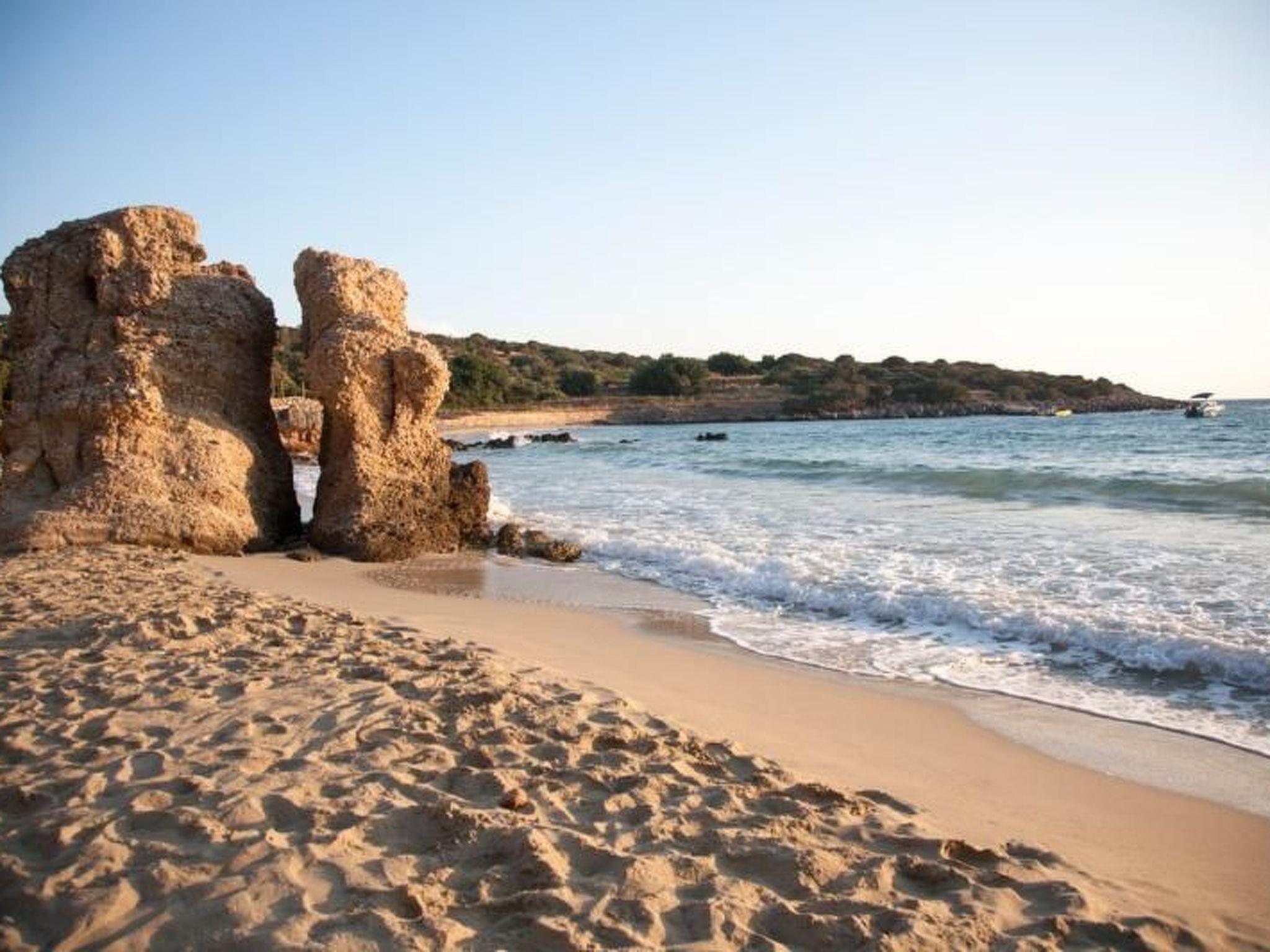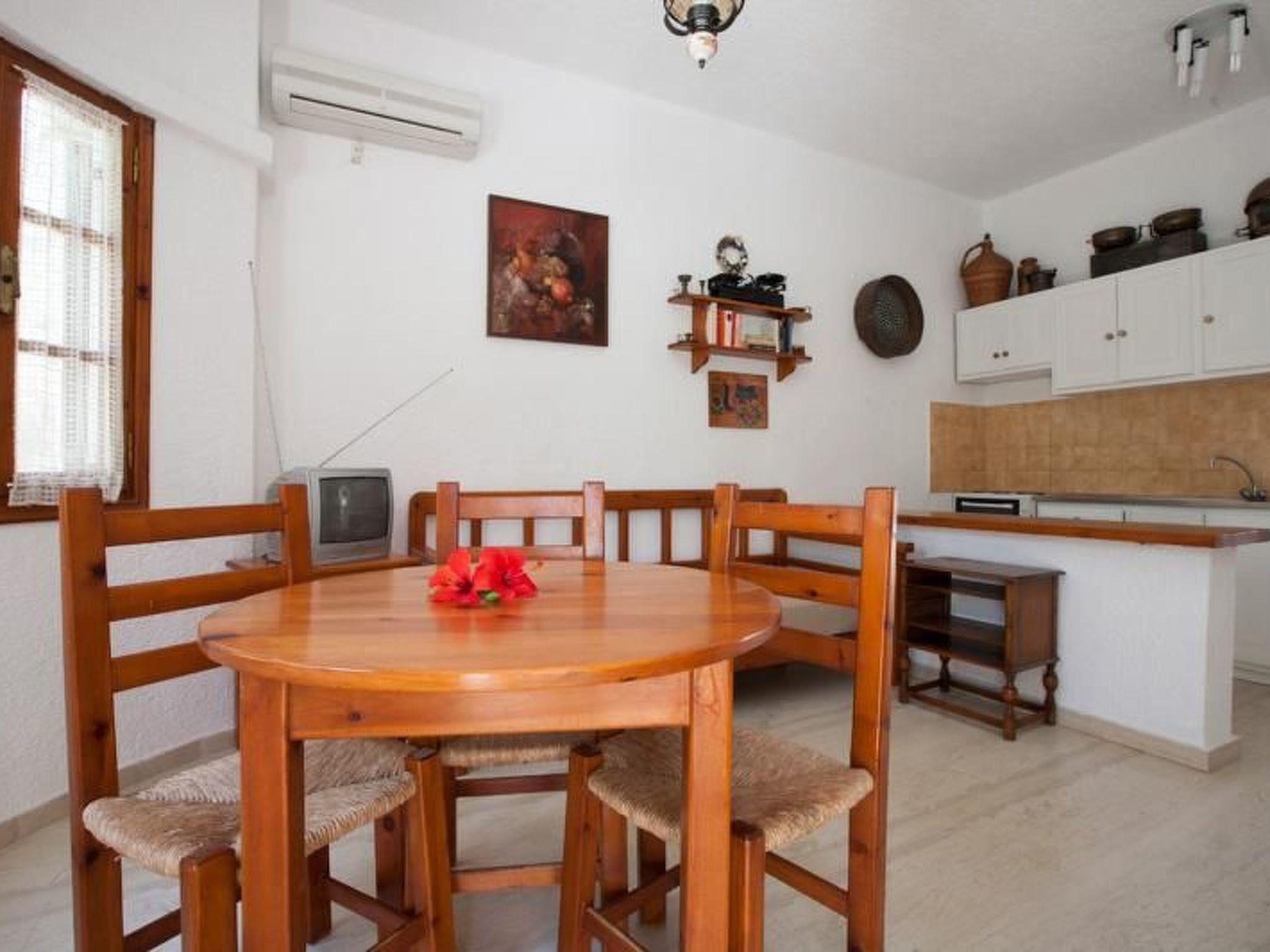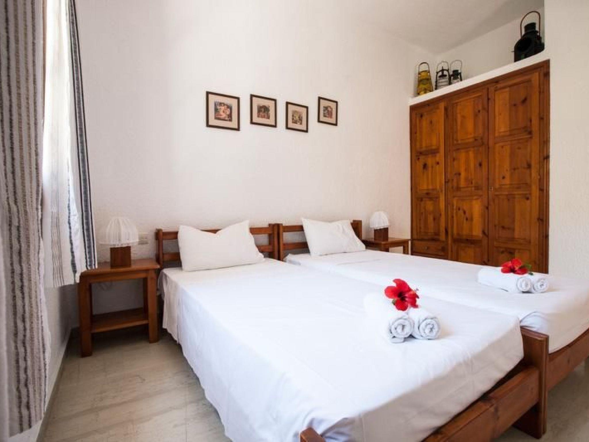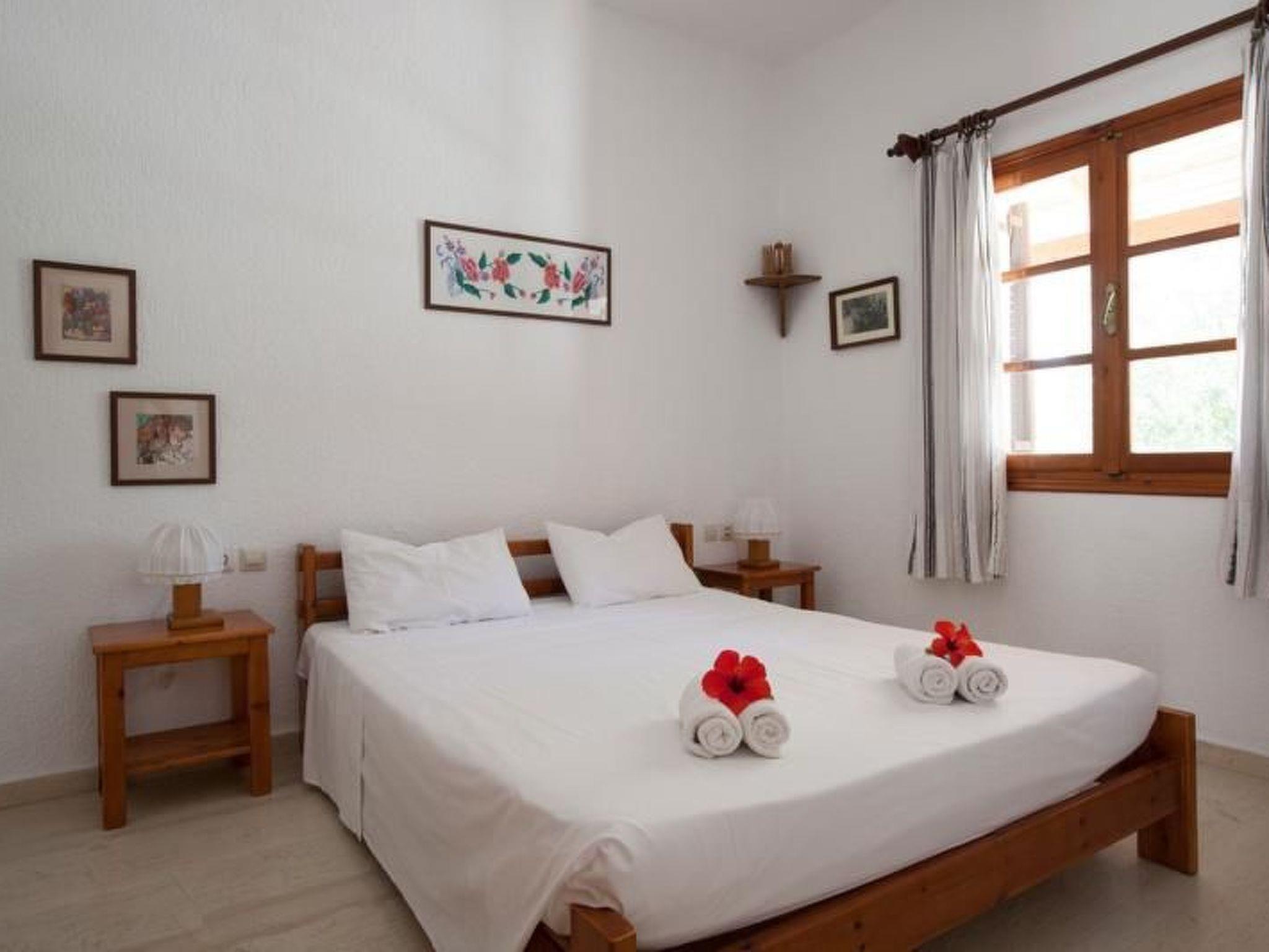 This apartment provides two bedrooms, one with two single beds (90 x 200cm), the other with a double bed (160 x 200cm). There are also bedside tables, a wardrobe and a mirror with a stool. The living room provides a table, chairs and a sofa, which can also be used as a bed for a fifth person, with access to the generous terrace with a table and chairs. The kitchen is separated visually from the living room by a low wall and is equipped with wall and floor cupboards, a sink, fridge, coffee machine, stove with electric rings, and ample cutlery and crockery. The bathroom has a shower, toilet and washbasin. There is a second terrace to the rear of the house, right in front of a colourful oasis of flowers.