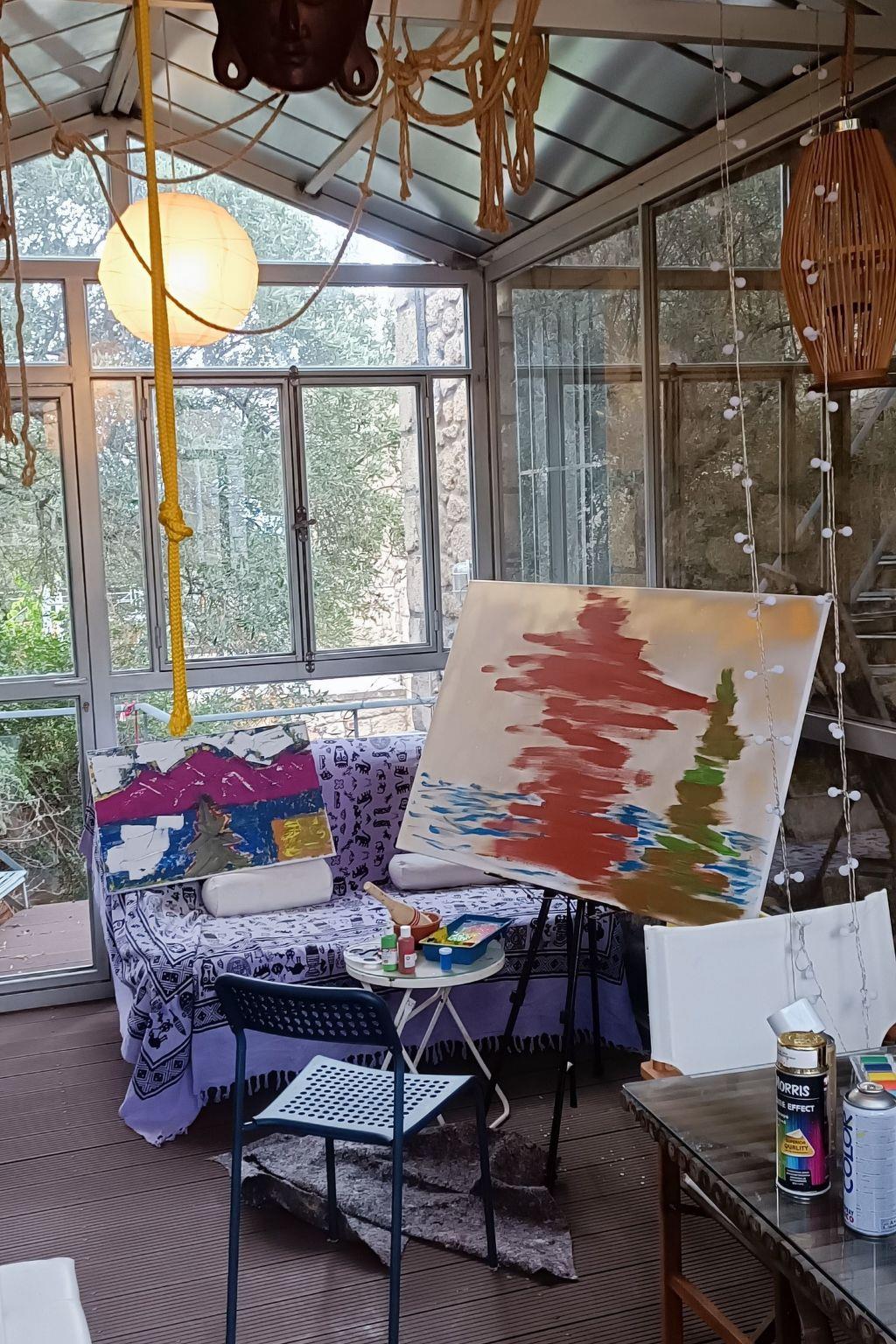 You reach the studio via a spiral staircase. A glass structure between the house and the rock. You can also spend the night there in summer. Easel, hand basin, dry WC, table and bed.