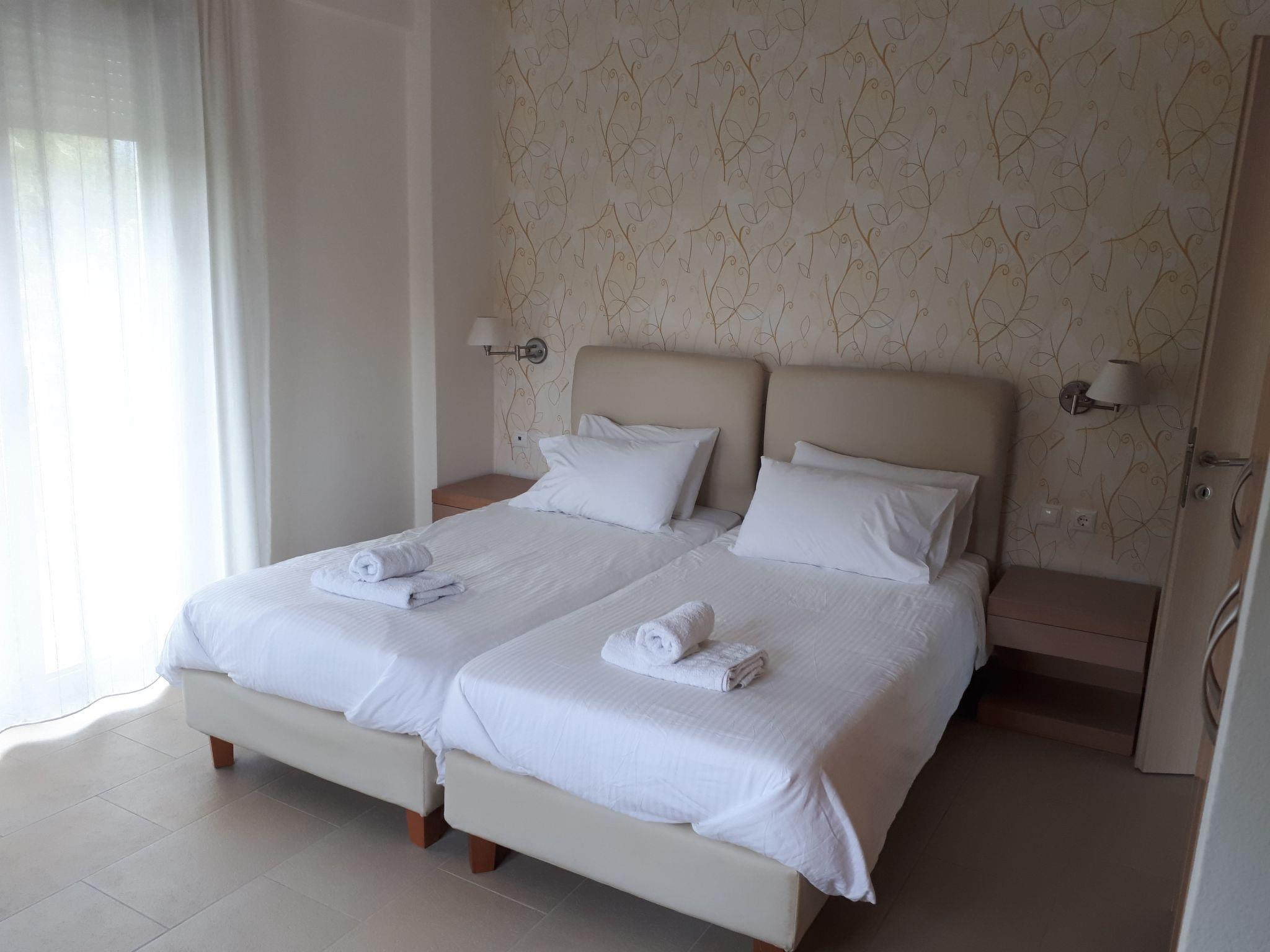 When entering Villa Irini, you can see the living room, the kitchen and the dining area. On the ground floor you will also find a twin bedroom and a shower/WC. On the first floor there is the master bedroom that includes a large bathroom with HydroJet massage, and there is also a twin bedroom with shower/WC. Bathrobes, beach towels, toiletries and slippers are provided. The villas are fully air conditioned and equipped with free Wi-Fi, TV & Home-Cinema. All have a living room with a fireplace and kitchen with washing machine, electric oven, microwave, fridge / freezer and toaster.