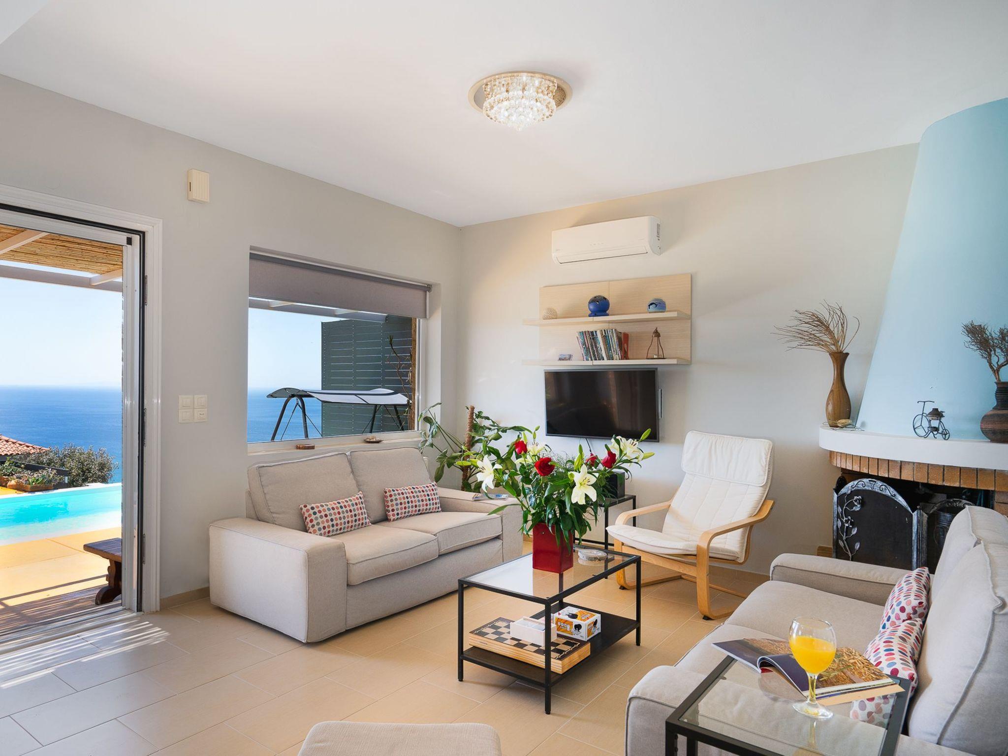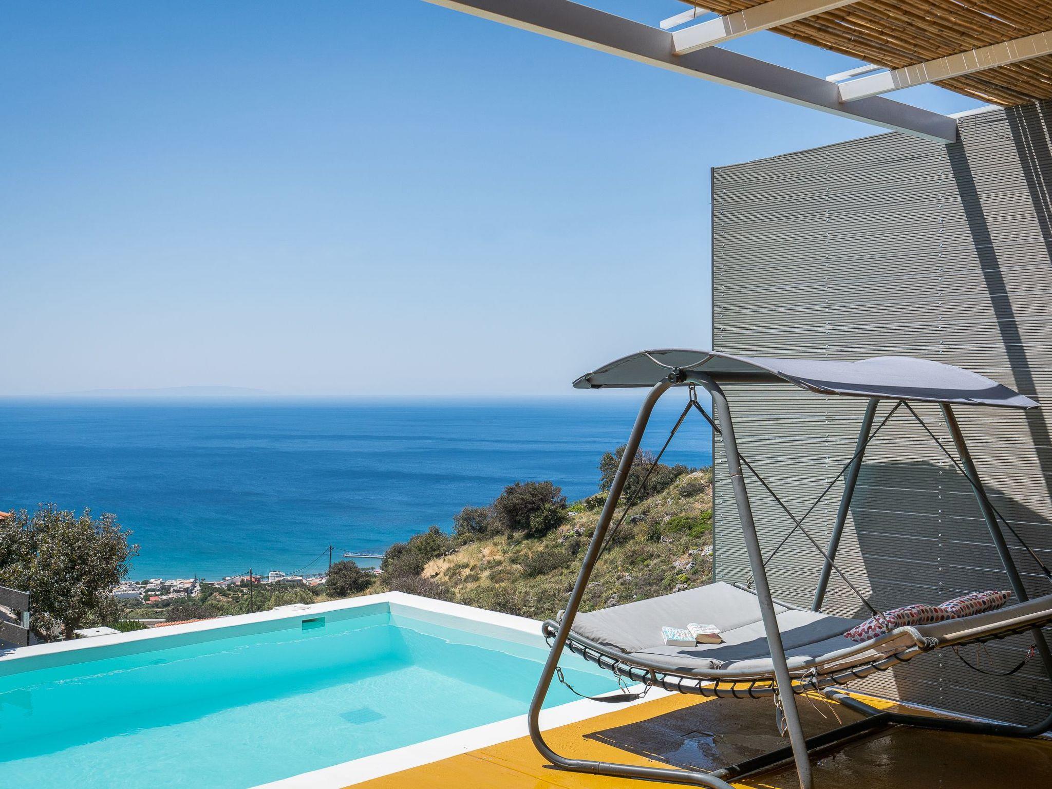 Mirthios Panorama Villa is a newly built three-bedroom villa that guarantees a very special holiday to remember. It’s light, it’s modern and the holiday-feel it exudes is tactile. This comfortable vacation villa boasts excellent facilities and access to a garden with an outdoor swimming pool and spectacular views of the bay of Plakias. Inside, Mirthios Panorama Villa is modern, bright and open with comfortable living areas and tastefully designed bedrooms for comfort with their own balconies. The beautiful kitchen is fully equipped and has everything you need to make a great dinner or a quick snack while enjoying the views from the windows. The open plan living area with cosy couches offers a beautiful setting to rest and unwind with your favorite reads, while the fireplace provides great heating if you’re visiting in winter months. Outside on the pool terrace, the Mirthios Panorama Villa boasts spacious grounds built on levels with a private infinity pool overlooking the vast Libyan Pelagos beyond. The roof relax lounge really shows off the panoramic views available from this great location with gorgeous Mediterranean views– the perfect spot for a sundowner while you soak in the sunset! Admire the panoramic views of the Libyan Sea and the wild rugged nature of the surrounding mountains from your balcony. This villa provides friendly service and its guest felt comfortable and more than welcomed.