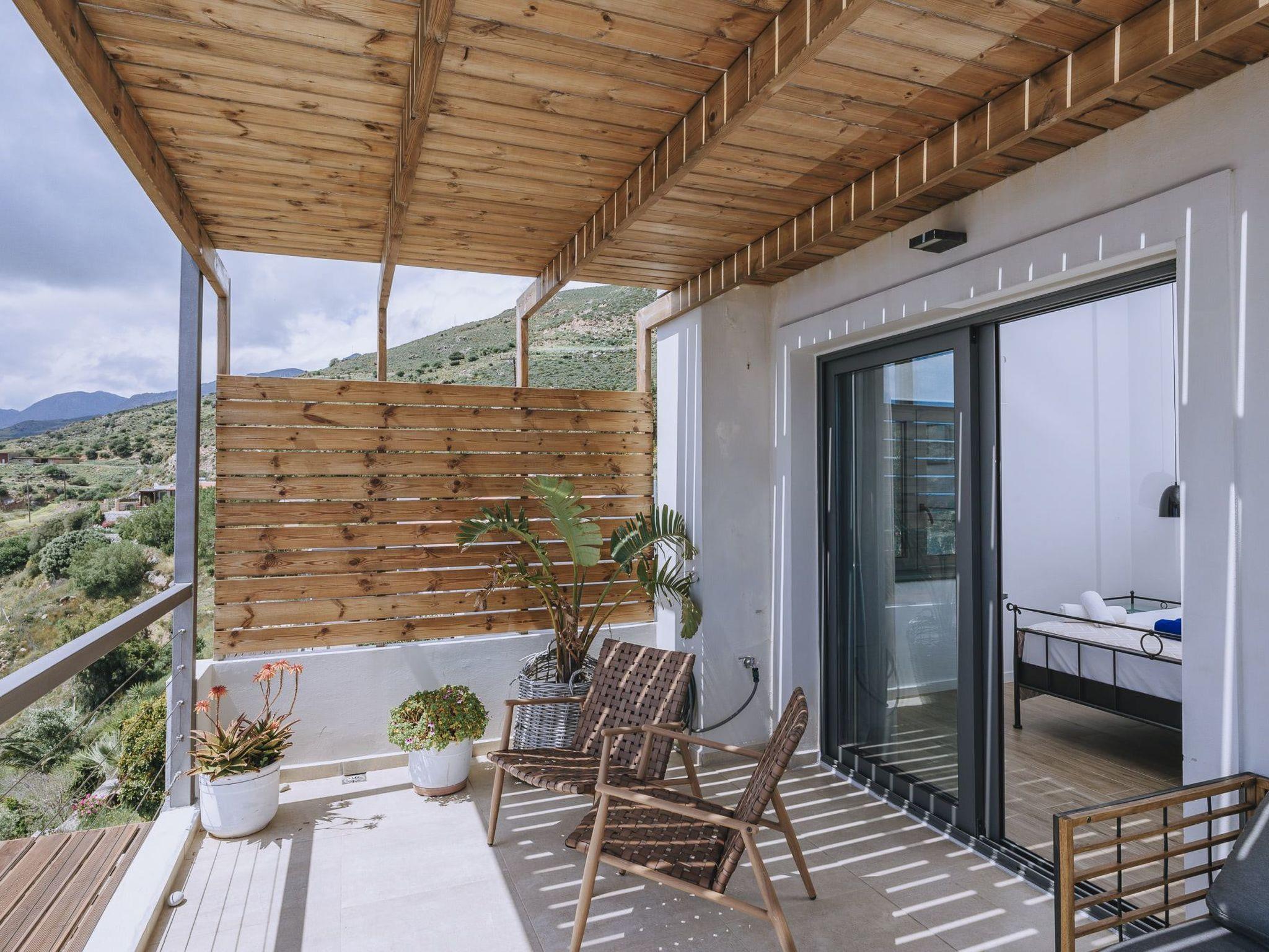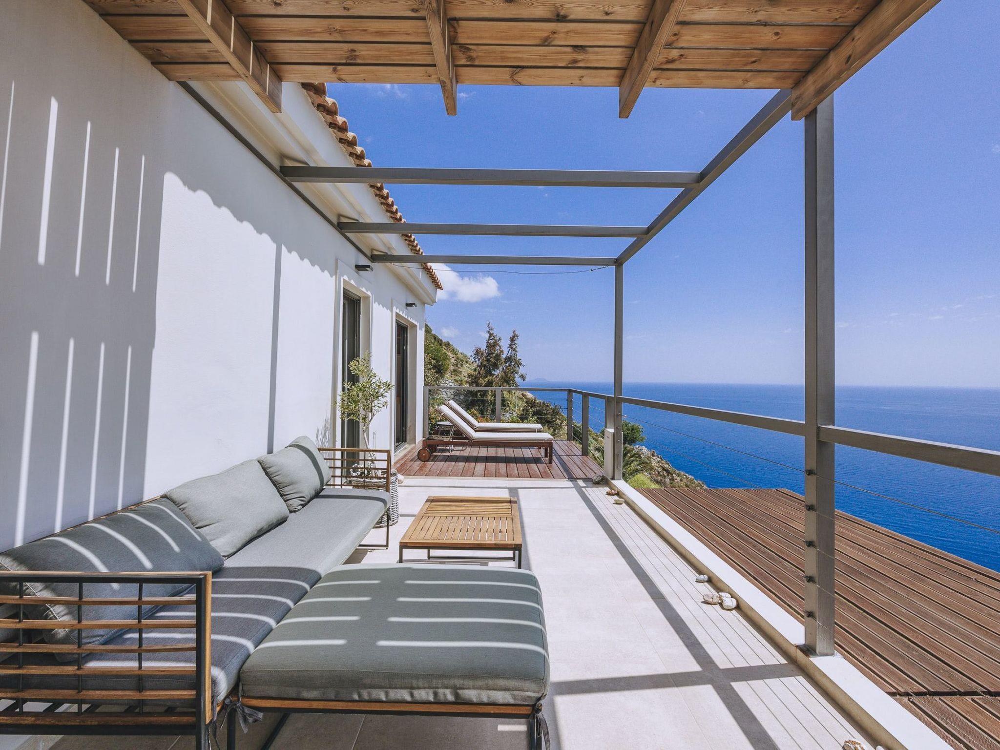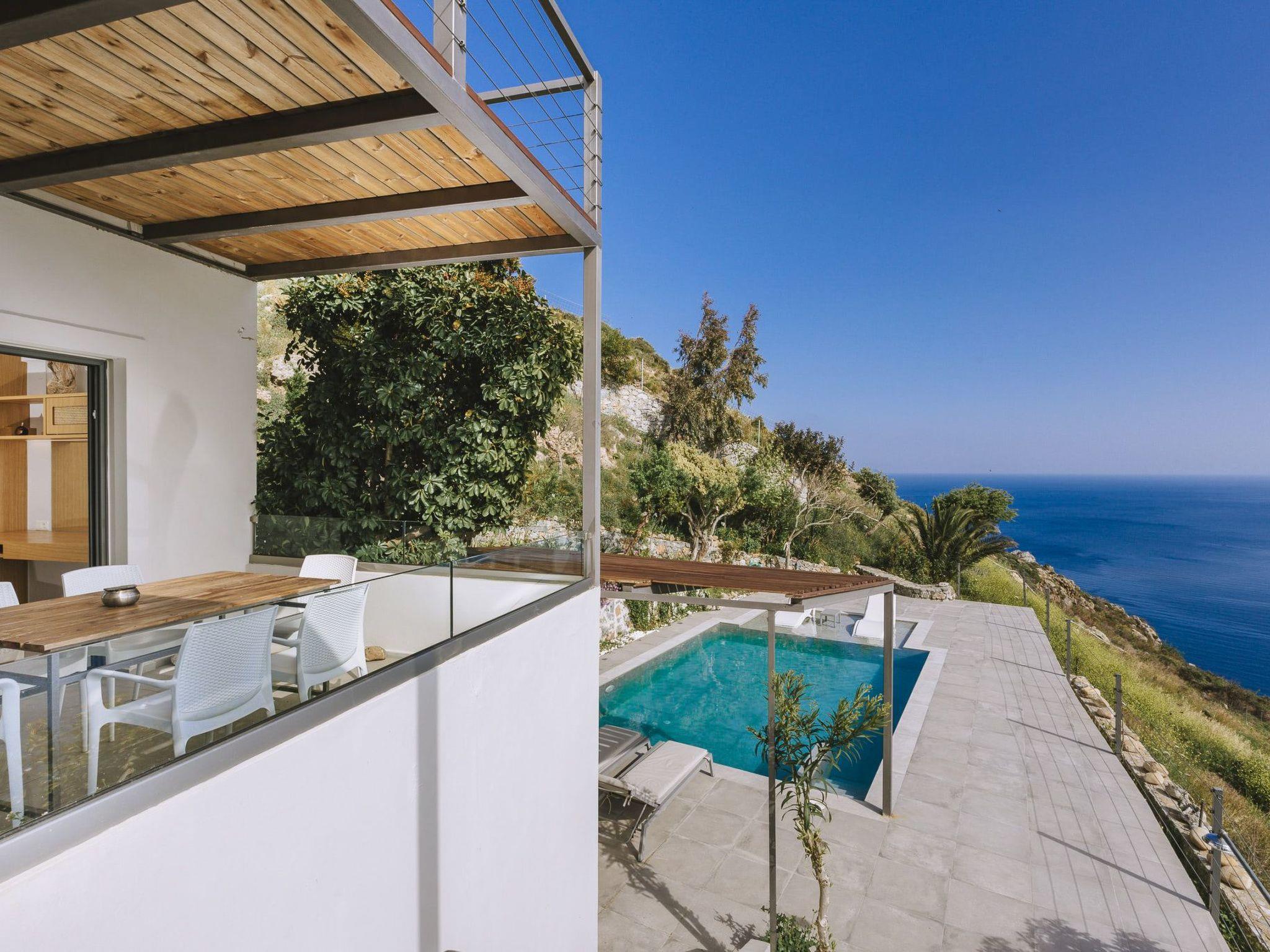 This Greek holiday villa is in the popular tourist destination of Rodakino (which translates to “Peach”), in South Crete. The luxury villa is also close to the quaint village of Plakias and is a great base from which to explore numerous Cretan attractions. Villa Spiros boasts classy, contemporary aesthetics and breathtaking sea views. Villa Spiros’s lounge is elegantly furnished and fitted out with a large TV and trendy sofas. The open-plan design of the villa’s living area has the dining and kitchen areas adjacent to the lounge, both tastefully furnished and equipped with all the modern essentials. The holiday home’s living area has large glass doors leading to a shaded balcony with an outdoor dining space and a private swimming pool area with sunbeds, umbrellas, a hammock, and a shower. This luxury holiday rental also offers access to a ping pong table and a vineyard. Villa Spiros has 3 fashionably decorated bedrooms, each boasting stylish and convenient desk and wardrobe spaces. The first is a single bedroom on the ground floor and is home to one bed. The other two bedrooms are on the top floor and have two combined twin beds in each, with glass doors and a spacious balcony providing magnificent sea views. There is a full bathroom on each floor and a storeroom with a safe-deposit box on the ground floor. The Spiros luxury holiday villa offers guests a welcome pack of fresh fruit, wine, and coffee capsules to enjoy on arrival. A cleaning service is available 3 to 4 days per week as required and there is private parking for 1 vehicle. Plan your luxury holiday at Villa Spiros and sit back as its sophistication and charm make all your Greek getaway dreams come true!