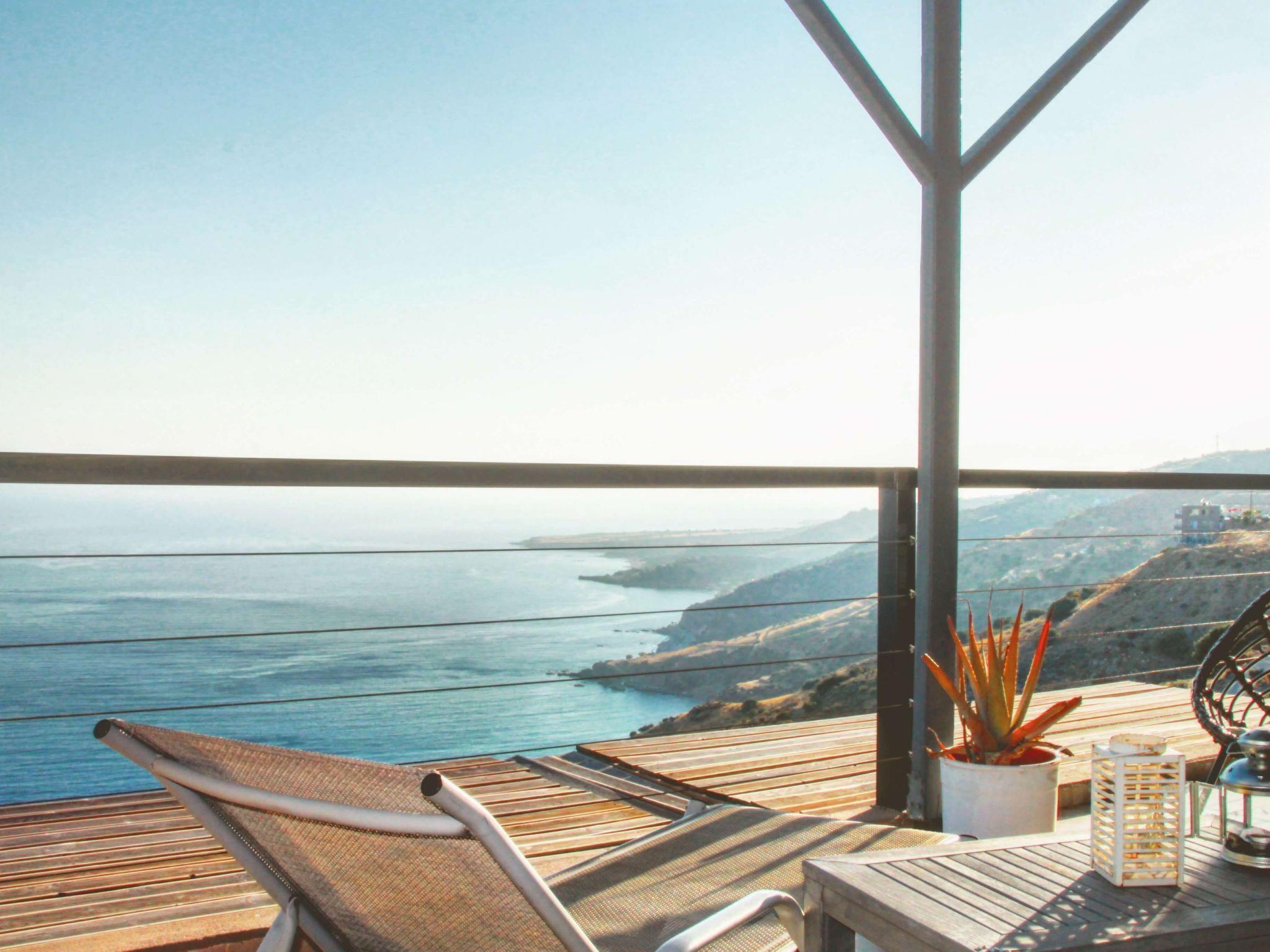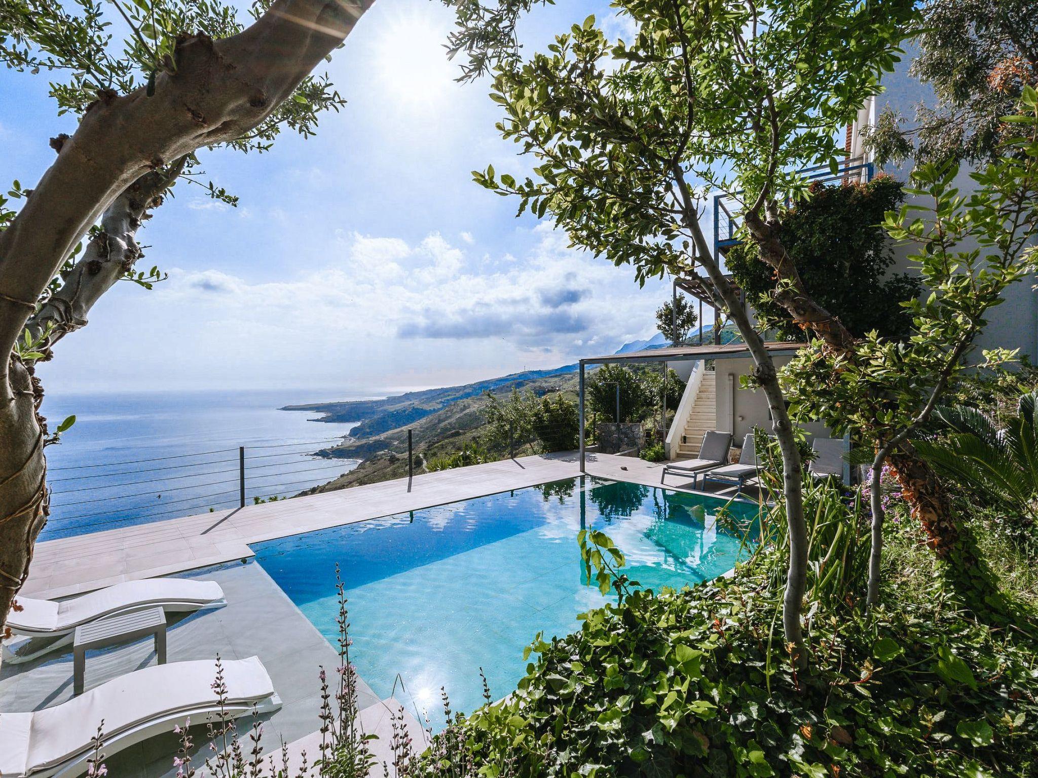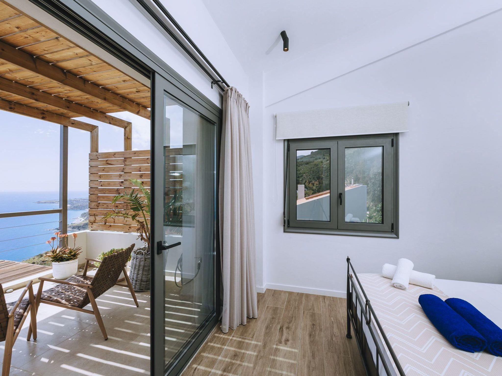 This Greek holiday villa is in the popular tourist destination of Rodakino (which translates to “Peach”), in South Crete. The luxury villa is also close to the quaint village of Plakias and is a great base from which to explore numerous Cretan attractions. Villa Spiros boasts classy, contemporary aesthetics and breathtaking sea views. Villa Spiros’s lounge is elegantly furnished and fitted out with a large TV and trendy sofas. The open-plan design of the villa’s living area has the dining and kitchen areas adjacent to the lounge, both tastefully furnished and equipped with all the modern essentials. The holiday home’s living area has large glass doors leading to a shaded balcony with an outdoor dining space and a private swimming pool area with sunbeds, umbrellas, a hammock, and a shower. This luxury holiday rental also offers access to a ping pong table and a vineyard. Villa Spiros has 3 fashionably decorated bedrooms, each boasting stylish and convenient desk and wardrobe spaces. The first is a single bedroom on the ground floor and is home to one bed. The other two bedrooms are on the top floor and have two combined twin beds in each, with glass doors and a spacious balcony providing magnificent sea views. There is a full bathroom on each floor and a storeroom with a safe-deposit box on the ground floor. The Spiros luxury holiday villa offers guests a welcome pack of fresh fruit, wine, and coffee capsules to enjoy on arrival. A cleaning service is available 3 to 4 days per week as required and there is private parking for 1 vehicle. Plan your luxury holiday at Villa Spiros and sit back as its sophistication and charm make all your Greek getaway dreams come true!