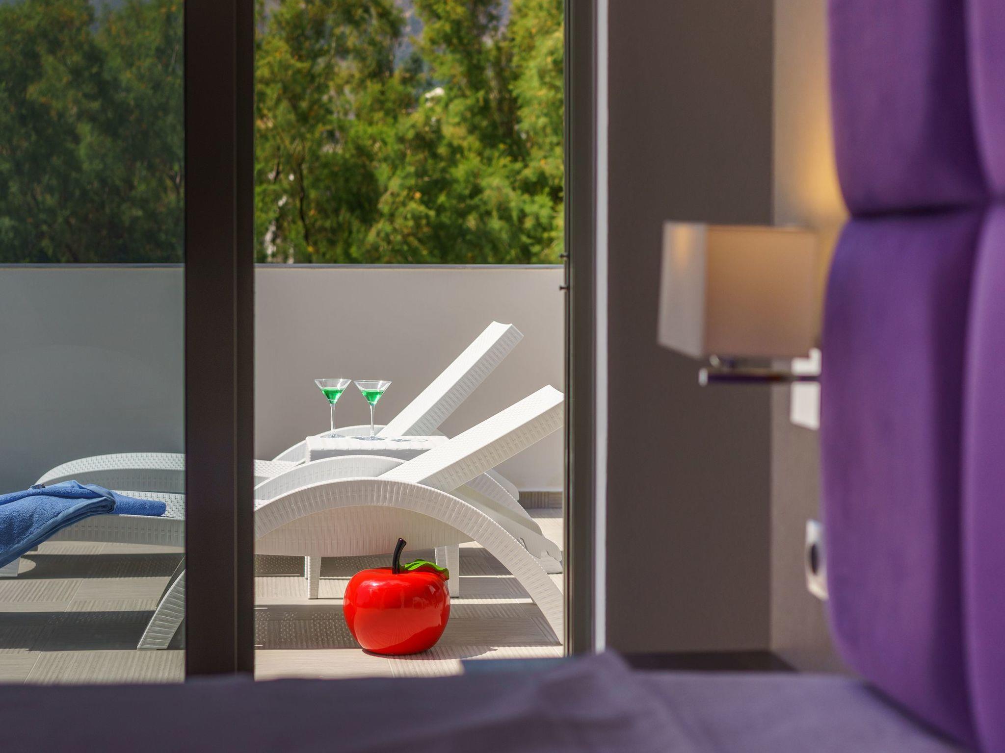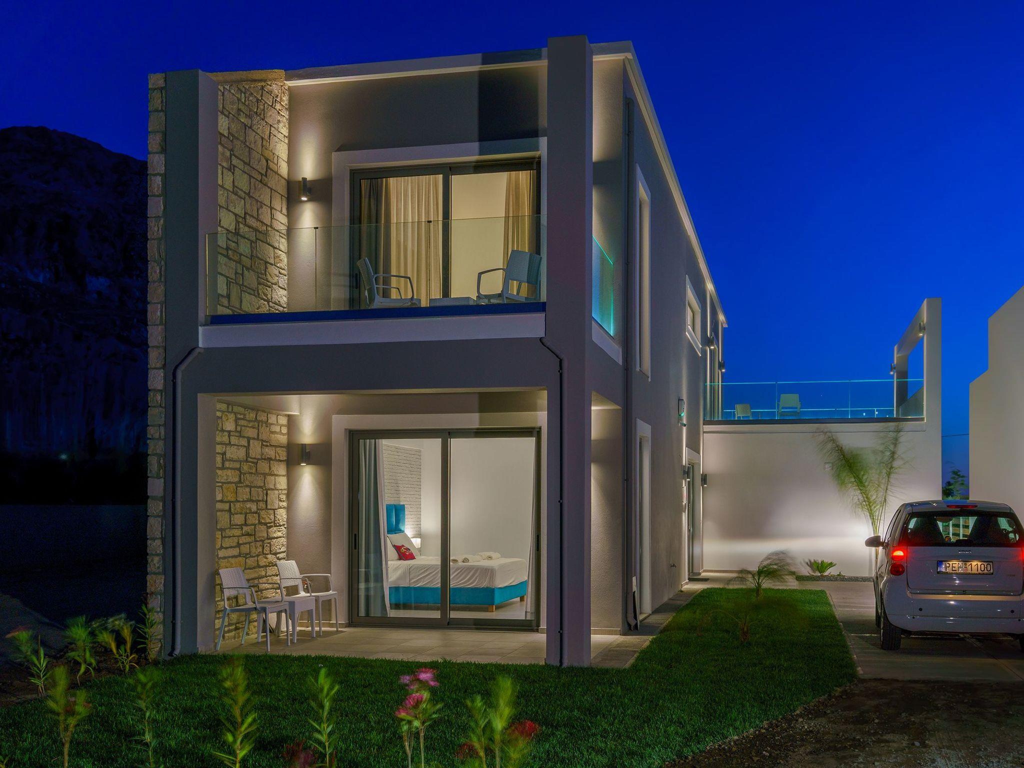 Iakinthos residence consists of two floors with a total area of 170 sq m., and it can host up to six (6) people +1 sofa bed. At the ground floor, there is a large, fully equipped kitchen with a dining table, a spacious living room with comfortable sofas, and a large satellite TV. On the same floor, there is also a master bedroom with an ensuite bathroom. A staircase leads to the first floor, where there are two more master bedrooms with ensuite bathrooms and a large balcony where you can enjoy the unobstructed view of the sea. All bedrooms are equipped with king-size beds and closets. All bathrooms in the residence have a modern design and are equipped with high-quality bathroom amenities. A washing machine is also provided. Outdoors, there is a 28 sq m. private swimming pool with deck chairs where you can relax under the Cretan sun and prepare a meal in the stone barbecue. The pool is surrounded by a beautiful garden with local plants. A parking space for your car is also available. Housekeeping is provided twice a week (or upon request). A baby cot and high chair are available on request without charge. Check out is 11:00 latest, and check in is 15:00.