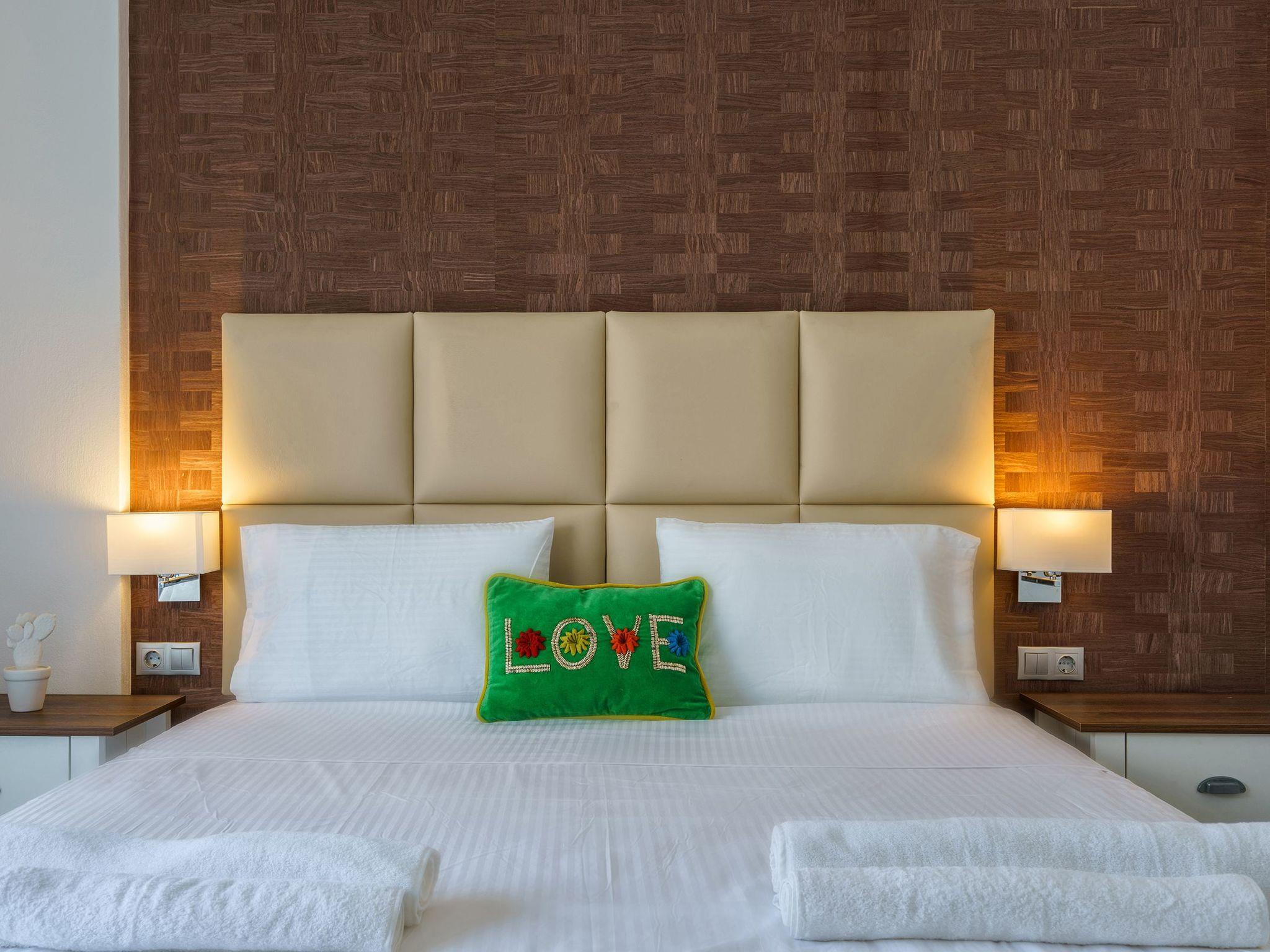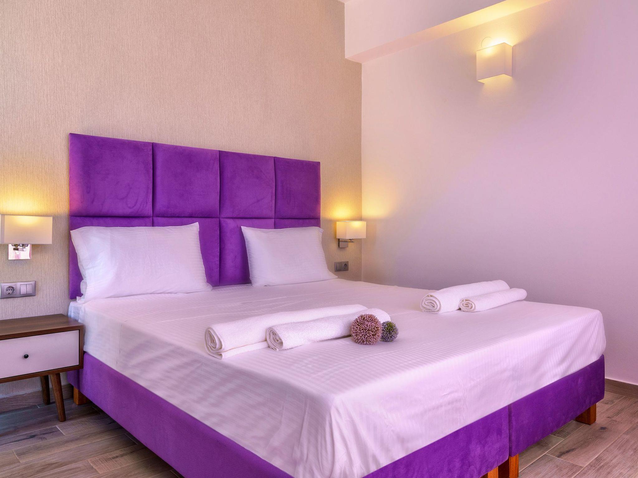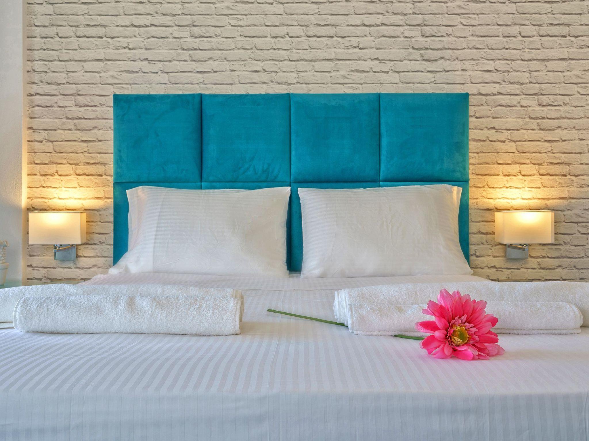 The residences are right on the beautiful sandy beach of Paligremnos. The beach is organized with umbrellas and sun beds, and the water is crystal clear.