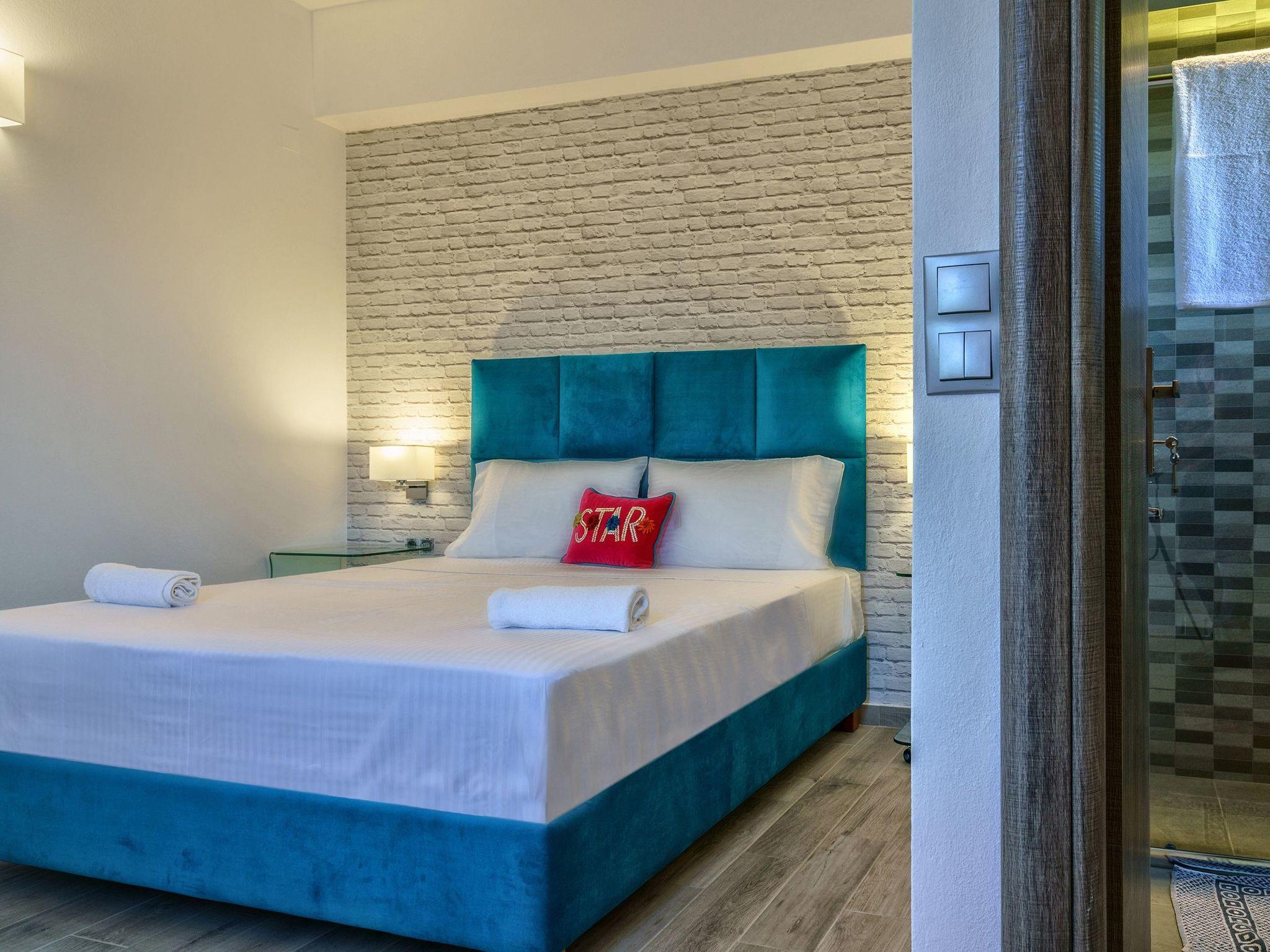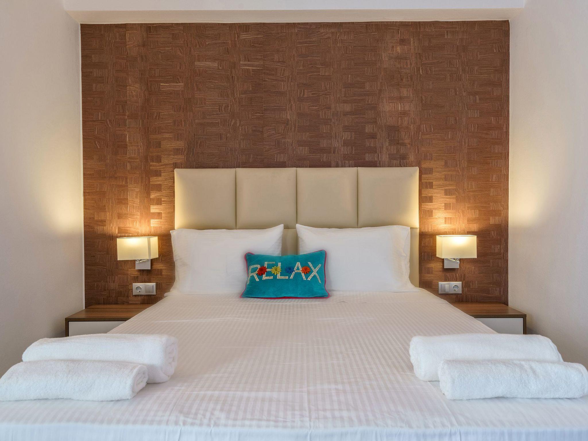 The residences are right on the beautiful sandy beach of Paligremnos. The beach is organized with umbrellas and sun beds and the water is crystal clear.