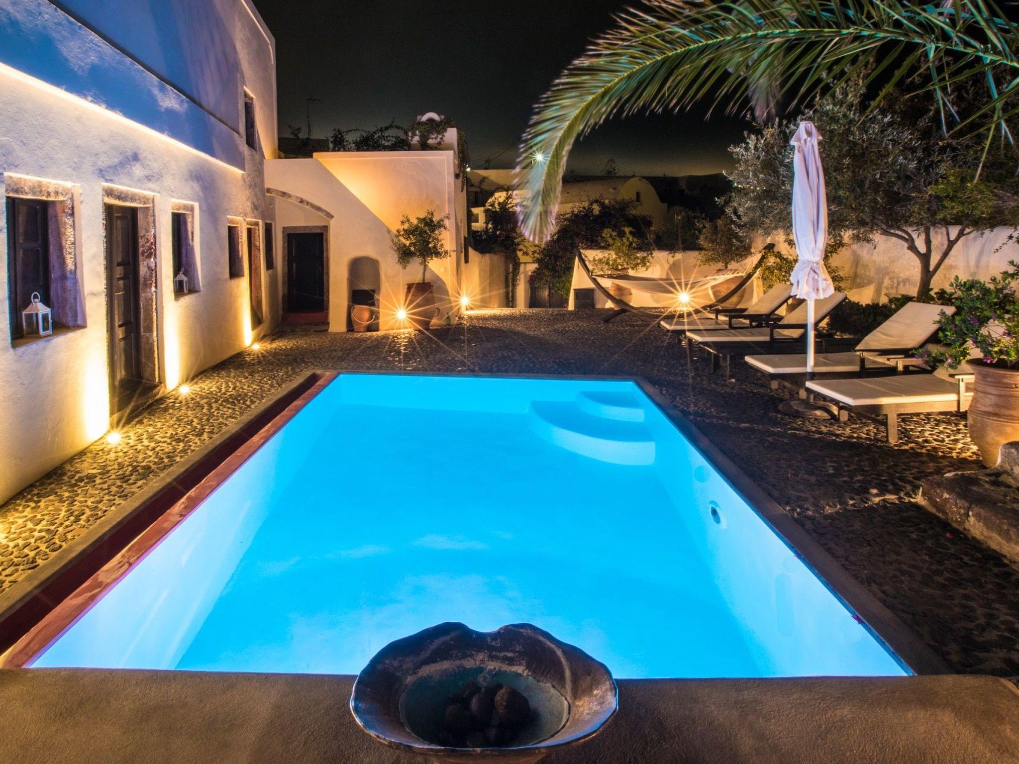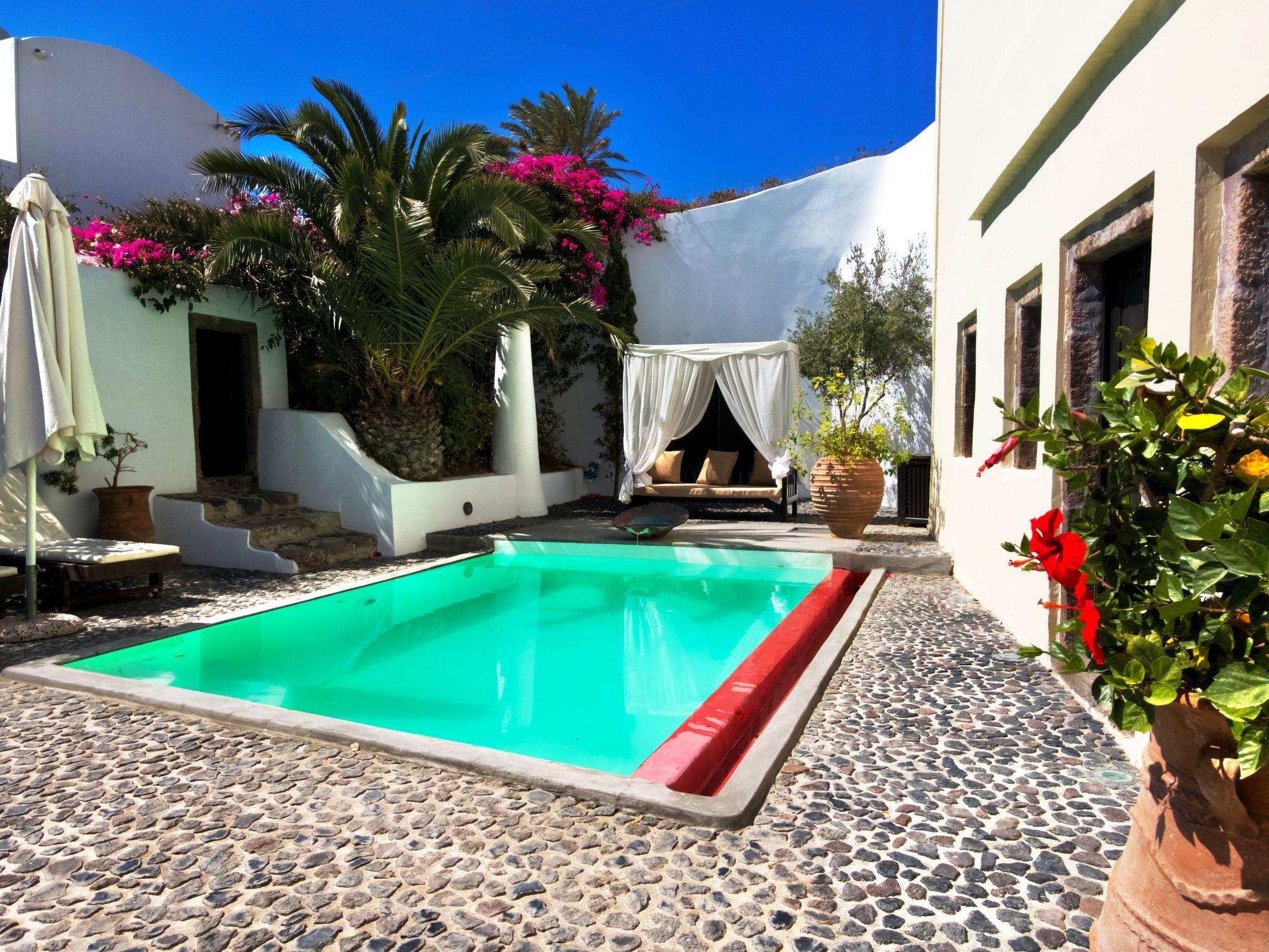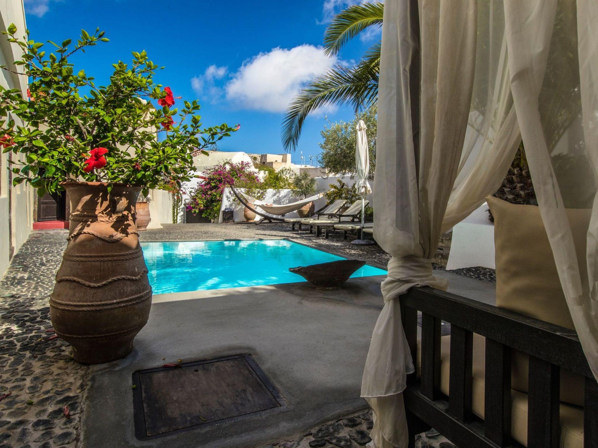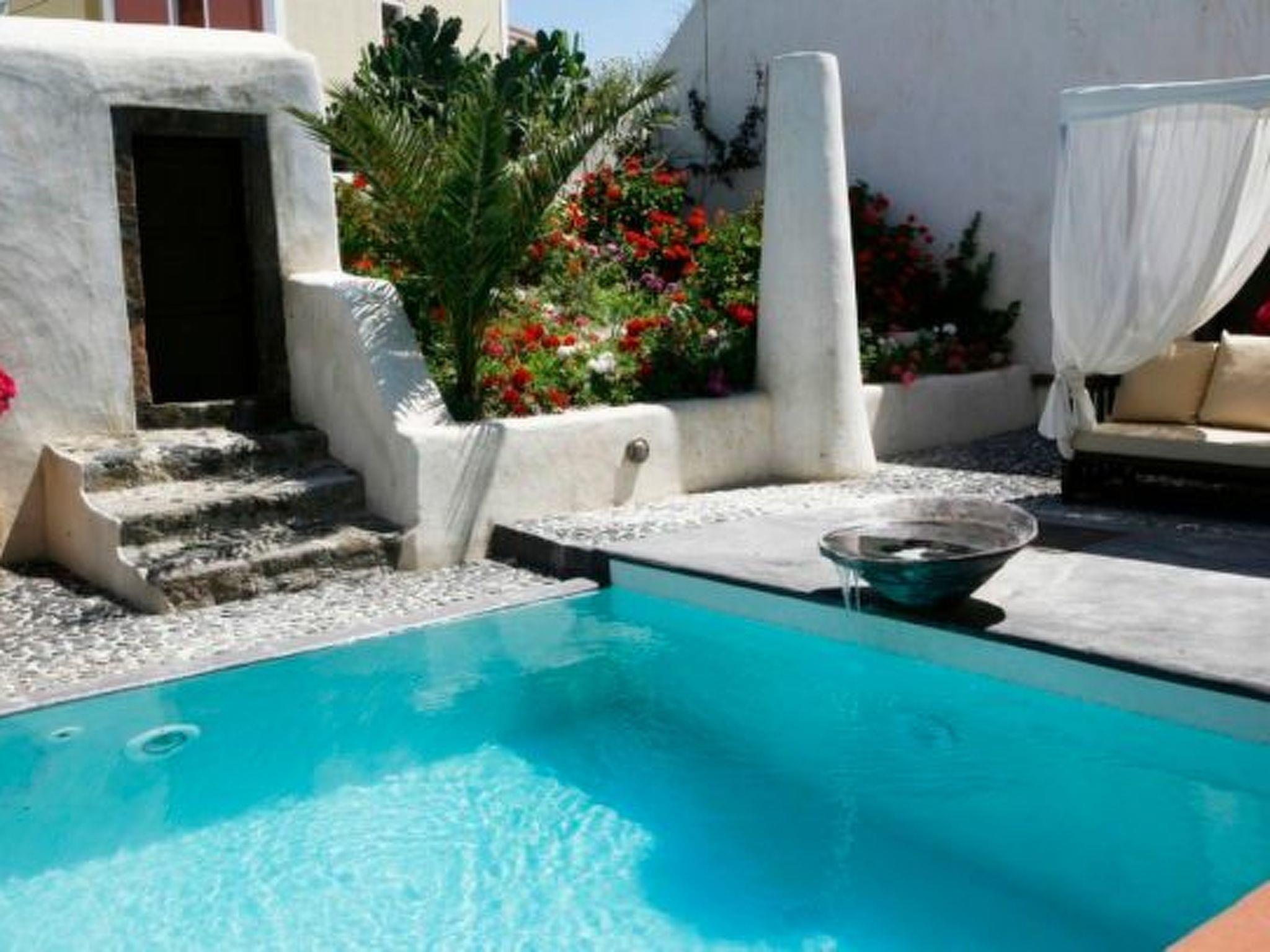The outdoor area starts by going through the imposing entrance gate made of wood into a secluded courtyard with a garden, as well as a beautiful pool in a Moroccan style. Various lounge furniture, a hammock, deckchairs and a parasol are provided for relaxing. There is a second smaller terrace area with a dining table and chairs for dining outdoors under the Santorini sky.
