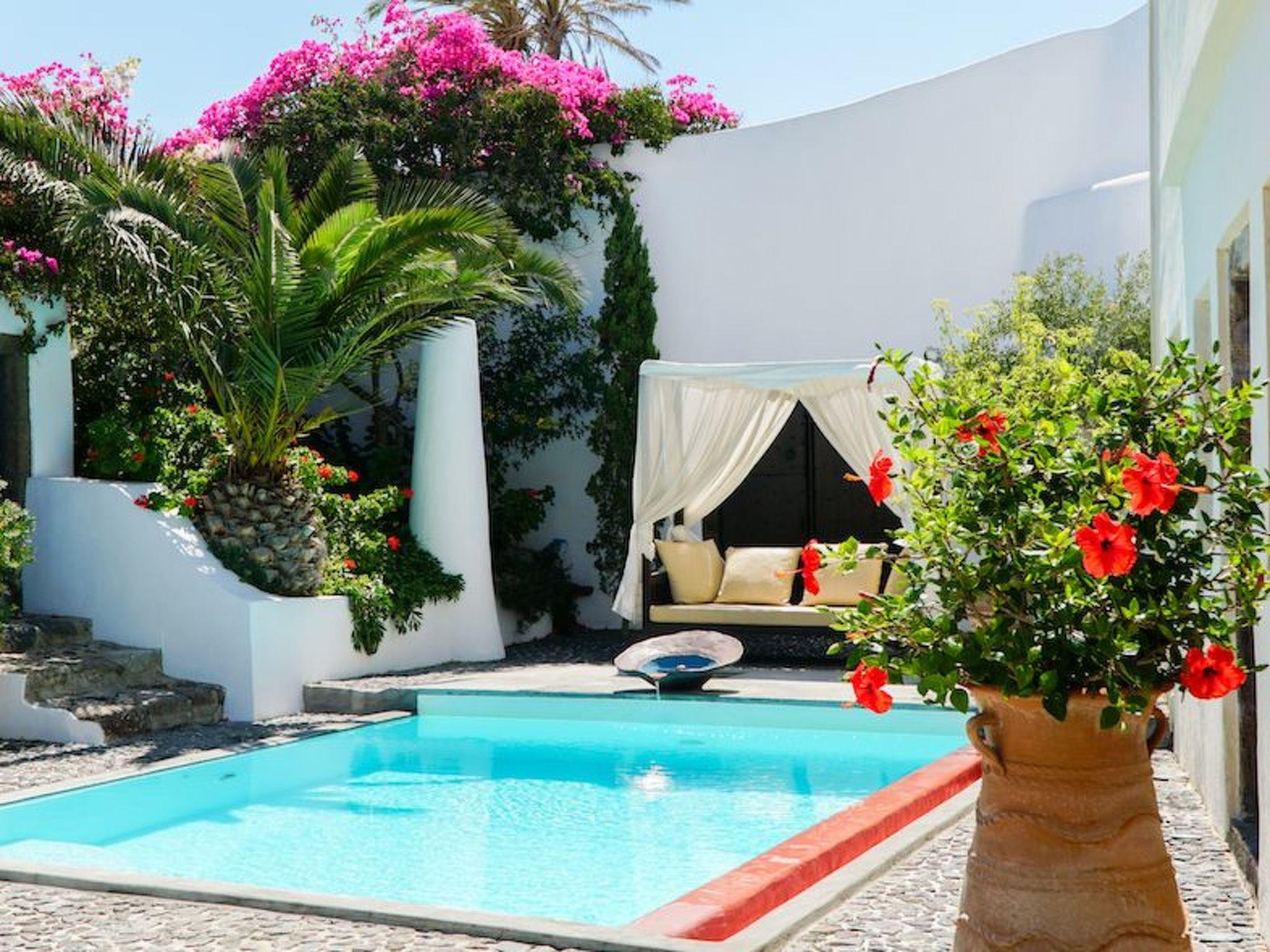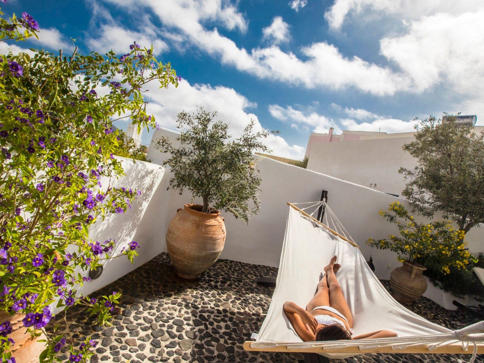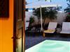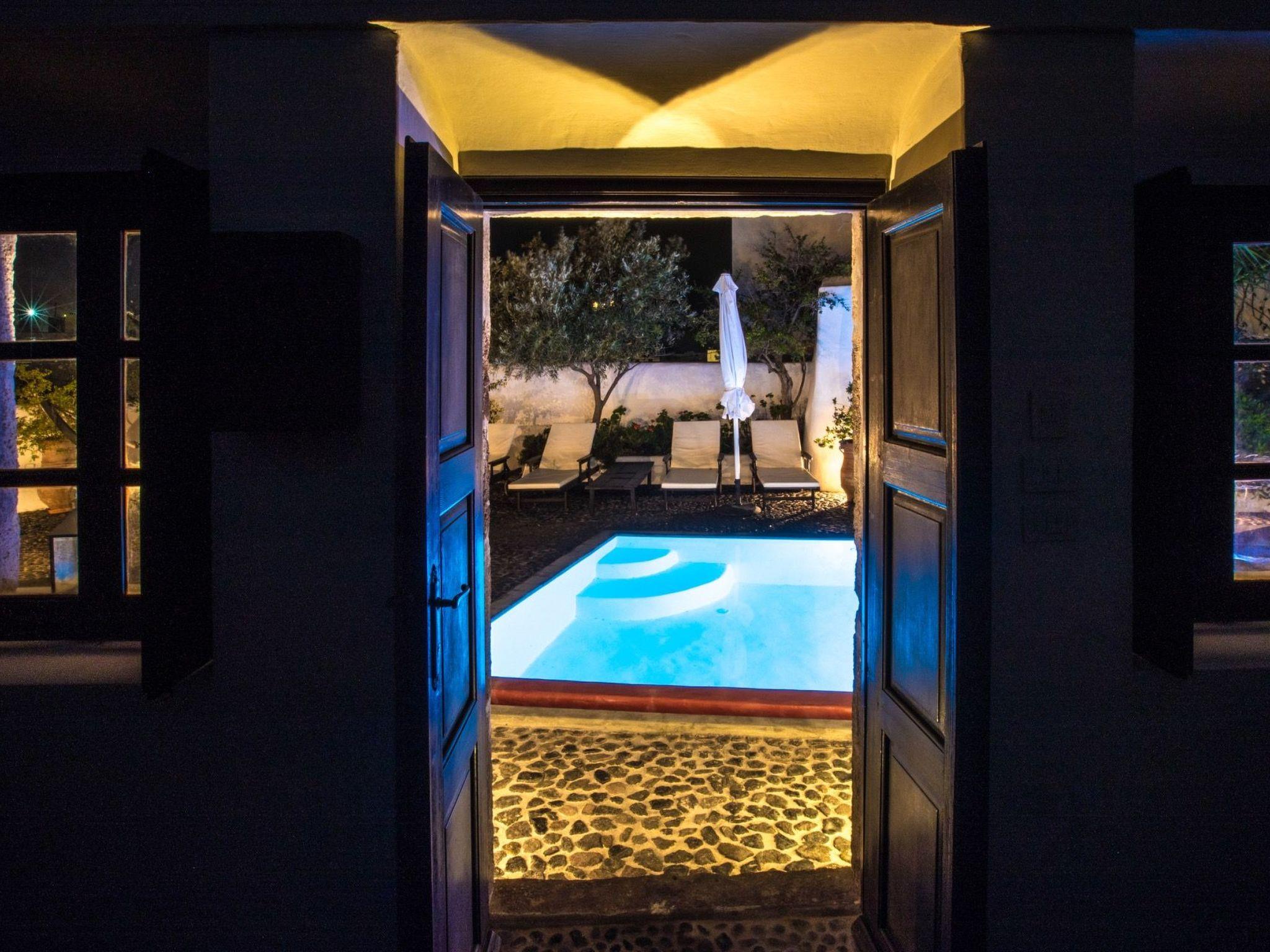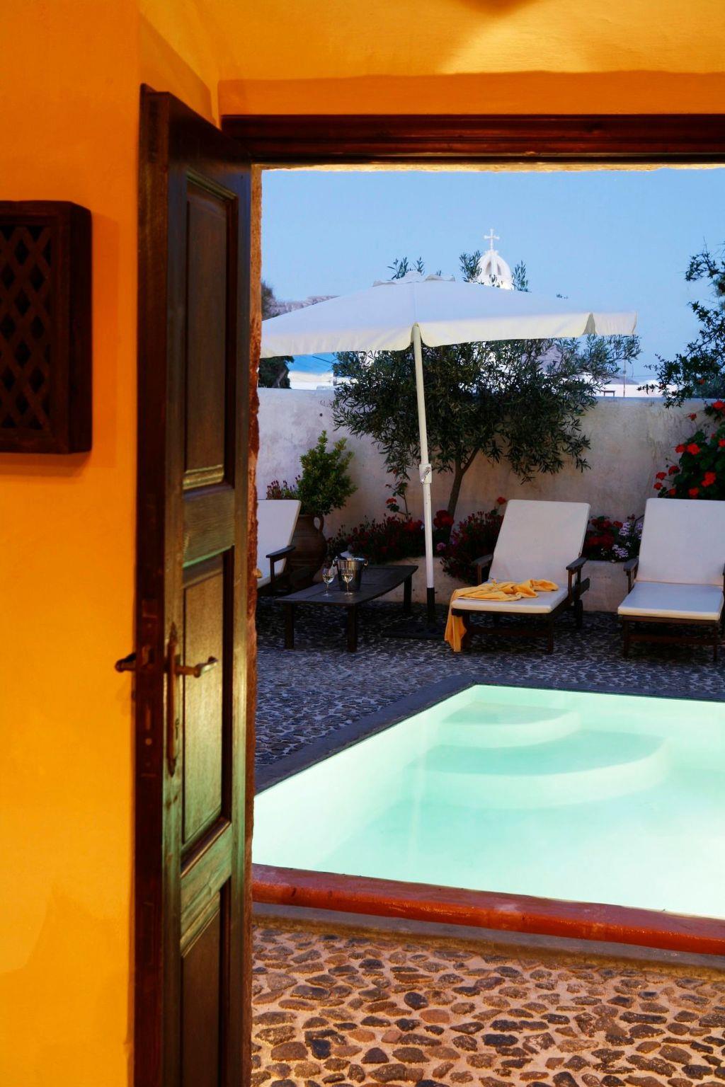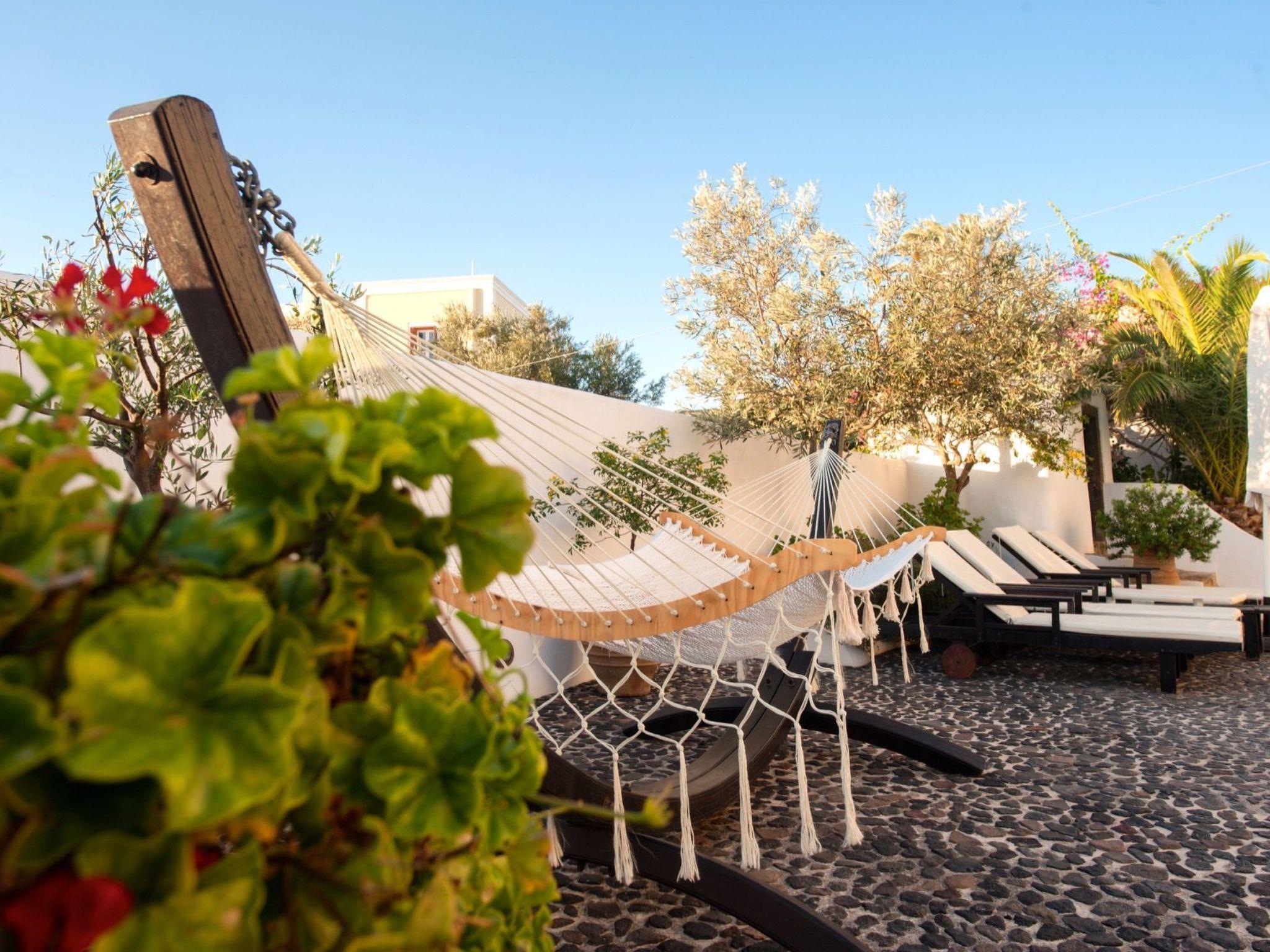 The outdoor area starts by going through the imposing entrance gate made of wood into a secluded courtyard with a garden, as well as a beautiful pool in a Moroccan style. Various lounge furniture, a hammock, deckchairs and a parasol are provided for relaxing. There is a second smaller terrace area with a dining table and chairs for dining outdoors under the Santorini sky.