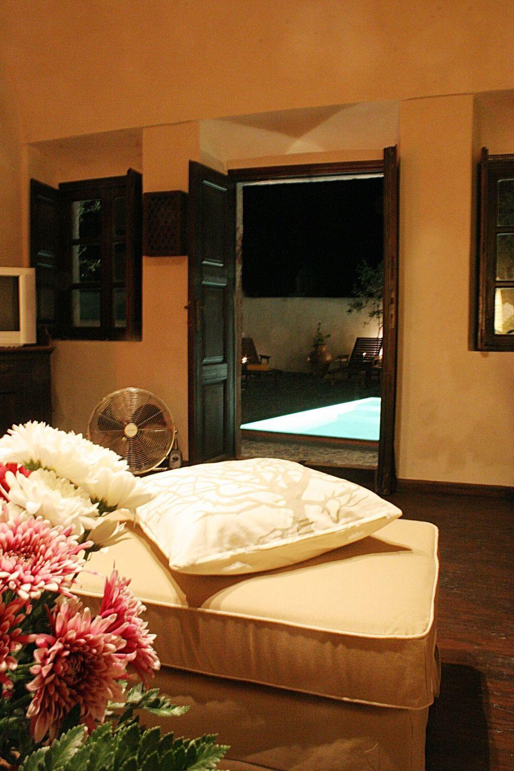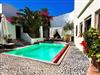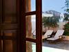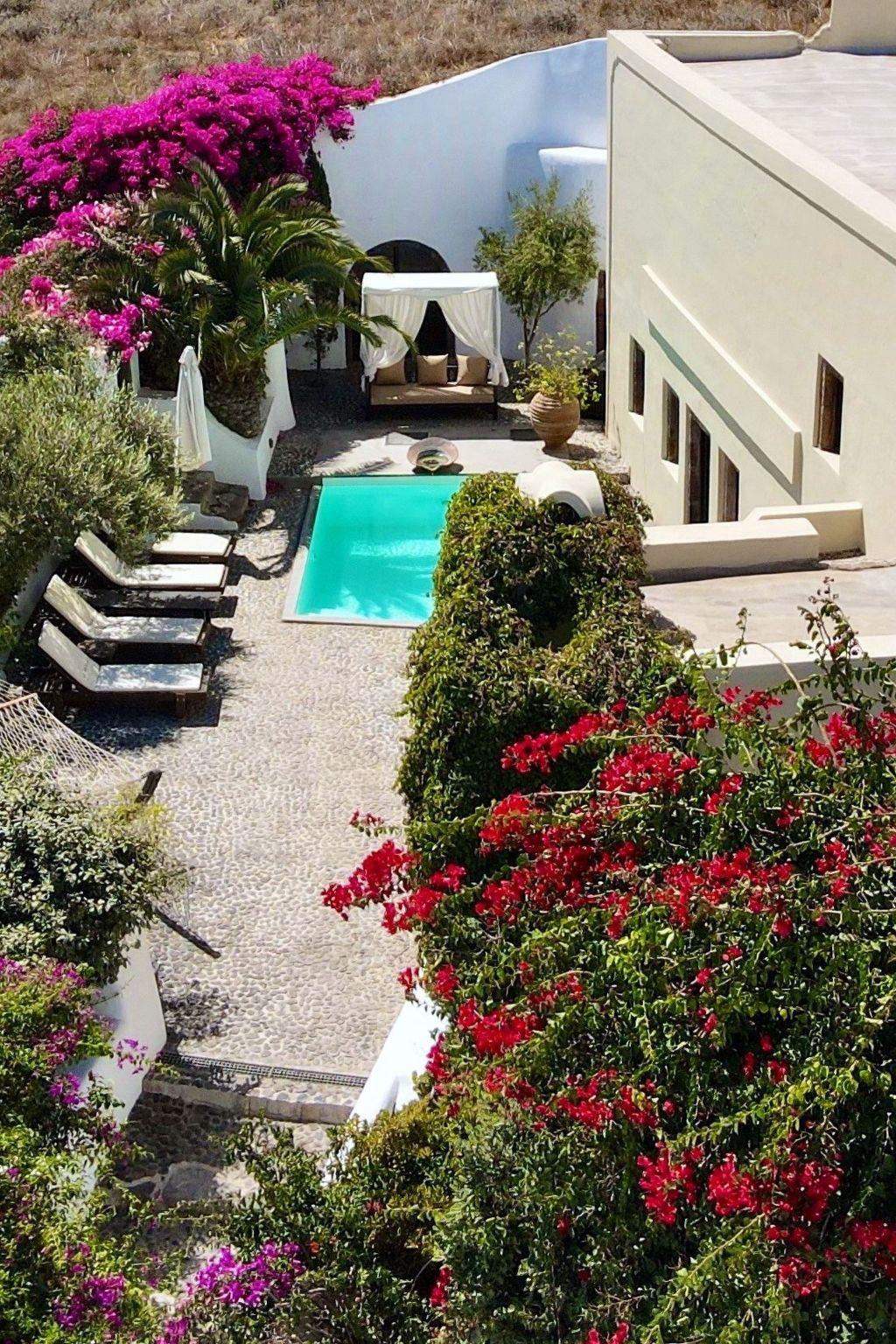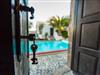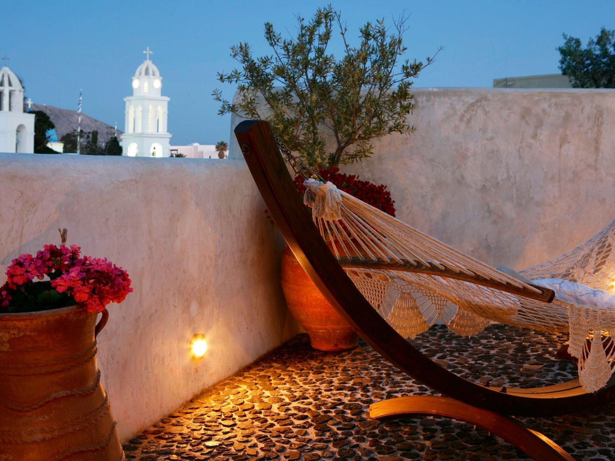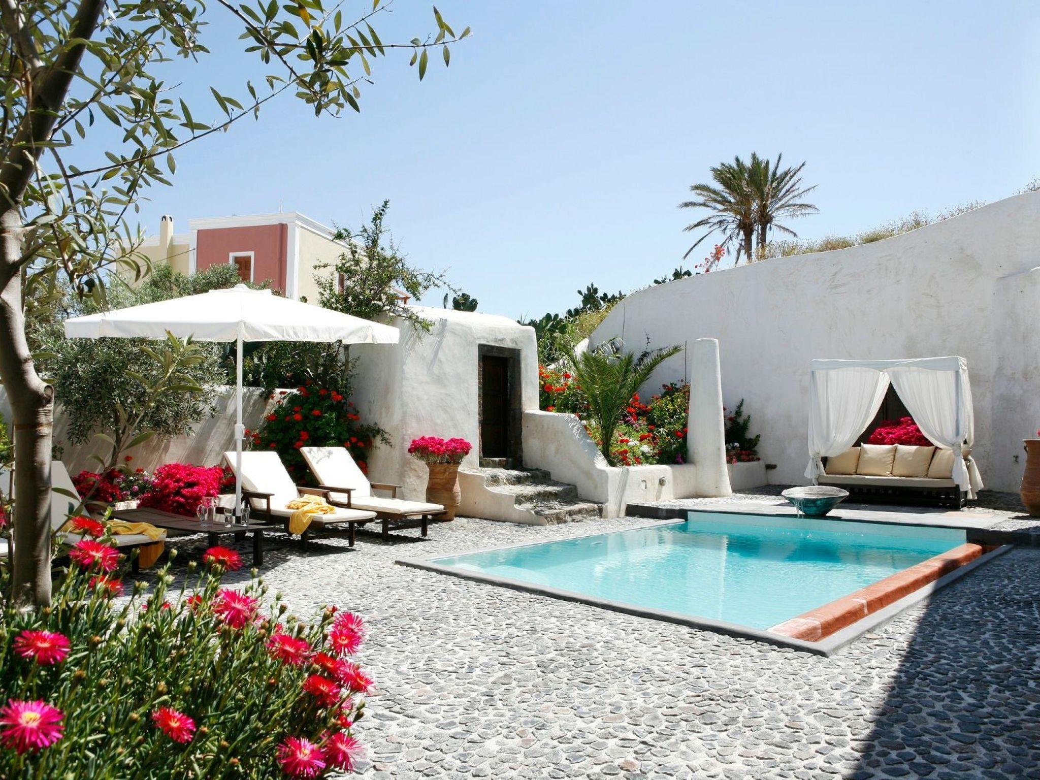 The outdoor area starts by going through the imposing entrance gate made of wood into a secluded courtyard with a garden, as well as a beautiful pool in a Moroccan style. Various lounge furniture, a hammock, deckchairs and a parasol are provided for relaxing. There is a second smaller terrace area with a dining table and chairs for dining outdoors under the Santorini sky.