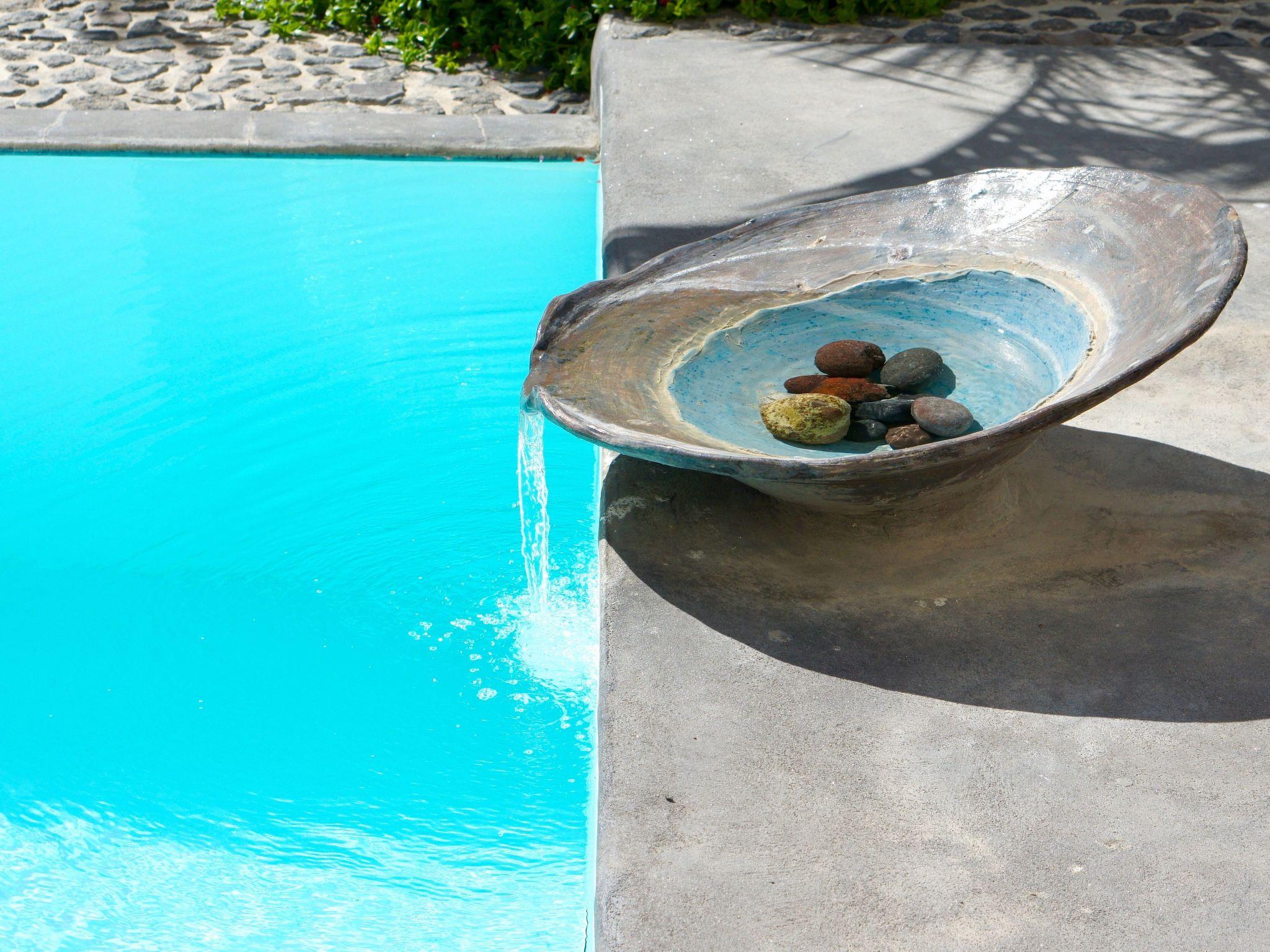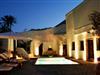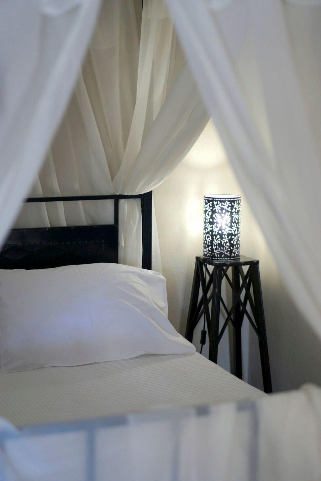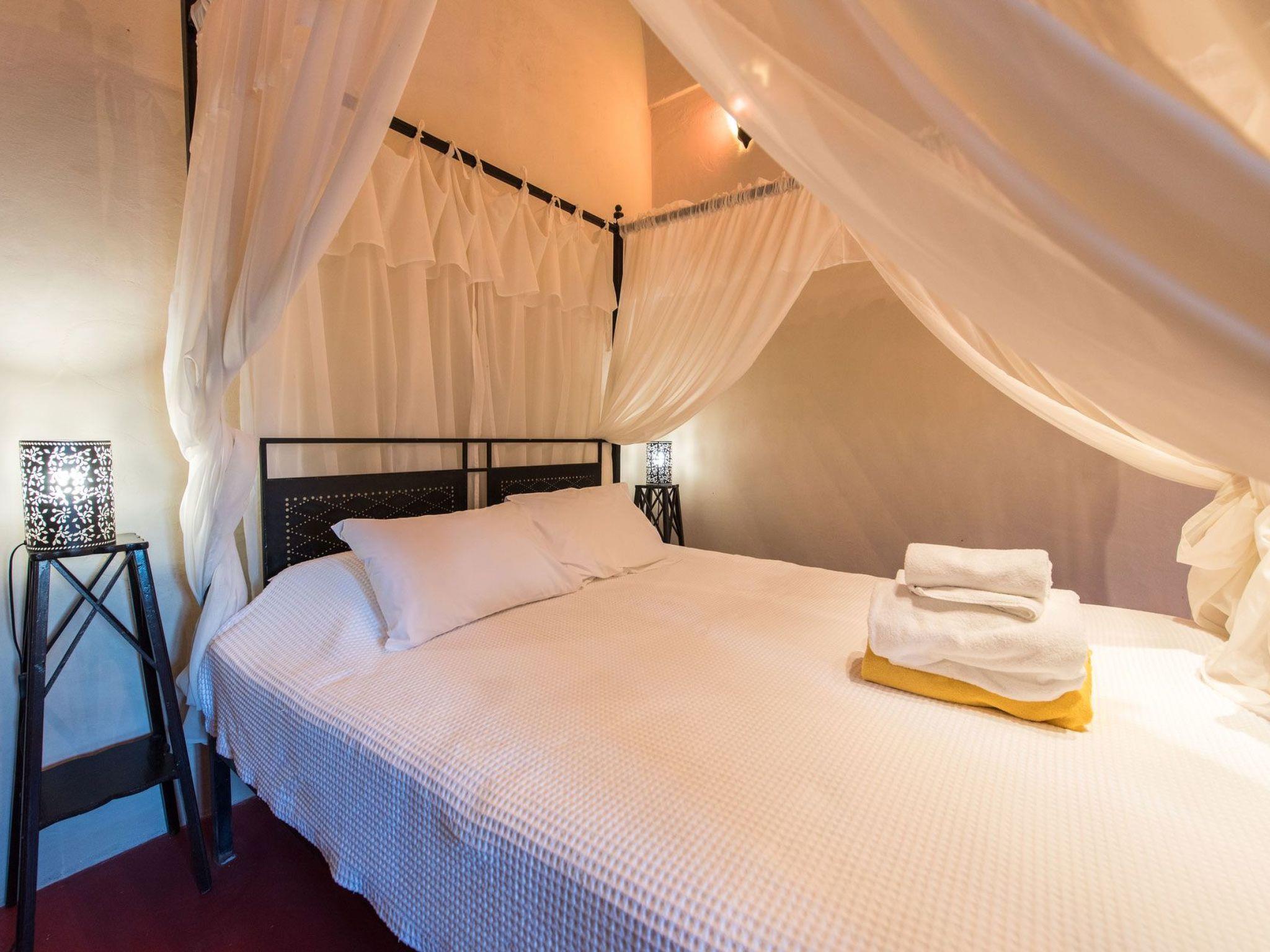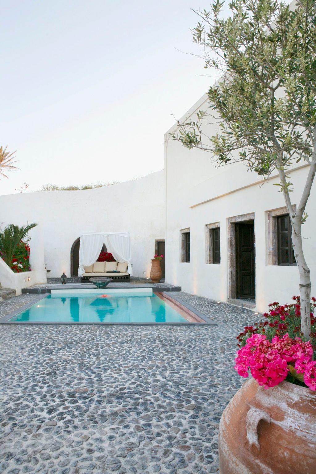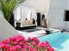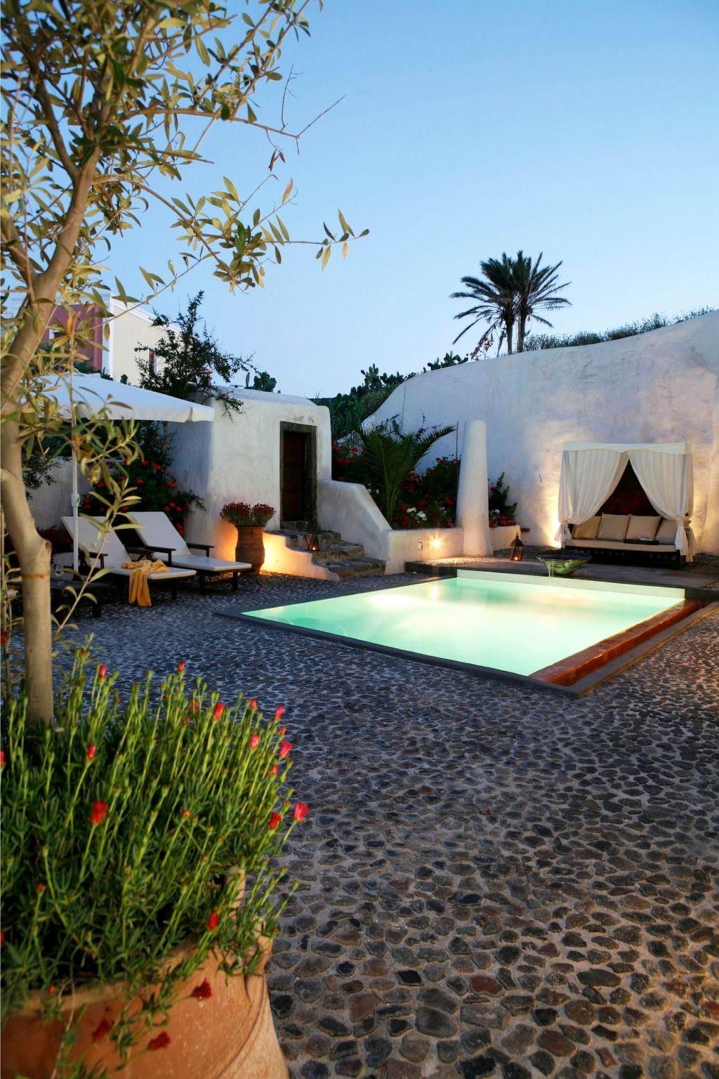The outdoor area starts by going through the imposing entrance gate made of wood into a secluded courtyard with a garden, as well as a beautiful pool in a Moroccan style. Various lounge furniture, a hammock, deckchairs and a parasol are provided for relaxing. There is a second smaller terrace area with a dining table and chairs for dining outdoors under the Santorini sky.