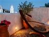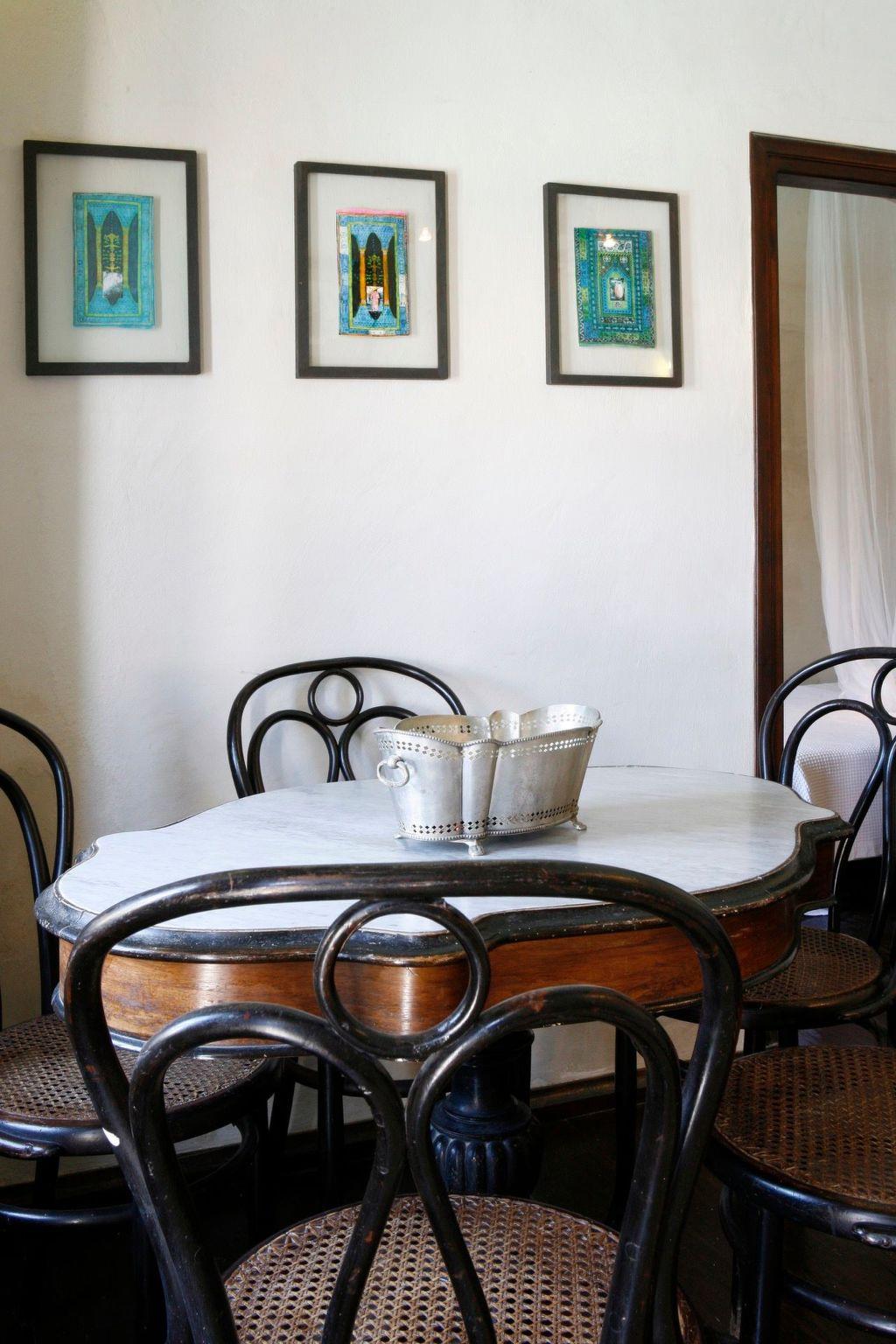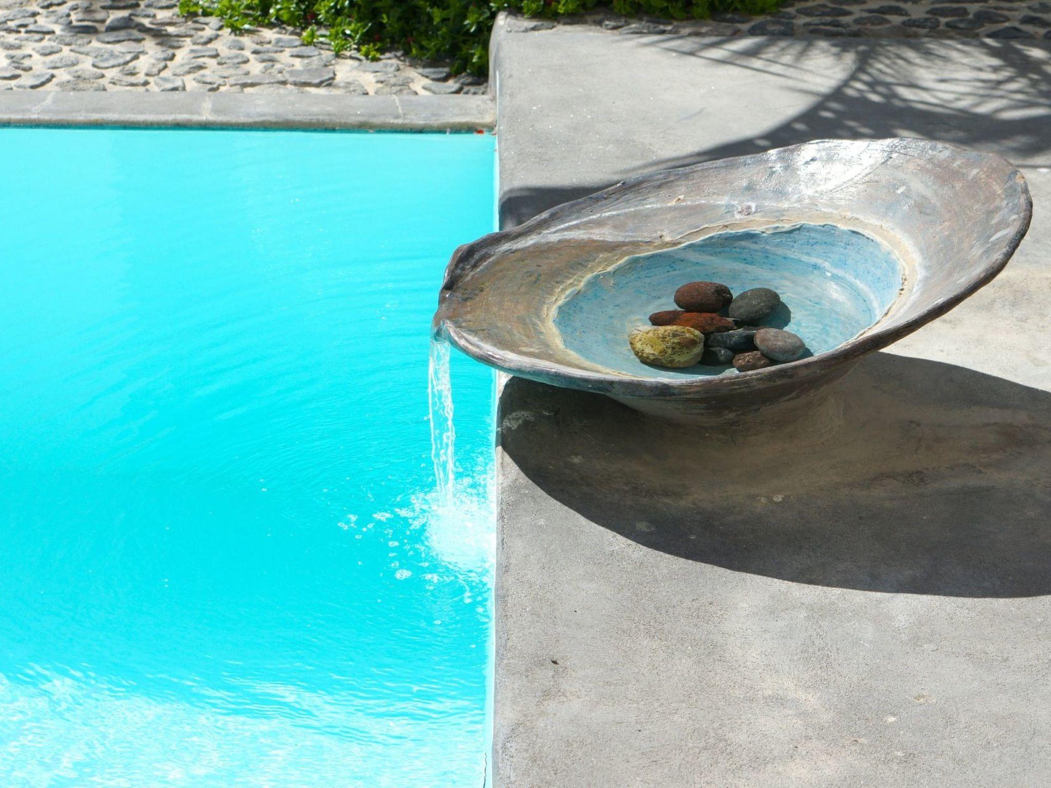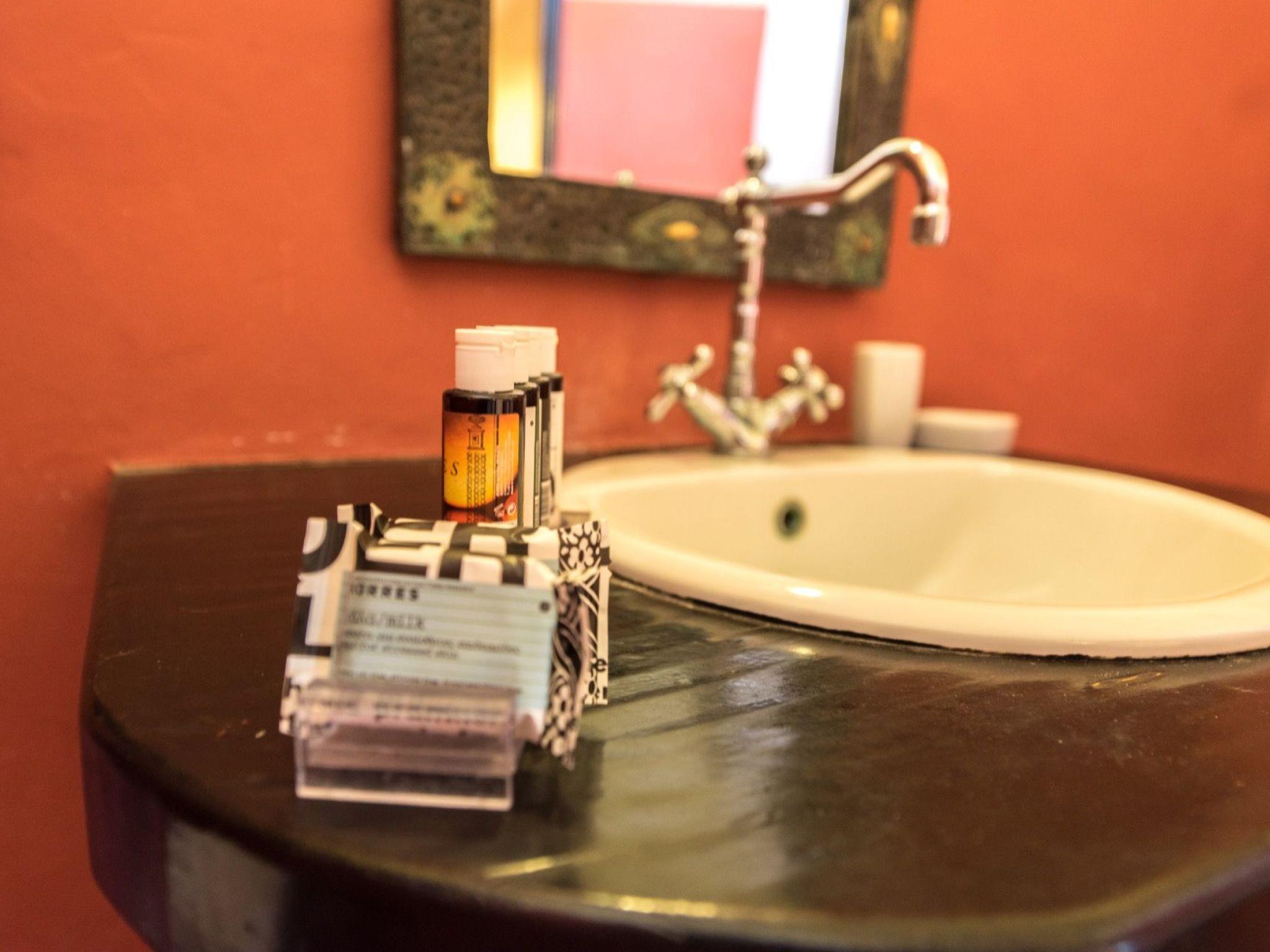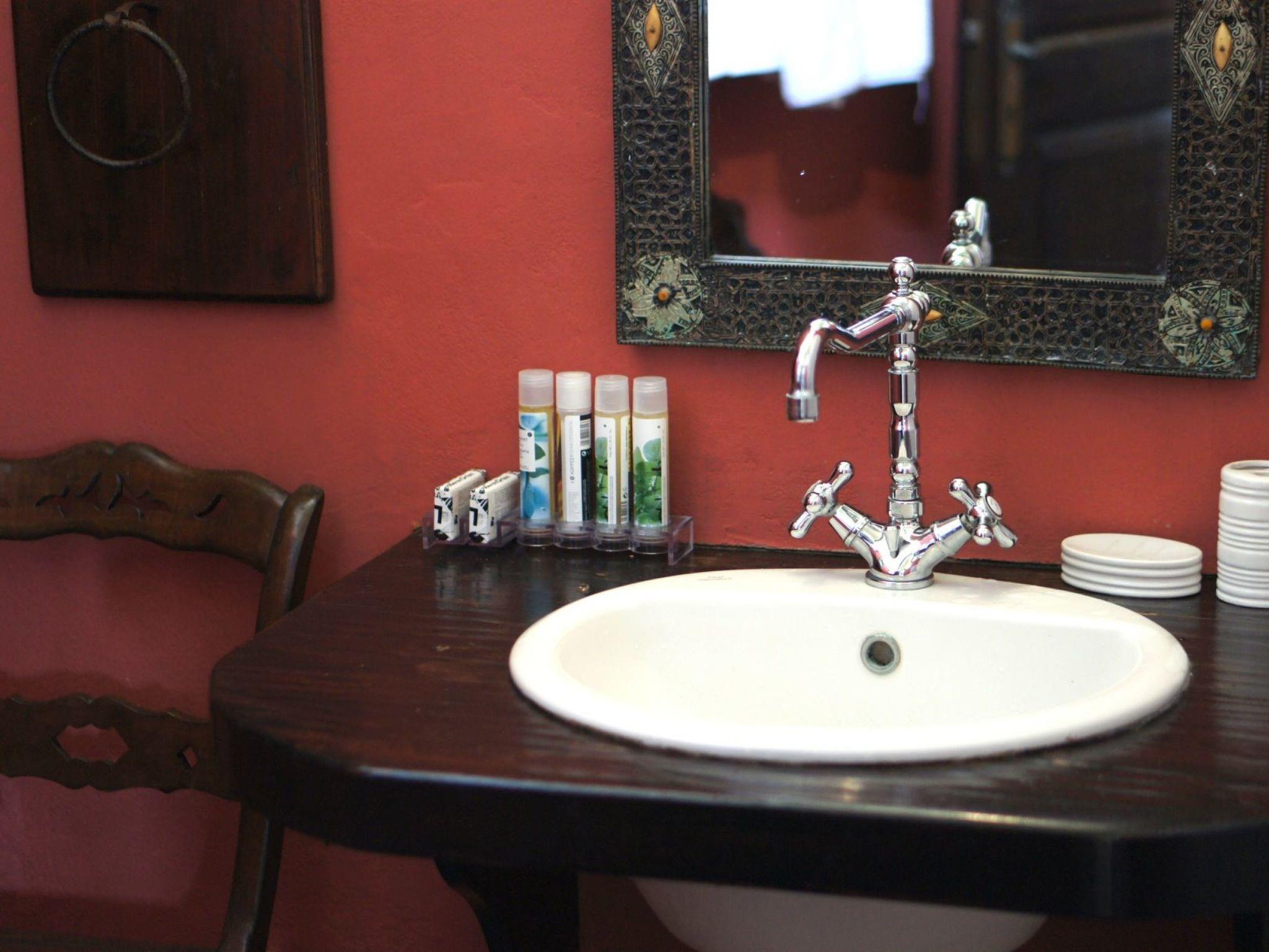 The outdoor area starts by going through the imposing entrance gate made of wood into a secluded courtyard with a garden, as well as a beautiful pool in a Moroccan style. Various lounge furniture, a hammock, deckchairs and a parasol are provided for relaxing. There is a second smaller terrace area with a dining table and chairs for dining outdoors under the Santorini sky.