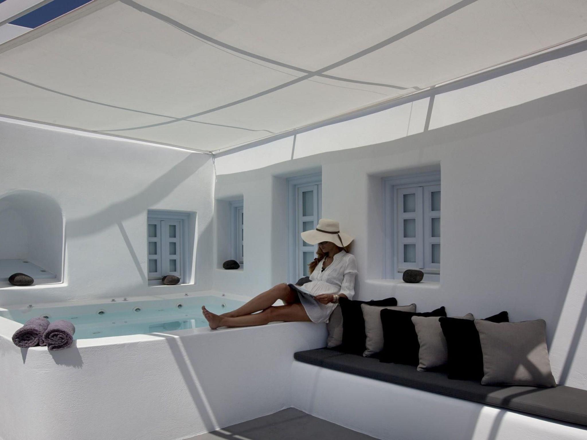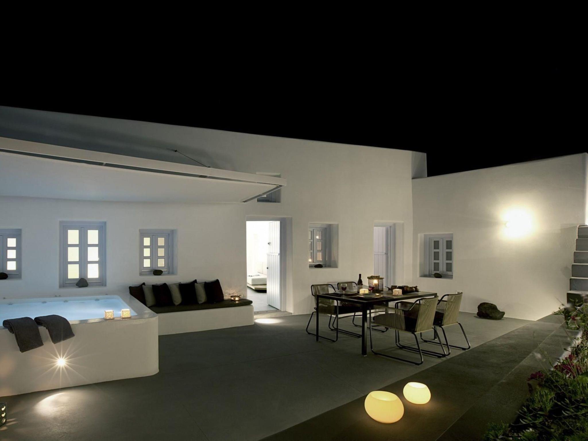 This brilliantly white, newly renovated holiday villa is in the peaceful, picturesque little village of Megalochori in the south of the rocky, sunny island of Santorini in the Greek Aegean and invites you to relax in luxurious surroundings and in absolute privacy, enjoying plenty of sun, sea and Greek hospitality.White luxury holiday villa, newly renovated in 2013, enclosed and very modern, with a private, illuminated outdoor Jacuzzi and an extensive panoramic view from the generous roof terrace