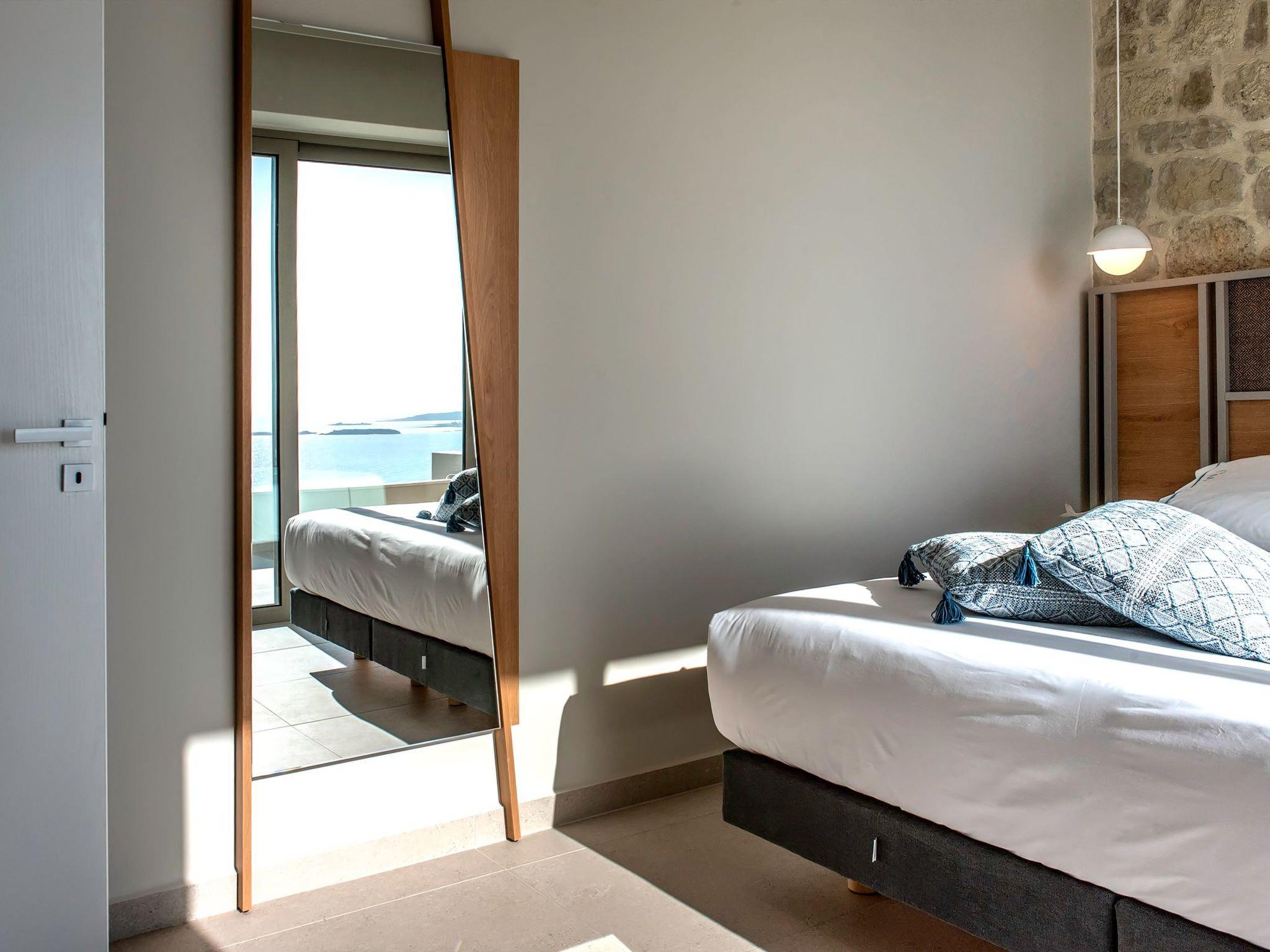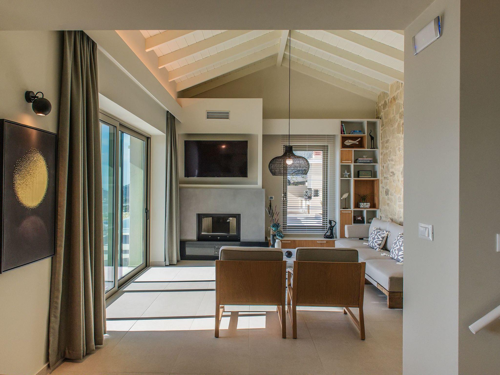 Villa Cielo is a two-story villa consisting of three bedrooms, two of them on the first floor one with twin beds with a sea view, and another double bed. The third bedroom on the ground floor has a king-size bed with a sea view. On the ground floor, there is a shared WC with a shower suitable for all the guests, and on the first floor 2 ensuite bathrooms with a shower. Luxury and modern design complete the scenery of contemporary architecture and high-quality products. Entering the villa on the ground floor you will find a spacious open area with a fully equipped contemporary kitchen that has branded appliances and facilities, making holiday cooking a most pleasurable experience. The area is completed with a dining room and a living room with a big flat-screen smart TV with satellite channels and an energy fireplace. The large windows create the illusion of transparency and provide a seamless transition between the indoor and outdoor areas.
