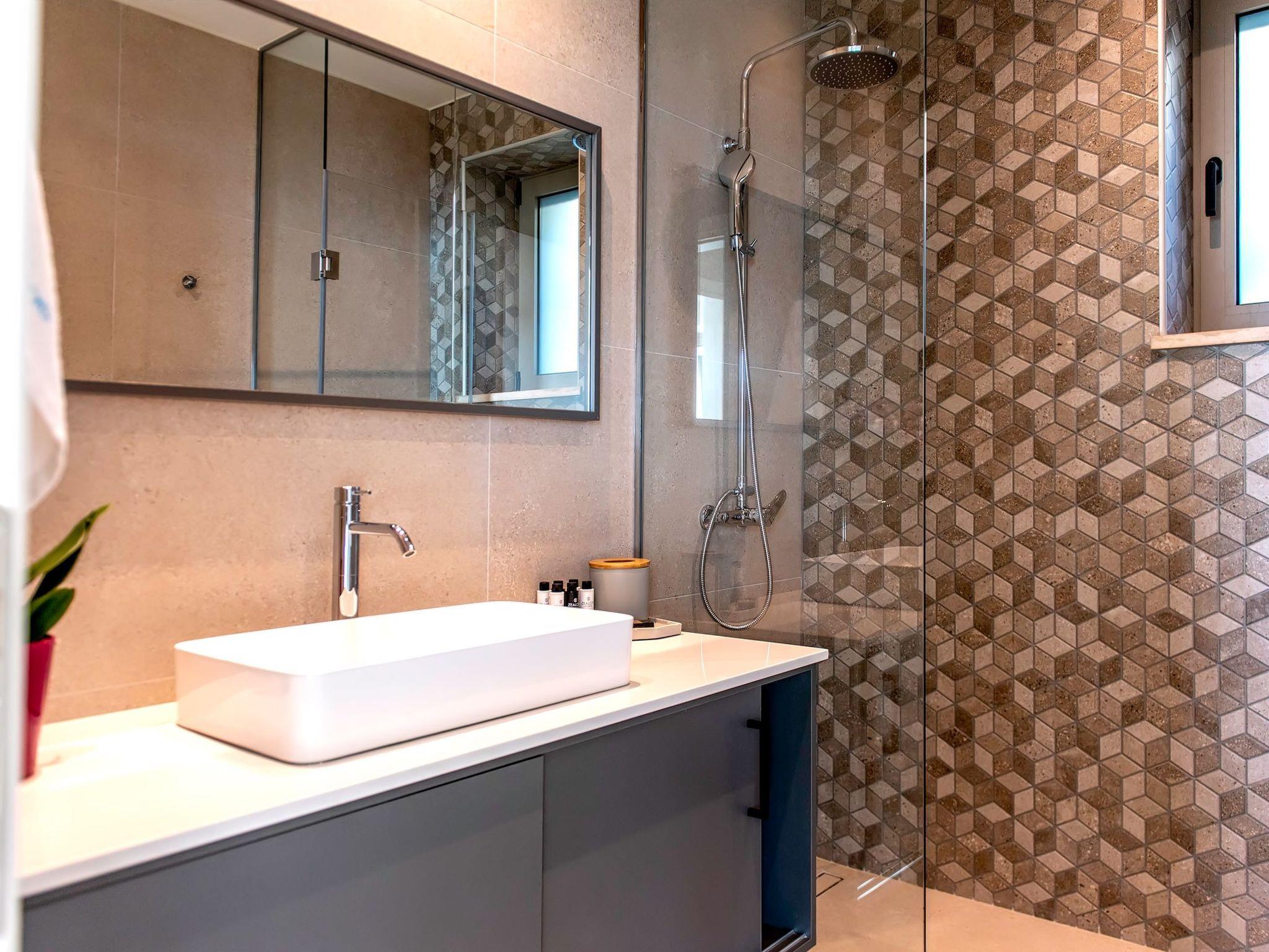 The most dominant feature of the exterior area is a swimming pool and a lounge area with sofas making it the ideal spot to relax while gazing at the gorgeous sunset. Pretty close to the pool area exists a dining table for moments of relaxation for you and your family, a BBQ, and sunbeds to enjoy the Cretan sun. Don’t forget that a secure parking area is provided outside of the villa with a charger for the electric cars.