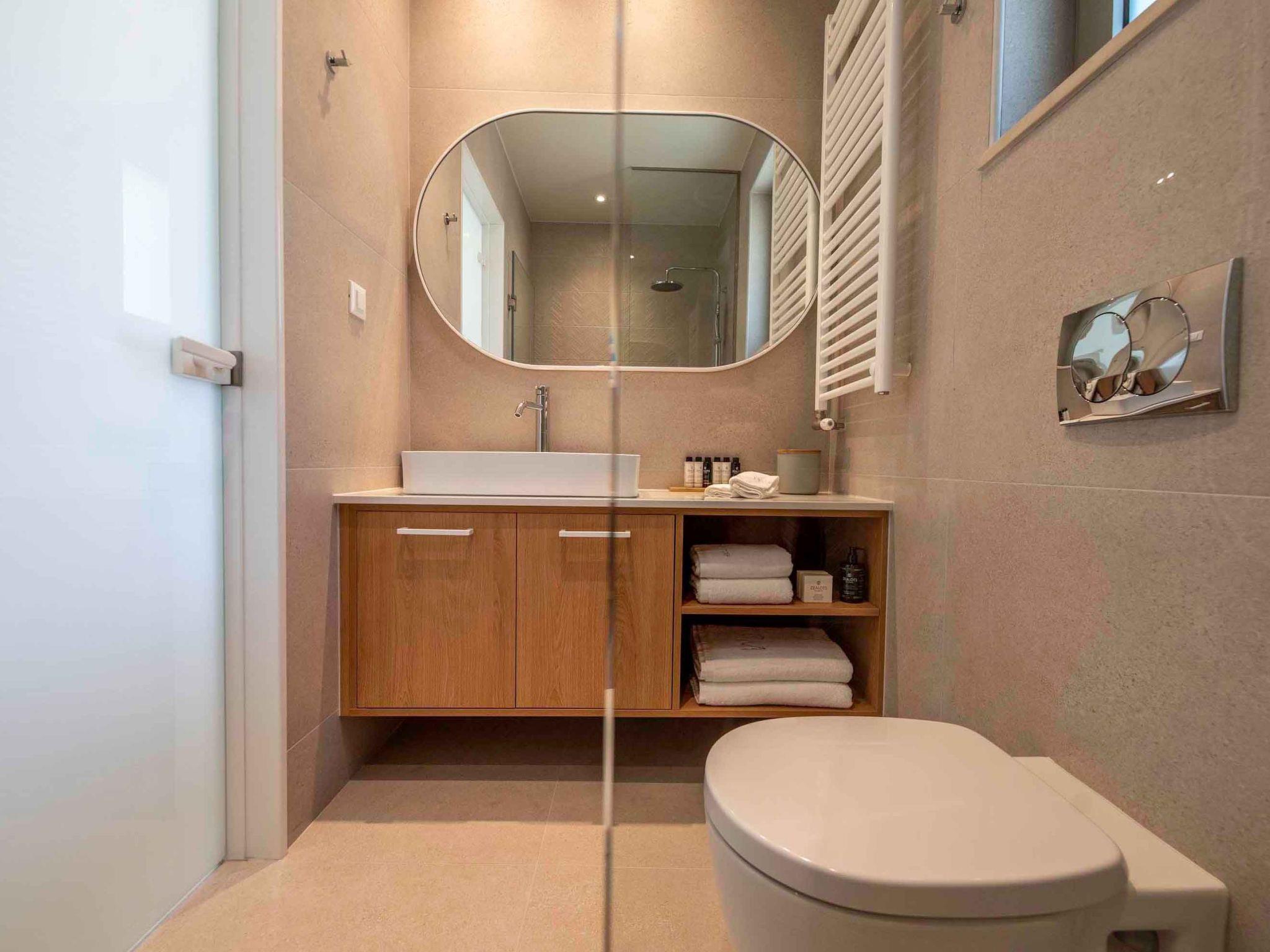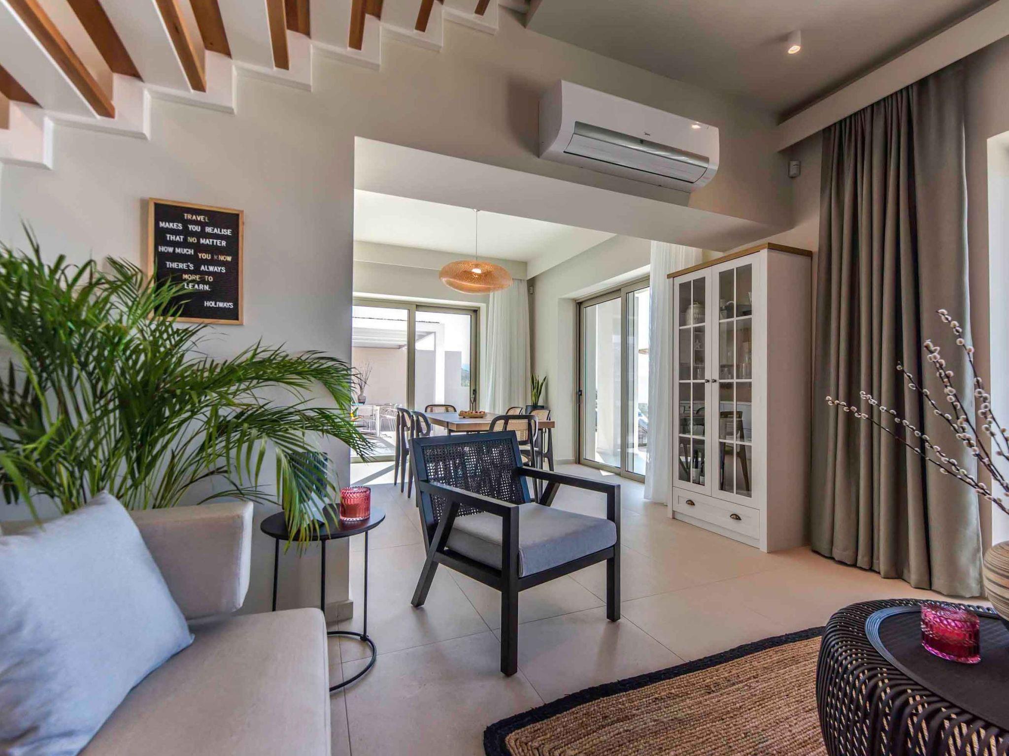 Villa Mare is a two-storey villa consisting of three bedrooms, two of which are located on the first floor with the other one. The bathrooms on the first floor are ensuite with showers. On the ground floor, there is another bedroom. Luxury and modern design complete the scenery of contemporary architecture and high-quality products. On the ground floor, there is a spacious open area with a fully equipped kitchen, a dining area, a living room with modern furnishings, and a big flat-screen smart TV with satellite channels. The large doors open onto the veranda and pool area, providing a seamless transition between the indoor and outdoor areas.