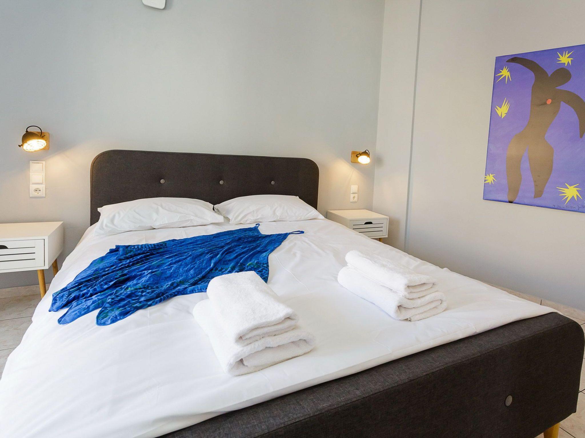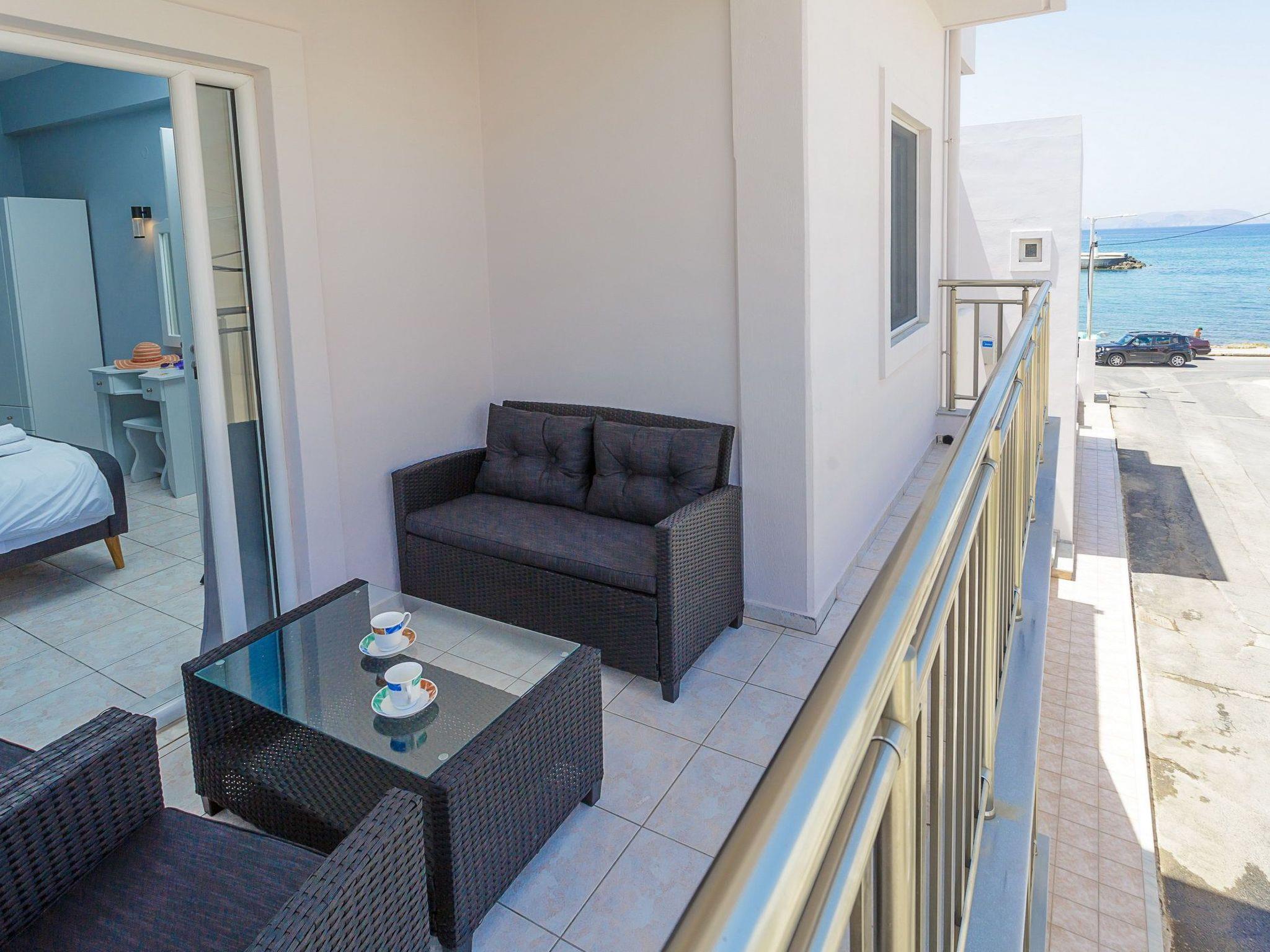 Our apartment consists of a bedroom ,a living room with kitchenette and a bathroom with shower . There is an open plan living room with a sofa which can be converted to a double bed, a dining area and a kitchenette. The bedroom offers a double bed (160*200) and AC. There is also a spacious balcony with outdoor lounge furniture. it is the perfect space to unwind and enjoy the sea view with a glass of local wine.