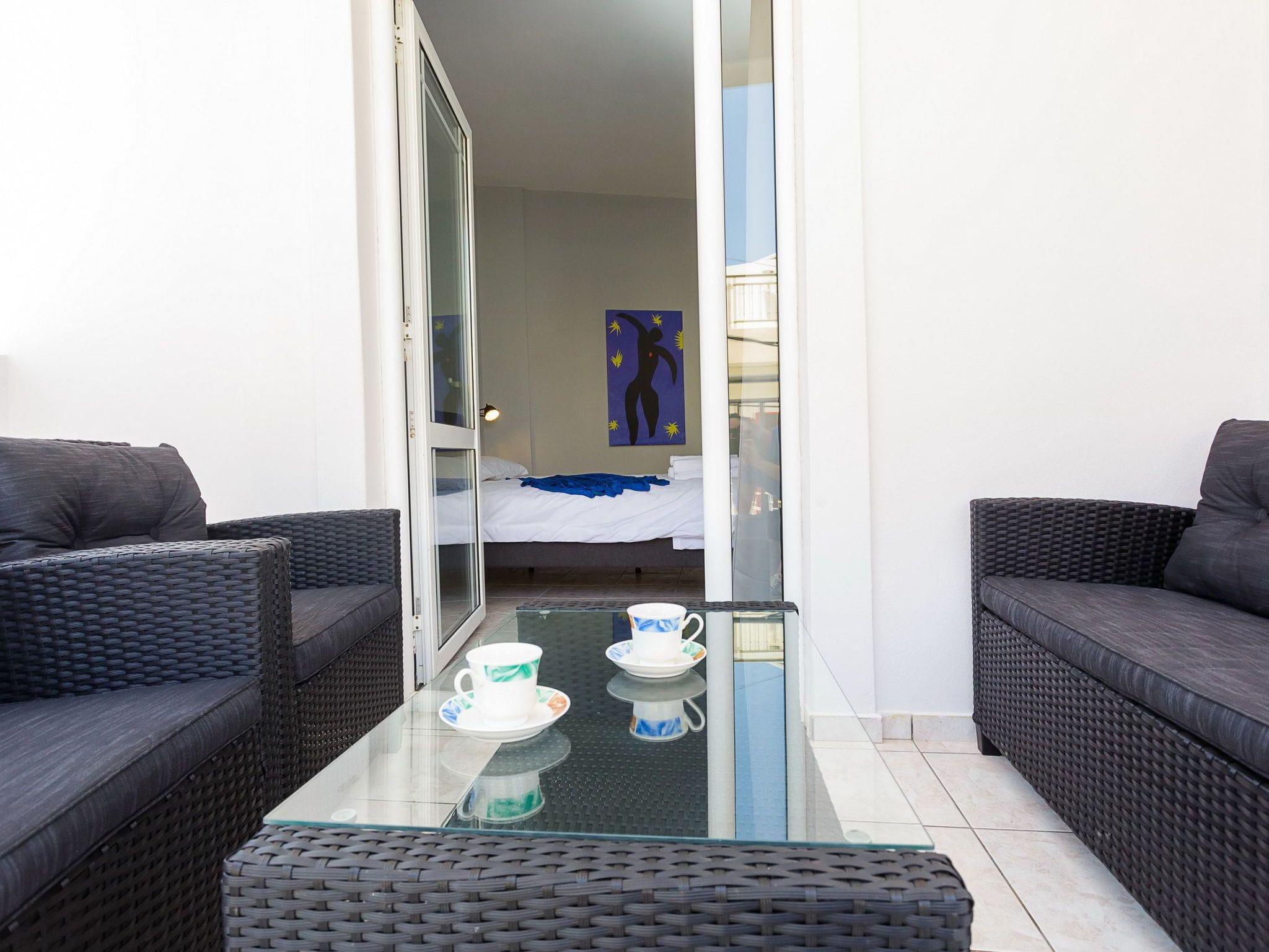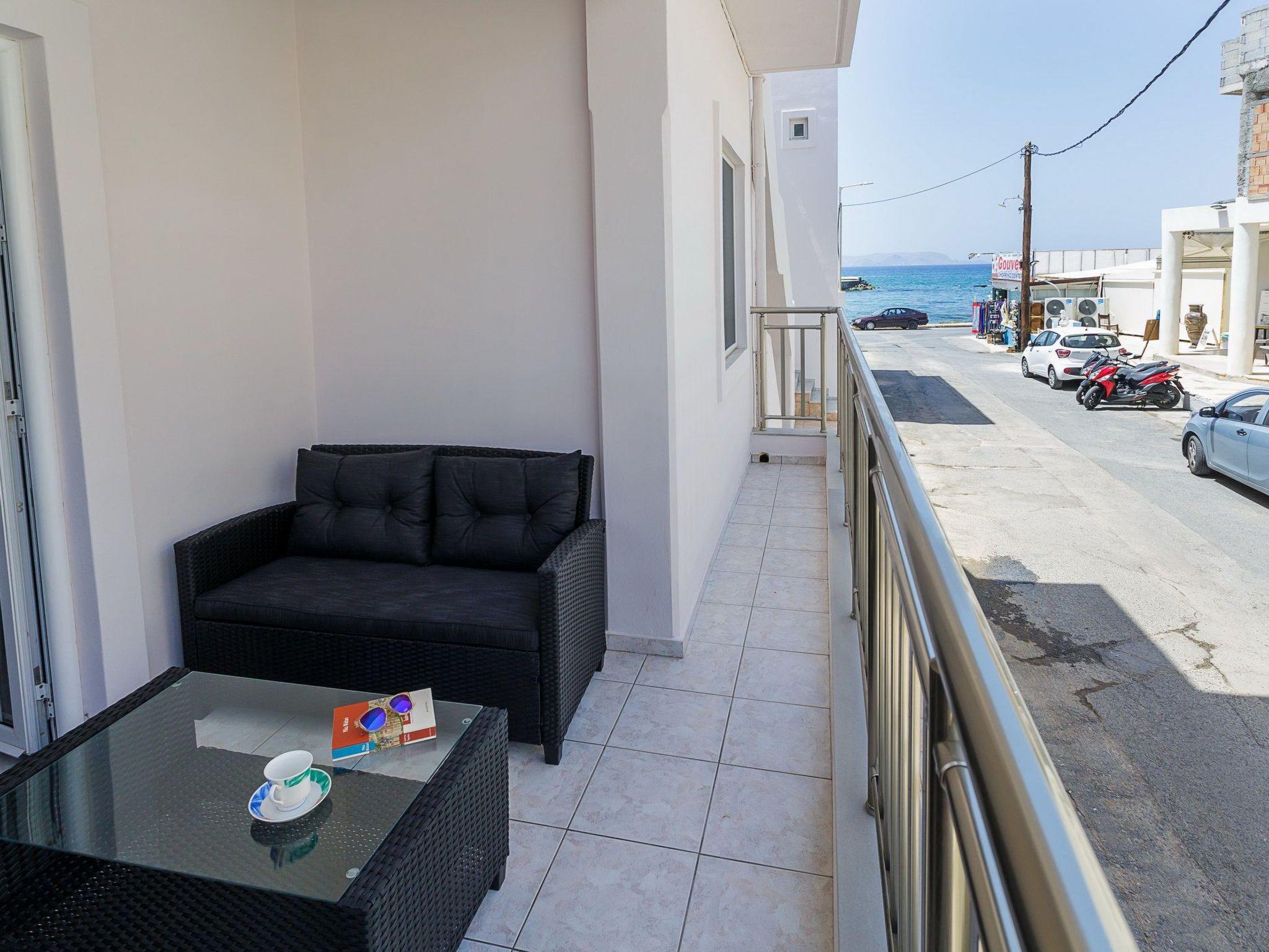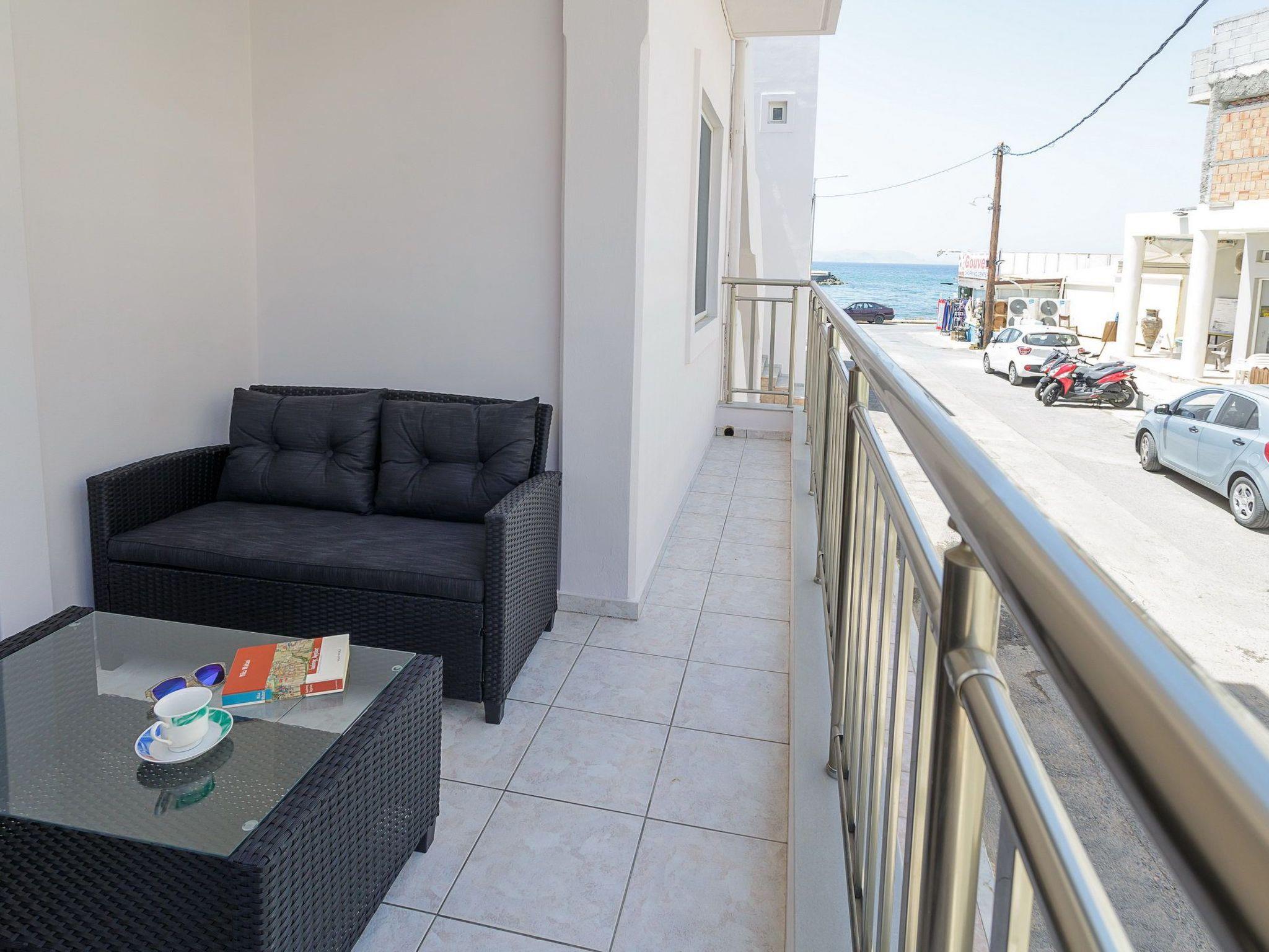 Our apartment consists of a bedroom ,a living room with kitchenette and a bathroom with shower . There is an open plan living room with a sofa which can be converted to a double bed, a dining area and a kitchenette. The bedroom offers a double bed (160*200) and AC. There is also a spacious balcony with outdoor lounge furniture. it is the perfect space to unwind and enjoy the sea view with a glass of local wine.
