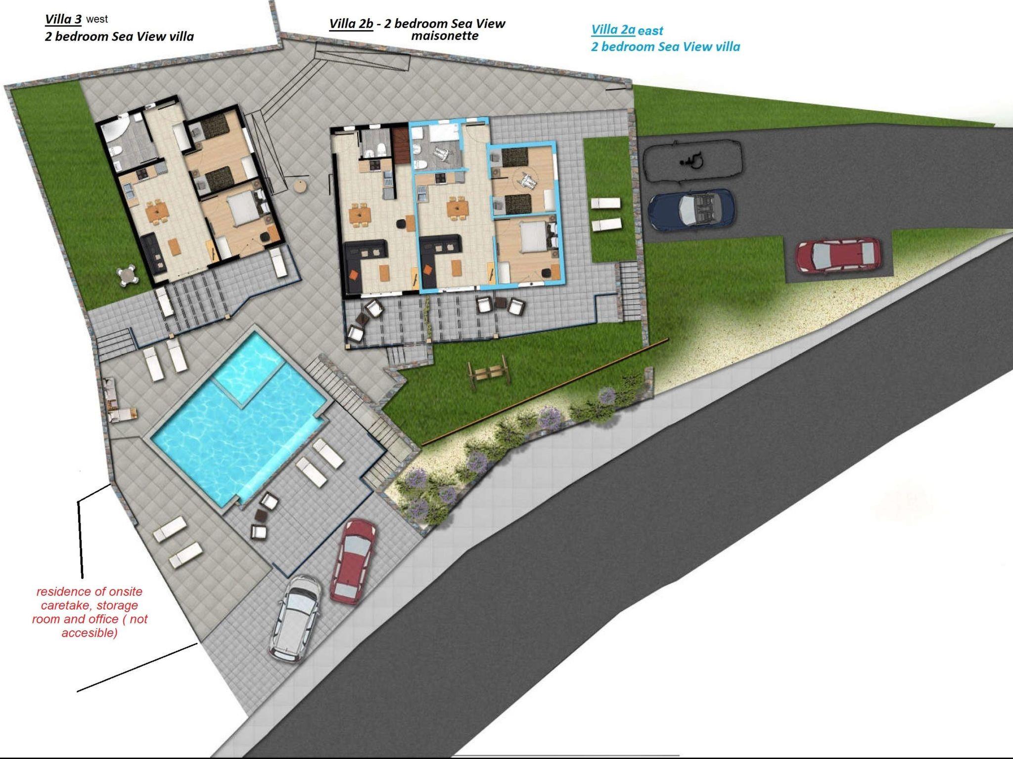 All villas have view to sea and pool.