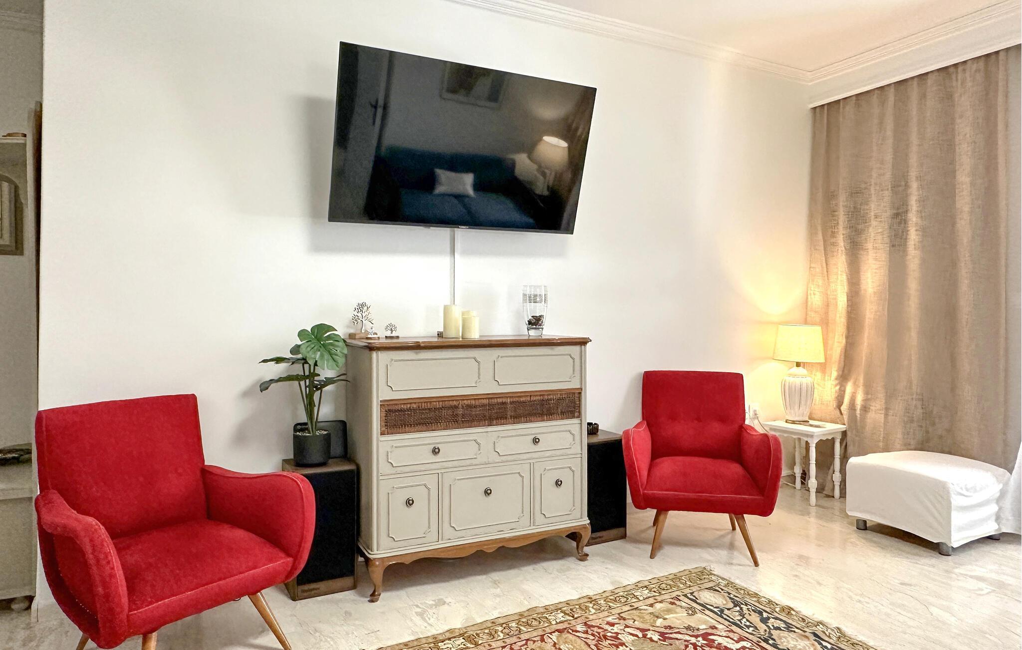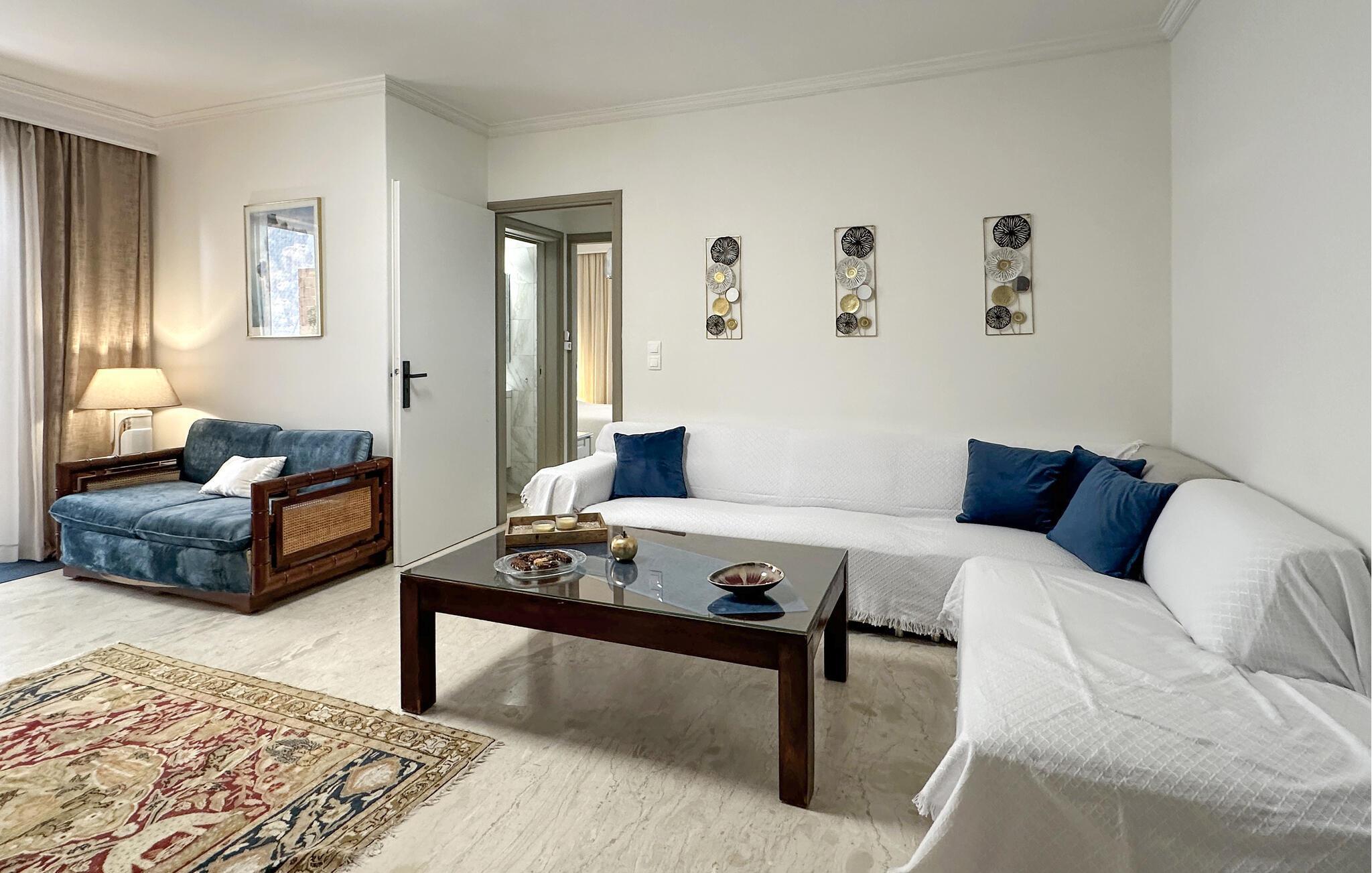 Denne komfortable ferielejlighed er ideel til en familie eller to vennepar, der ønsker at tilbringe afslappende dage i Grækenland. Den smagfulde indretning skaber en hyggelig atmosfære, mens det veludstyrede spisekøkken lægger op til at lave mad sammen. Den store stue lægger op til at blive hængende, hvad enten det er til et spil kort eller en underholdende film. Nyd afslappende stunder på altanen, der er beskyttet mod udsigt og sol, og afslut dagen med en forfriskende frappe. Den centrale beliggenhed gør lejligheden til det perfekte udgangspunkt for jeres udforskninger.